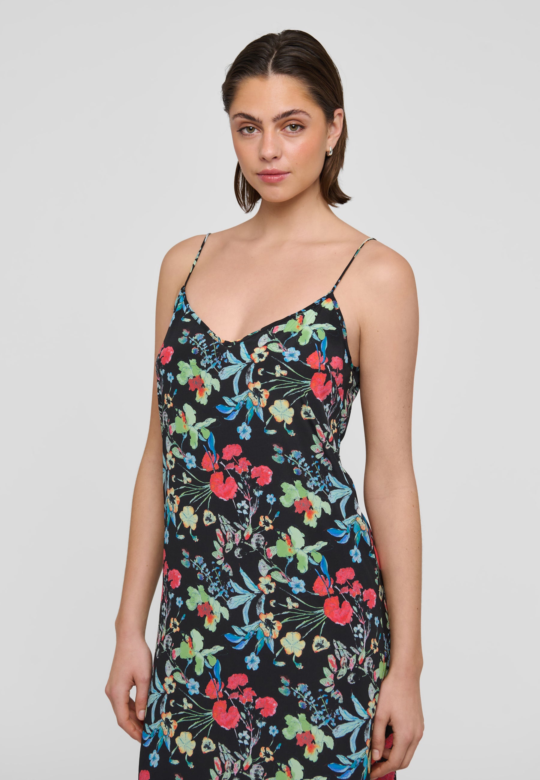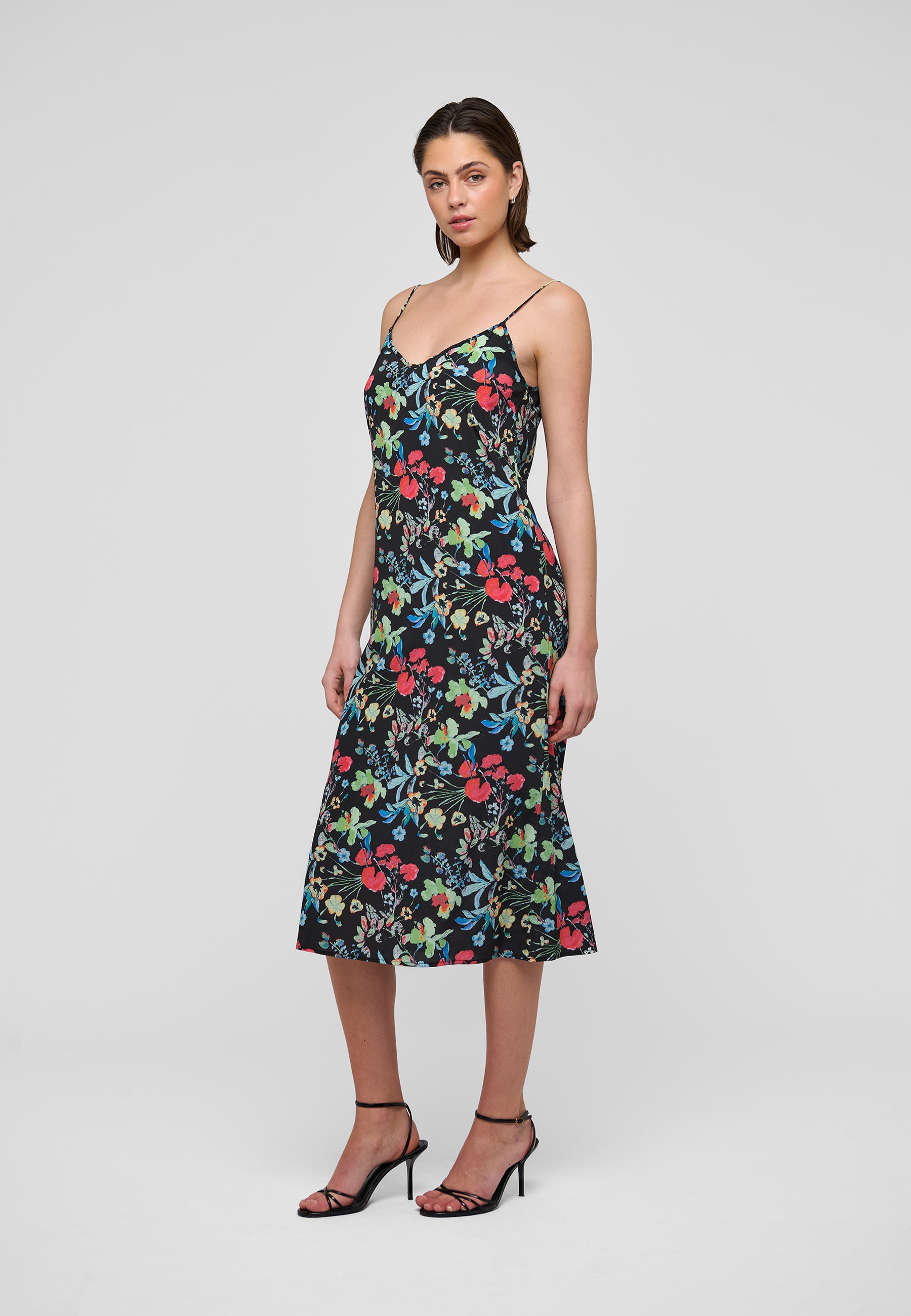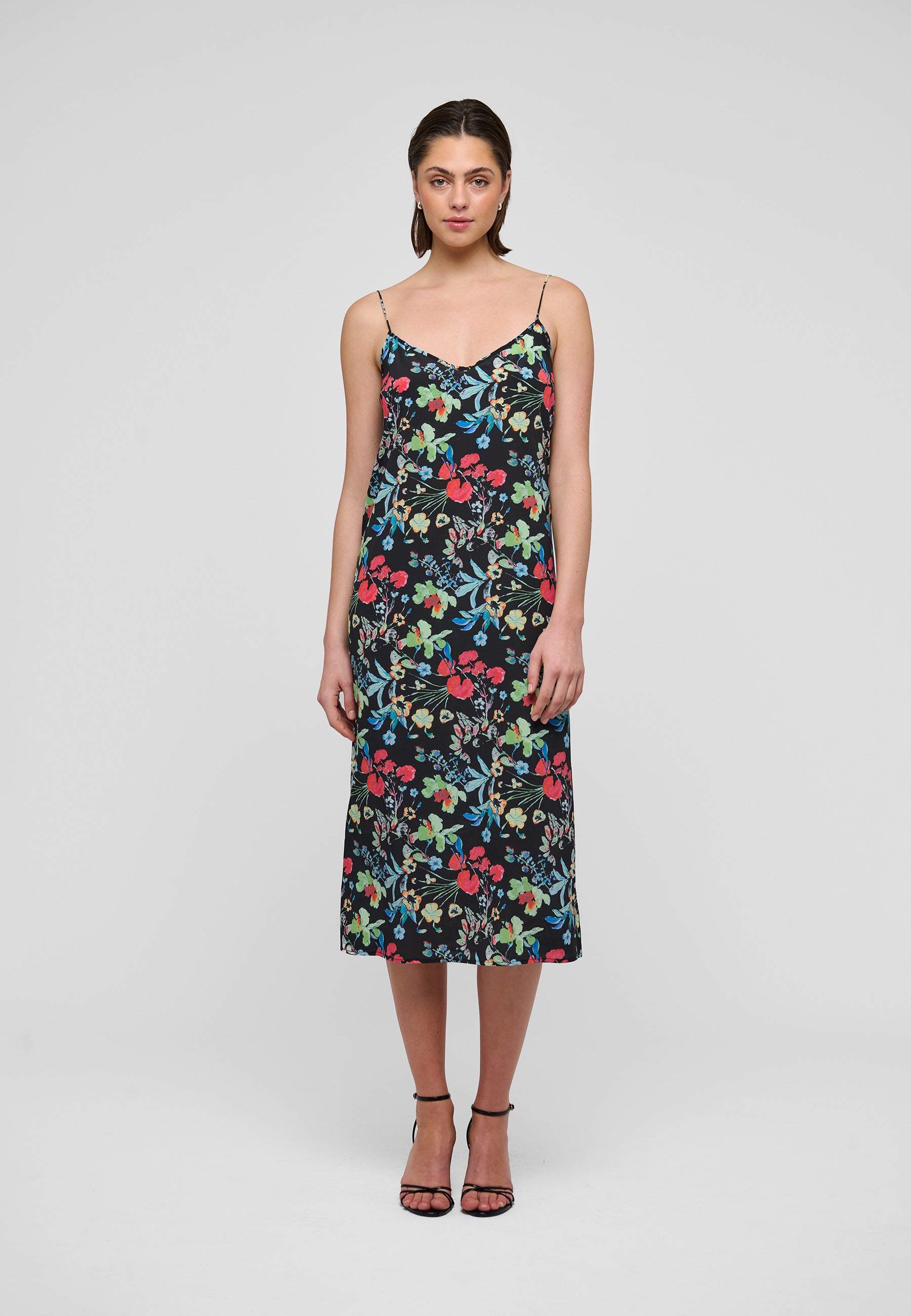 Enkel silkekjole i et enkelt, smalt A-shape snit. kjolen har en blød v-udskæring og tynde stropper og er i et farvestrålende print med akvarel malede blomster på sort bund