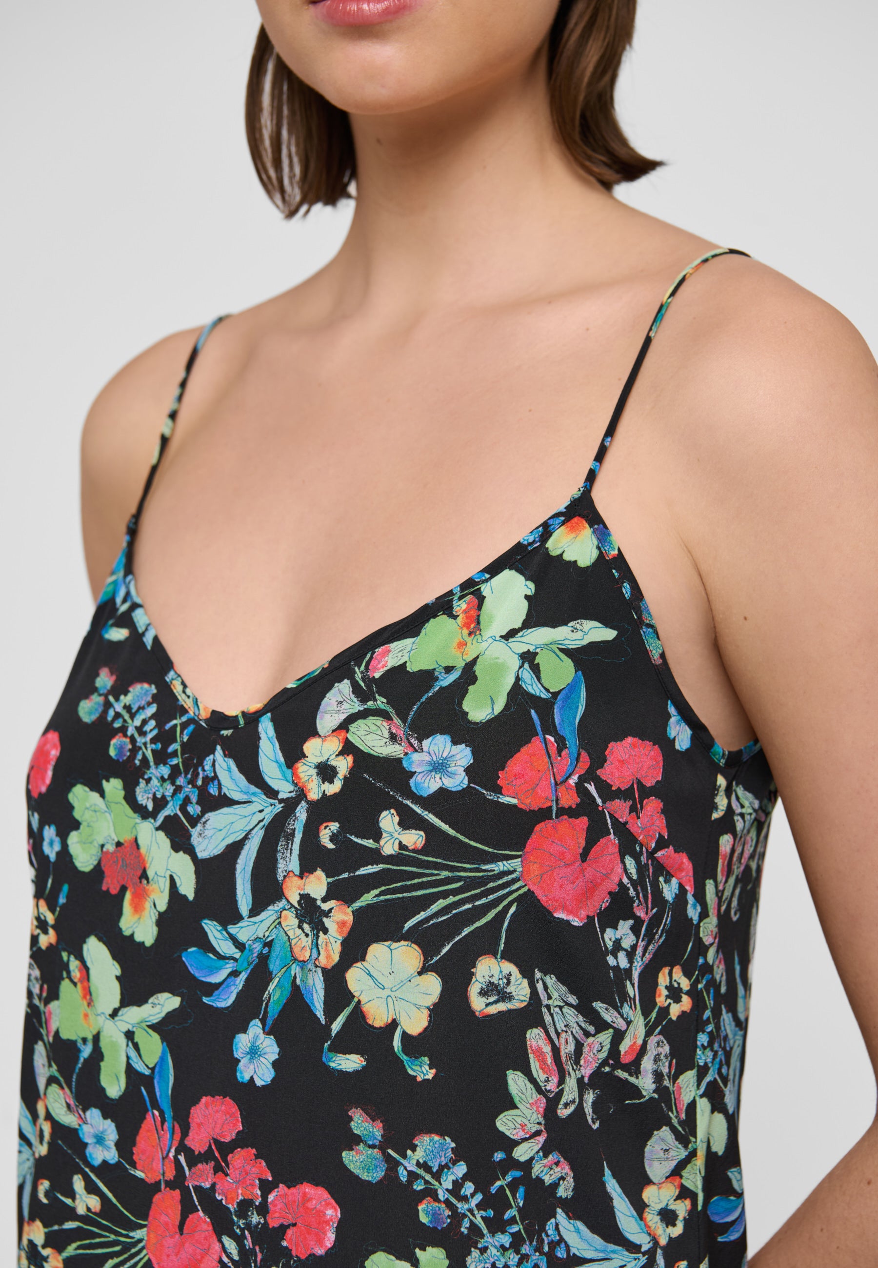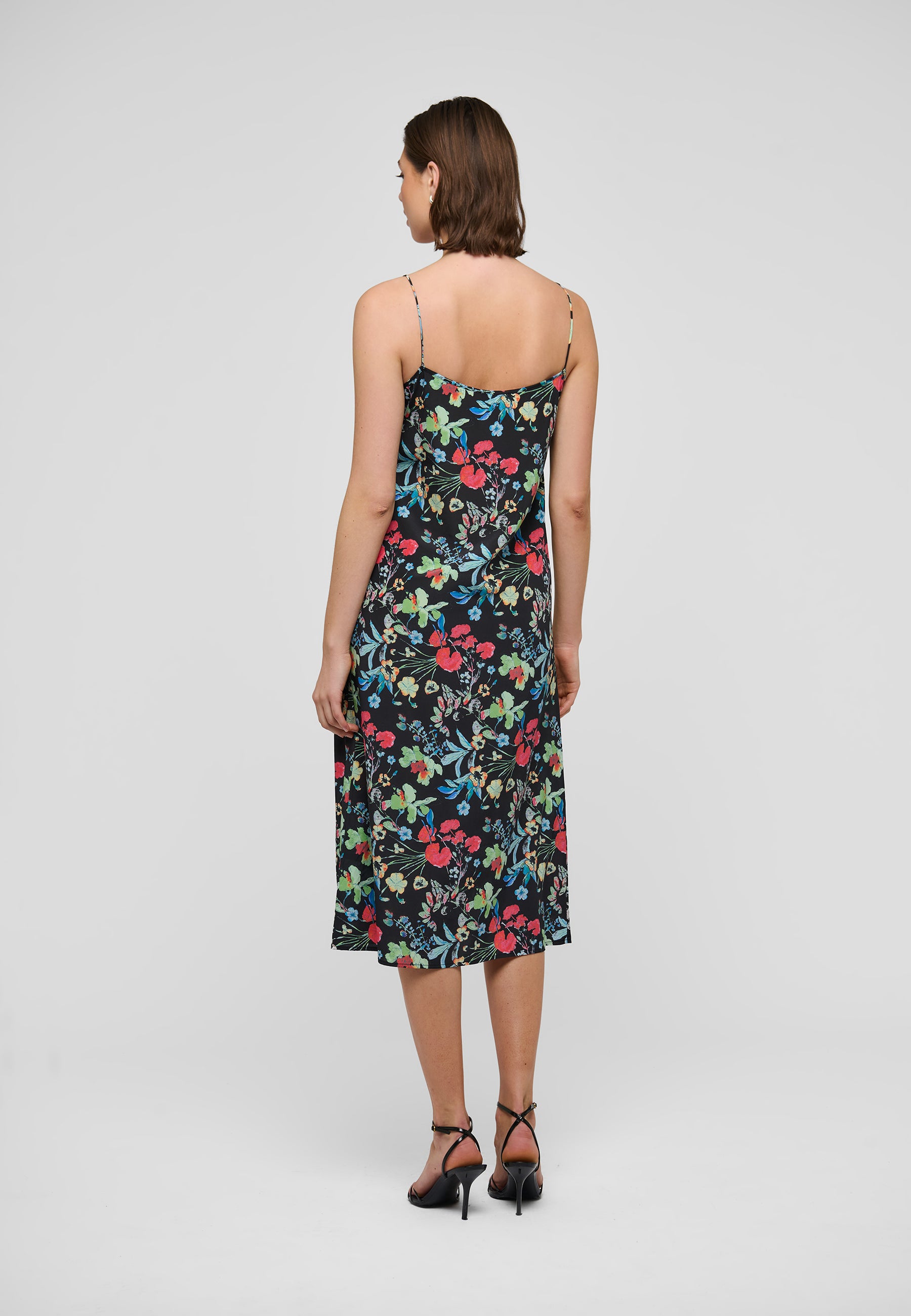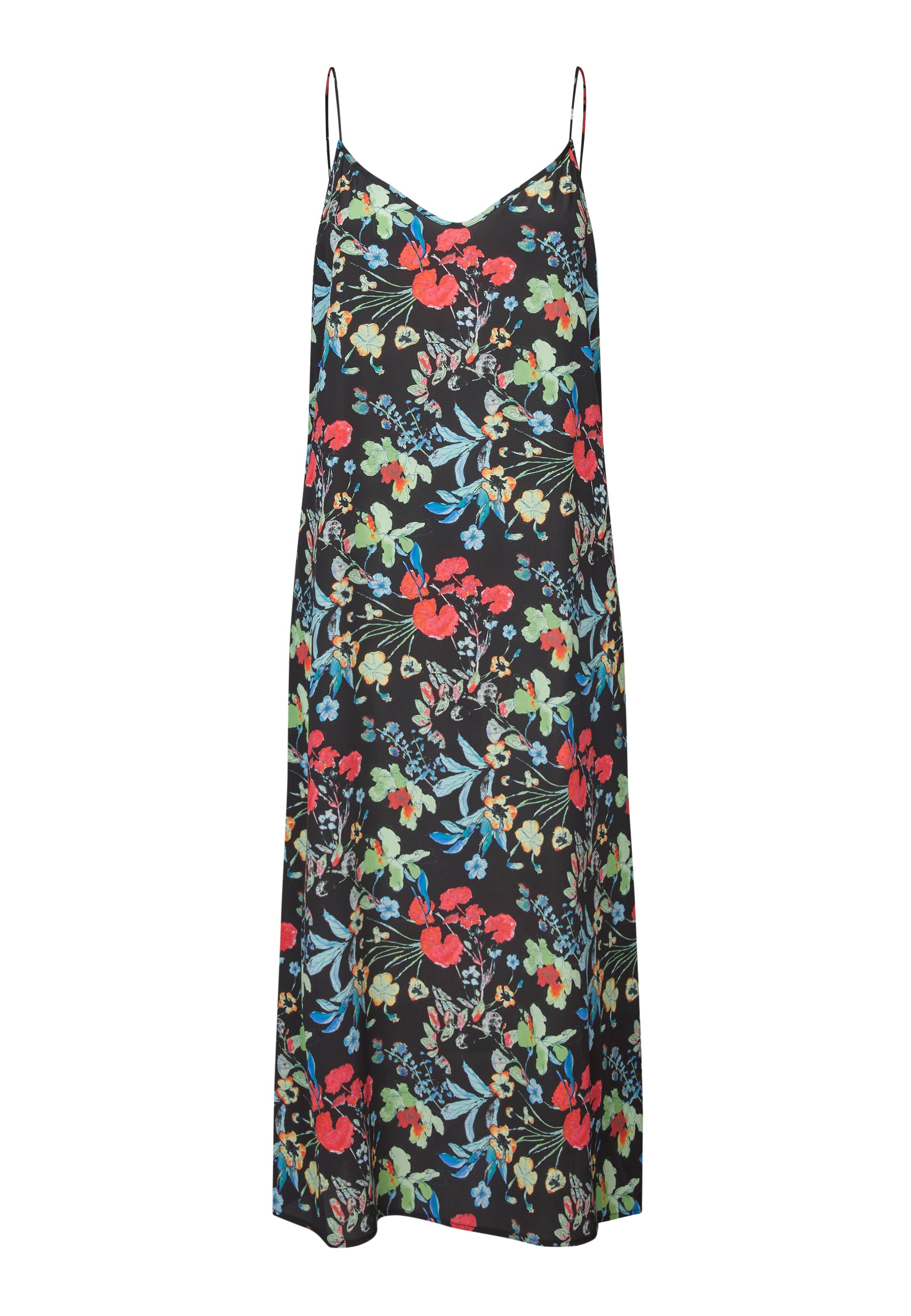 Enkel silkekjole i et enkelt, smalt A-shape snit. kjolen har en blød v-udskæring og tynde stropper og er i et farvestrålende print med akvarel malede blomster på sort bund