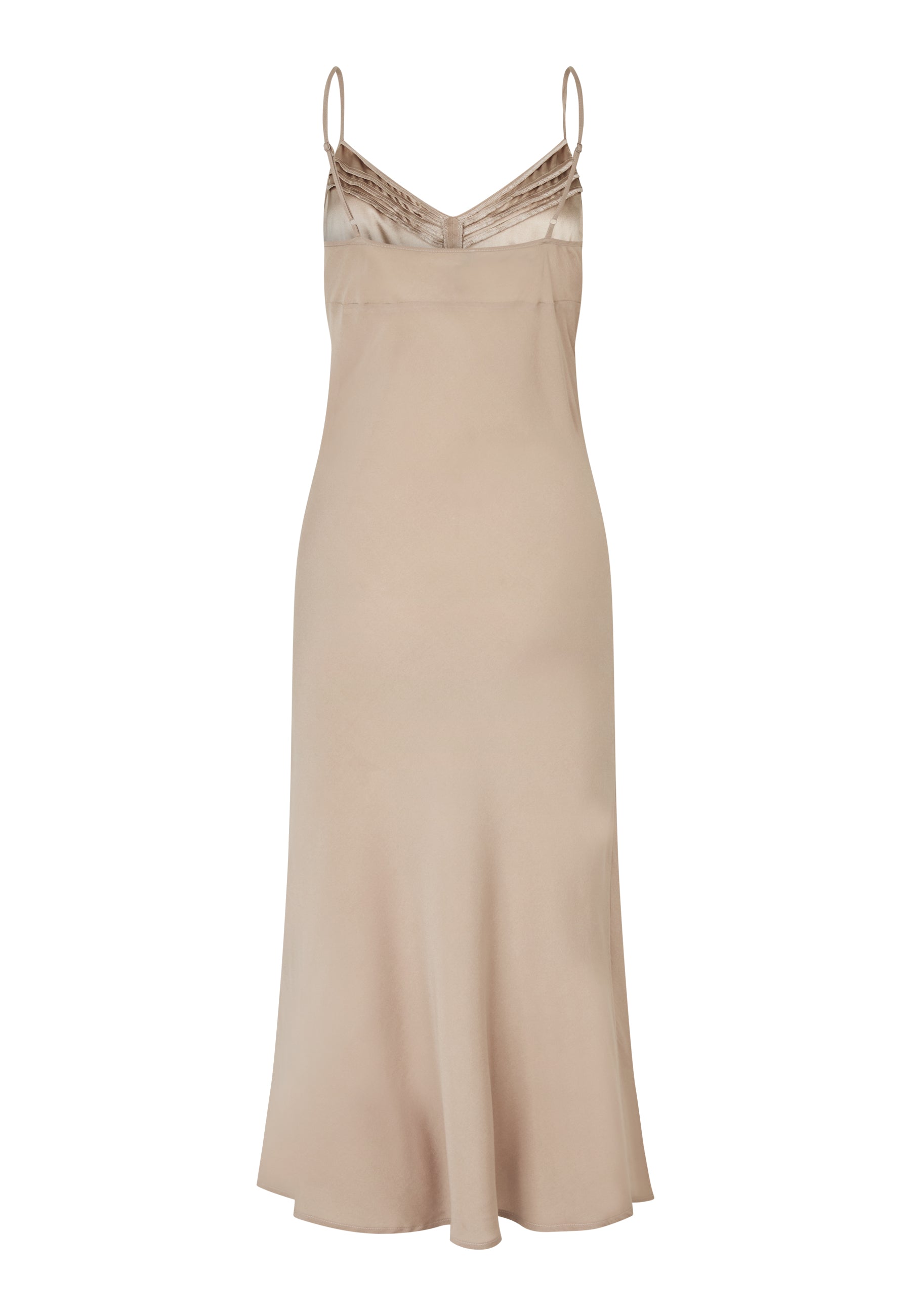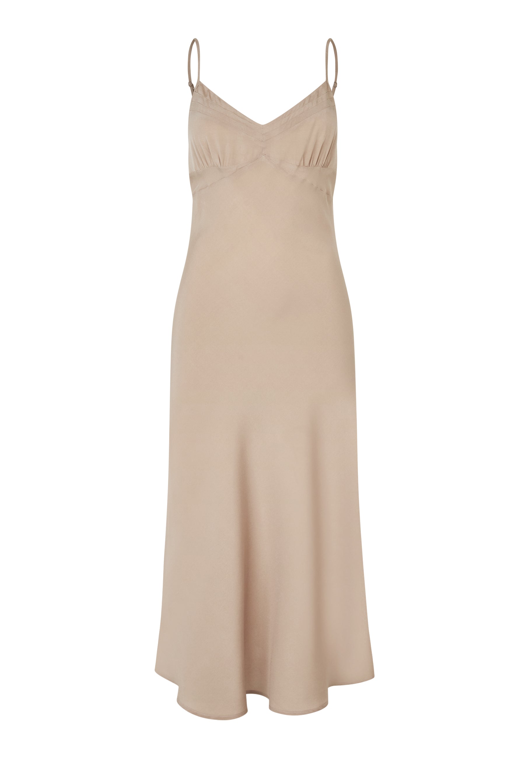 Smuk og enkel empire-silkekjole i et enkelt, smalt A-shape snit. Kjolen har v-udskæring med små fine læg og tynde justerbare stropper.