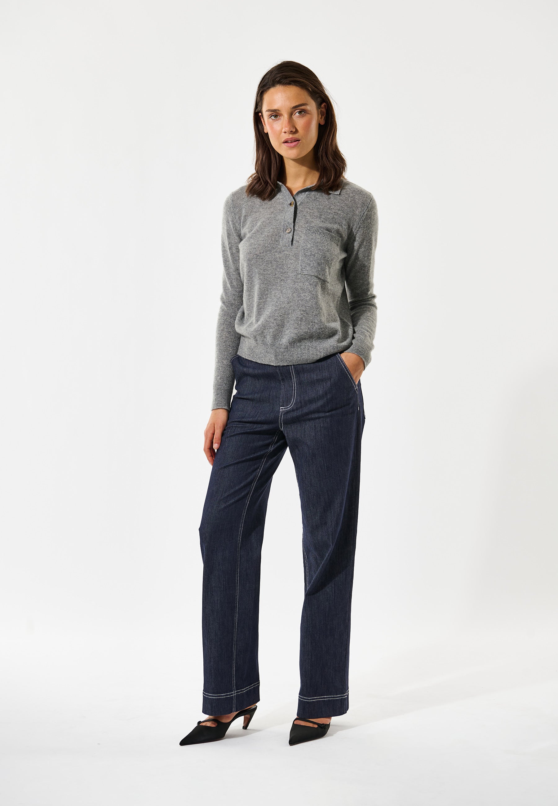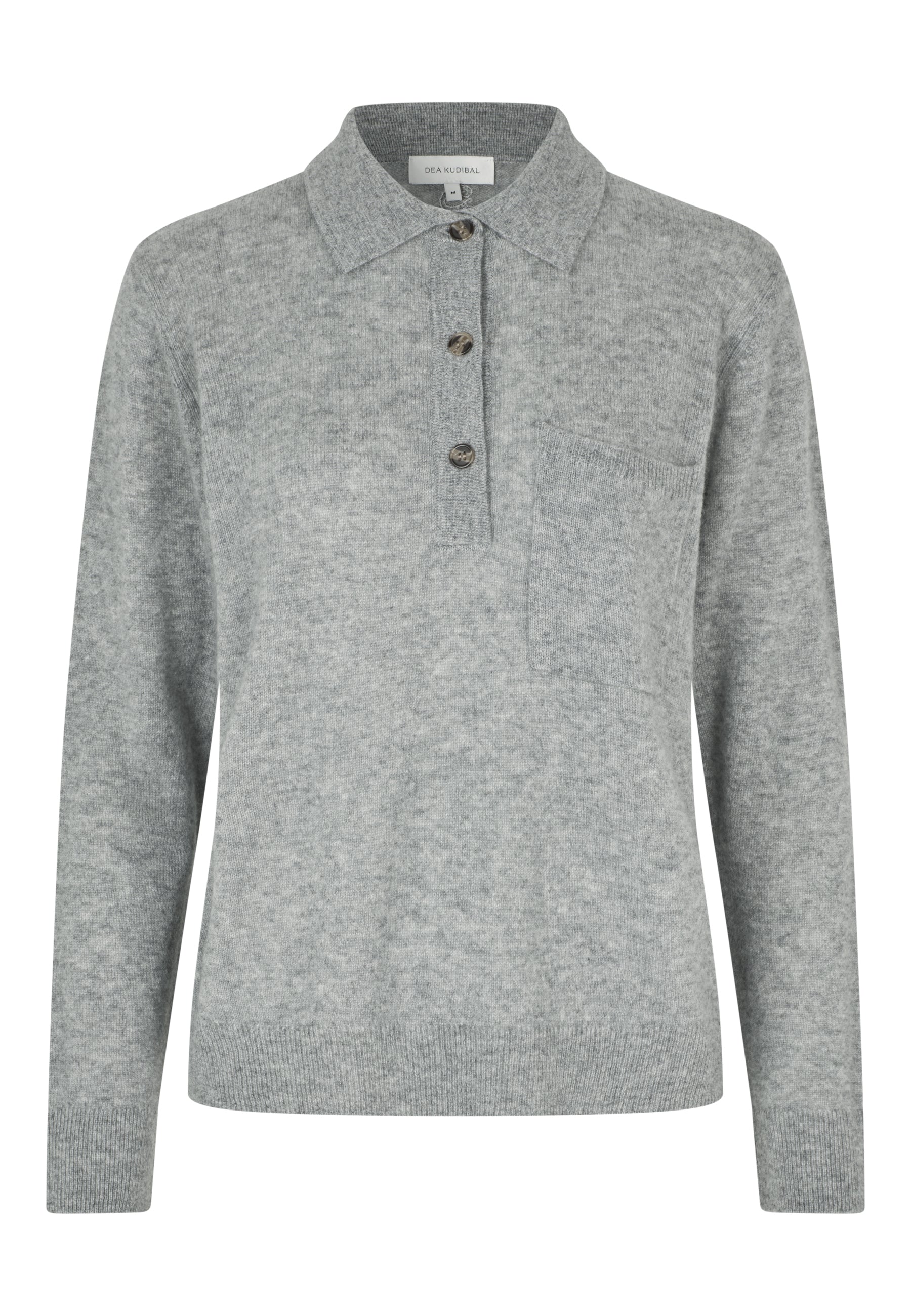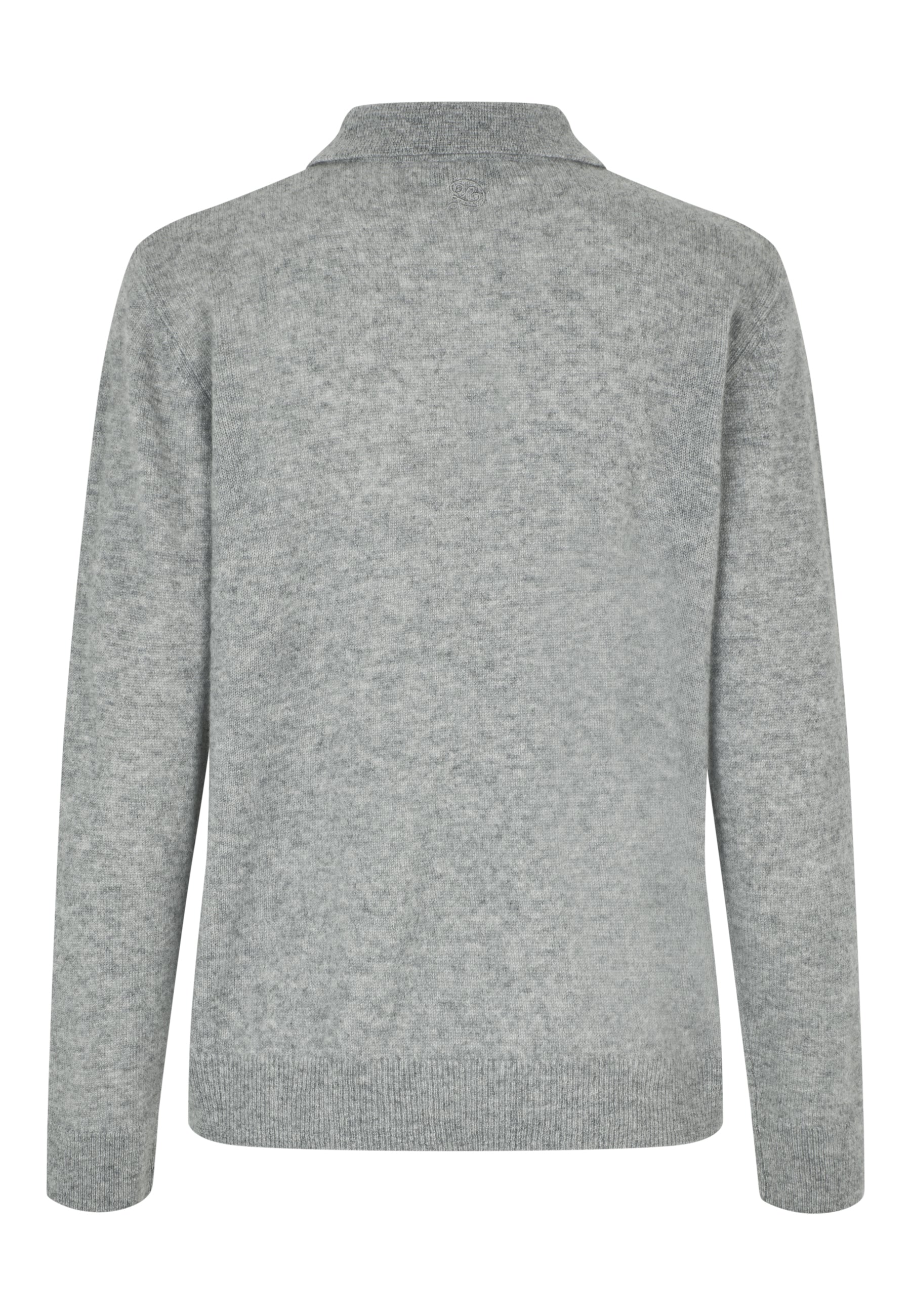 Lækker grå-melange cashmerebluse i klassisk snit. Blusen i et kort løst fit har polokrave, kort stolpelukning med knapper og brystlomme.
