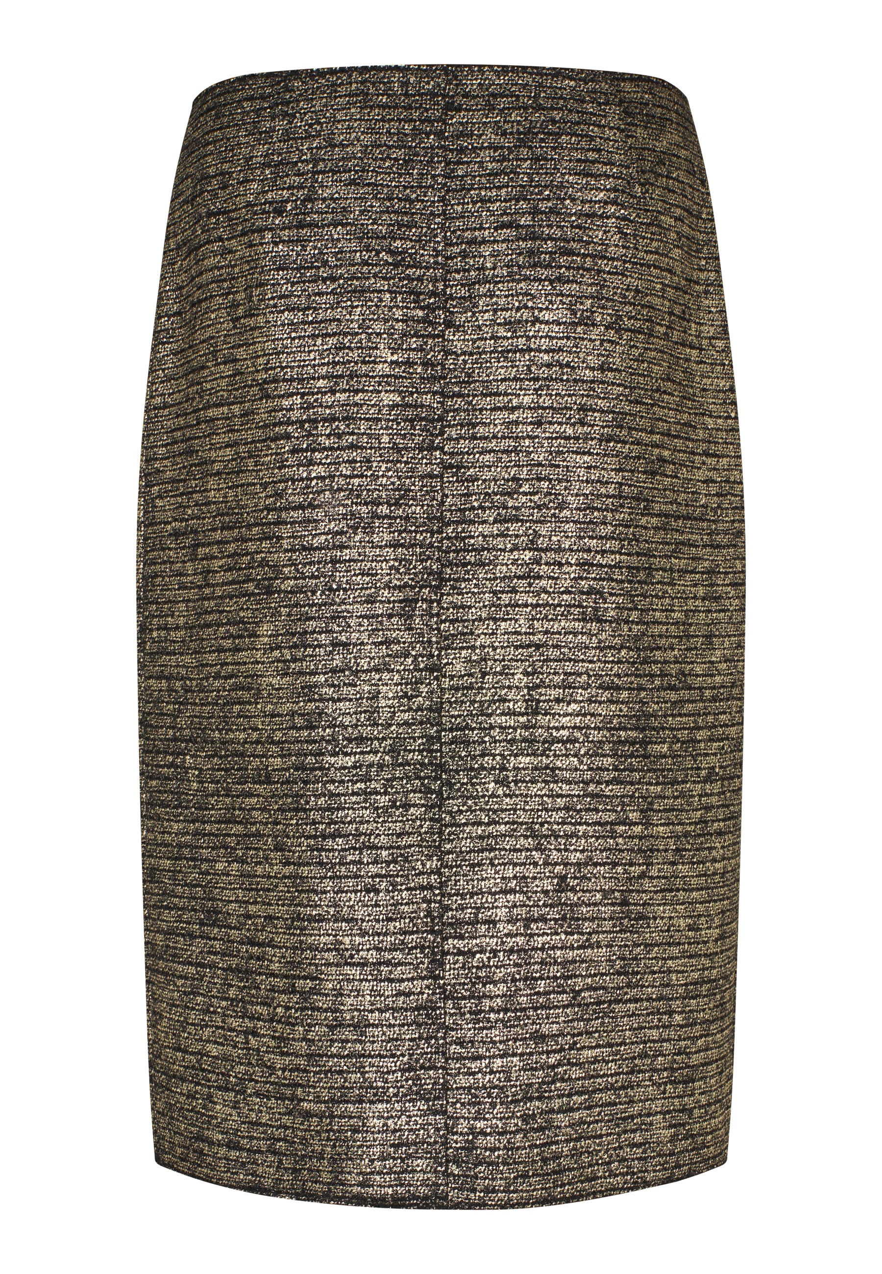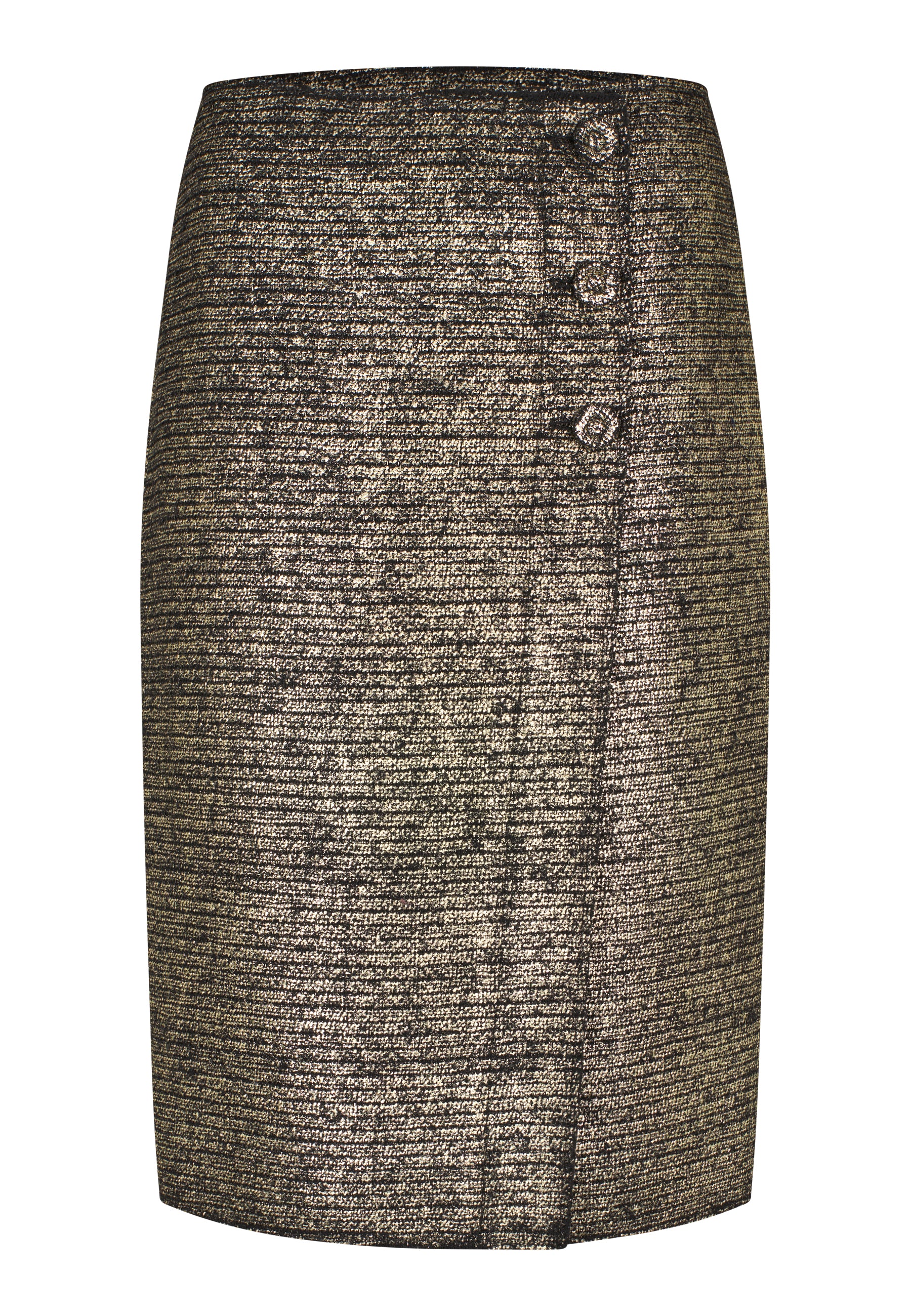 Cool nederdel i råt guld-materiale. Nederdelen har et asymetrisk snit, rå kanter og lukning med grove knapper.