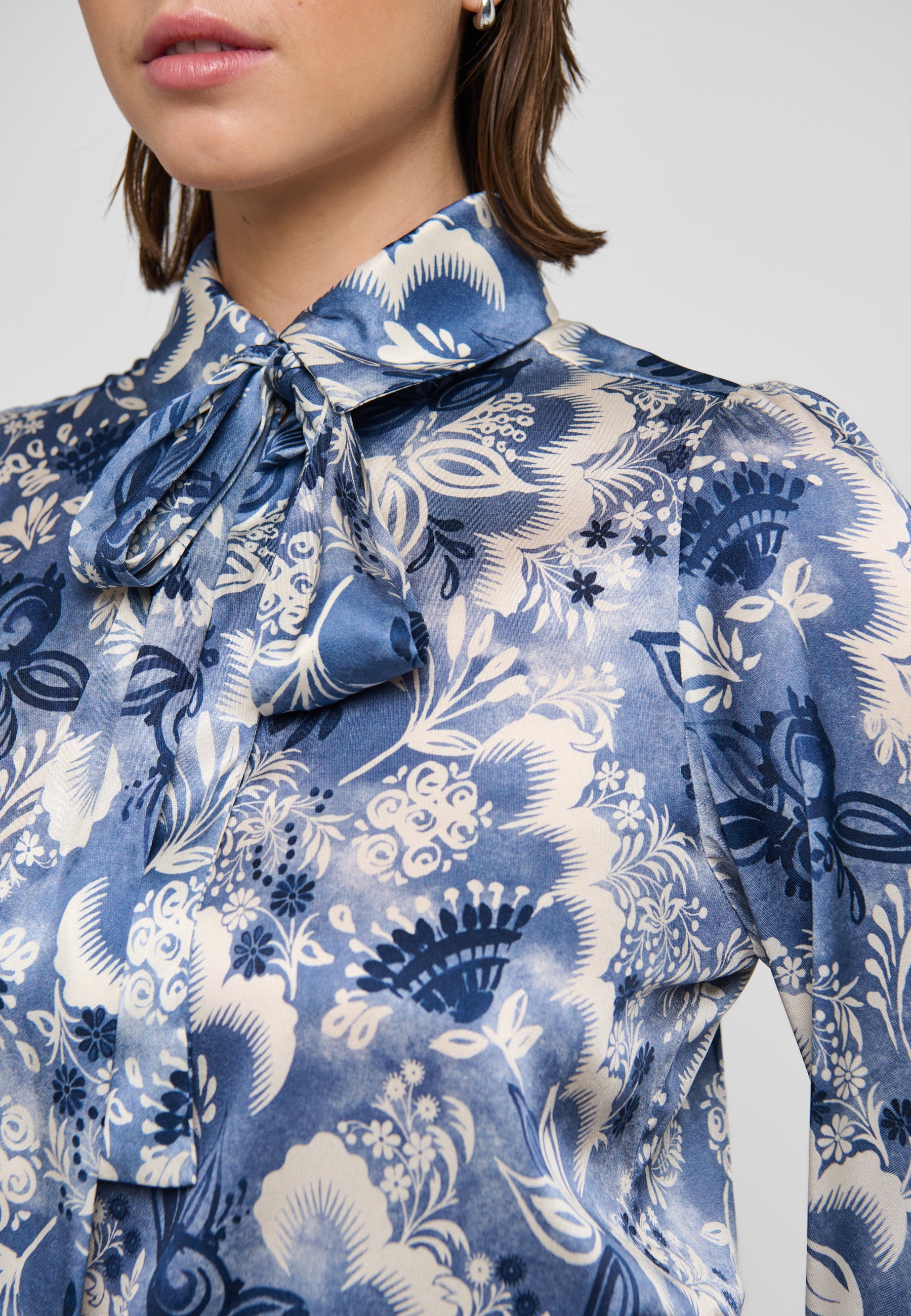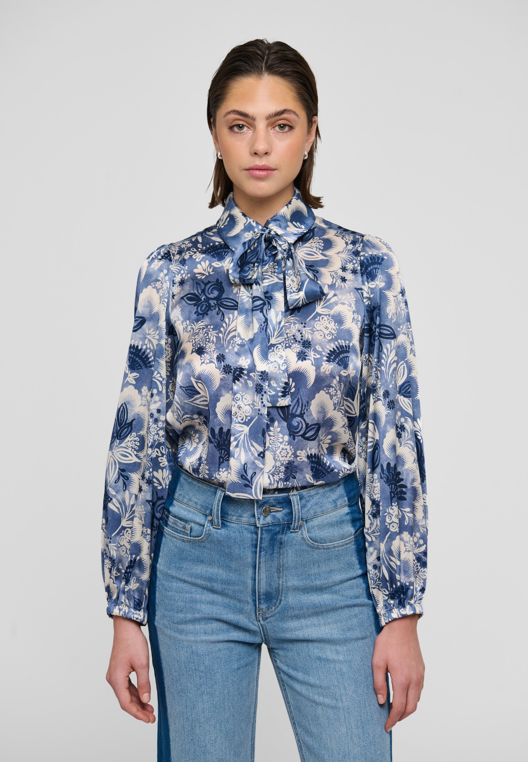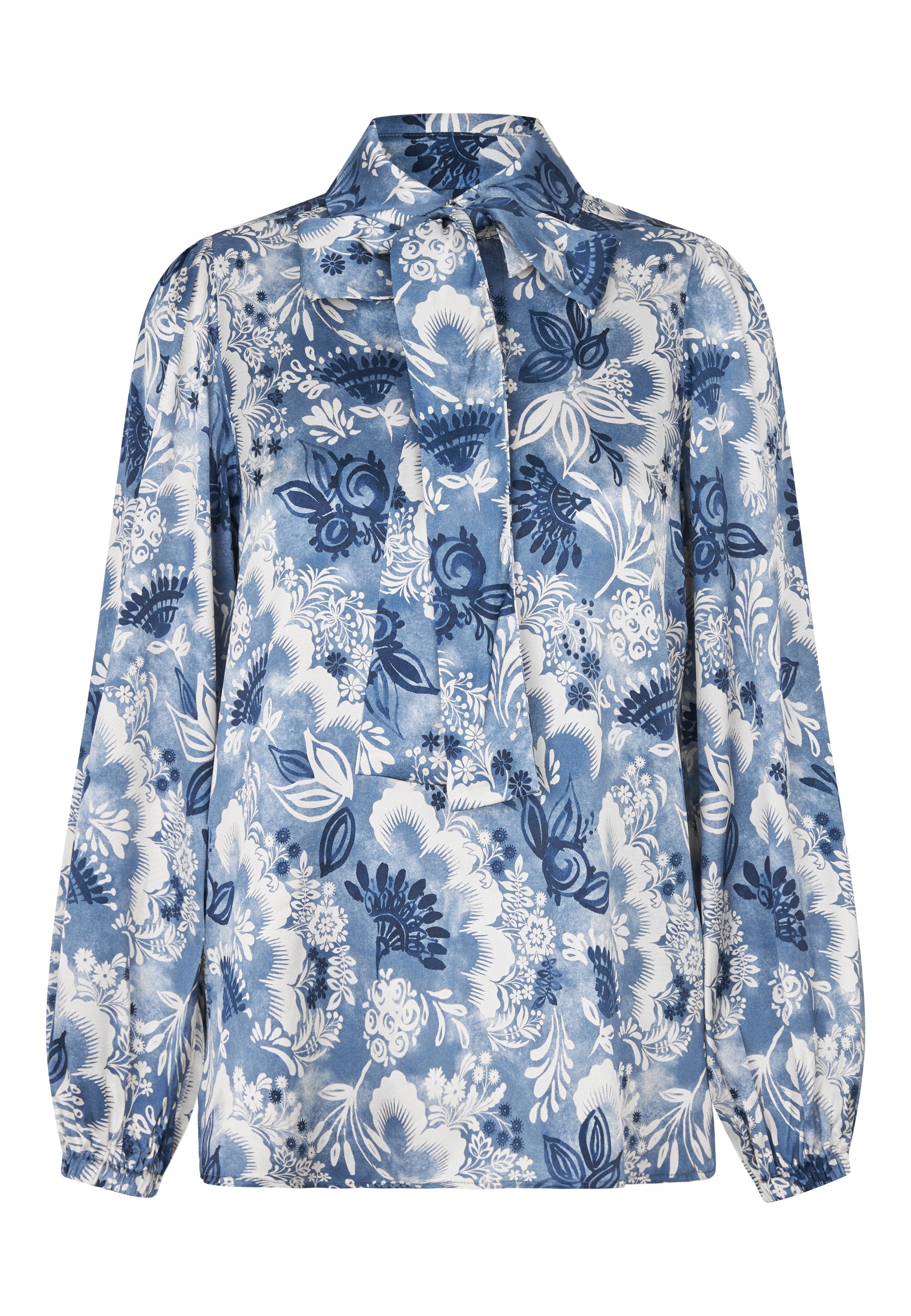 Smuk silketunika med skjortekrave, aftageligt bindebånd i halsen, bærestykke med wienerlæg og ærme med elastikmanchet. Tunikaen er i et skønt abstrakt blomsterprint bestående af hvide og blålige nuancer .