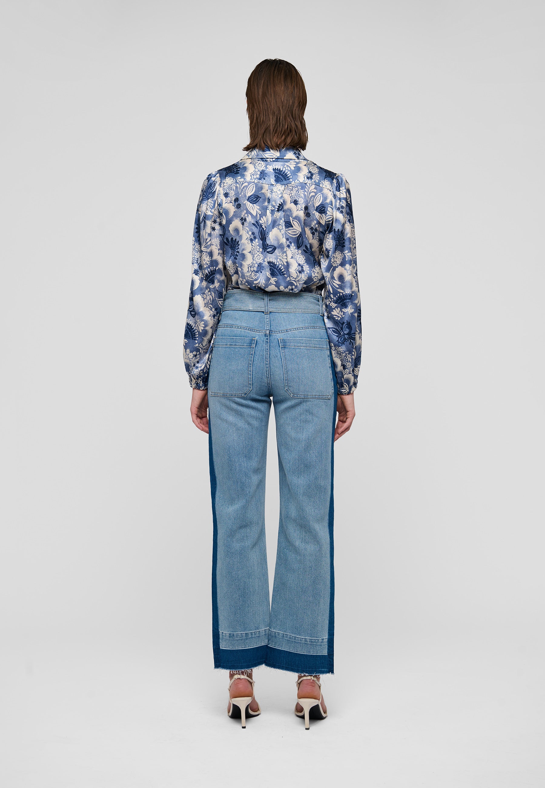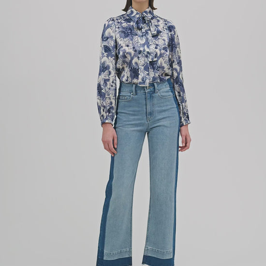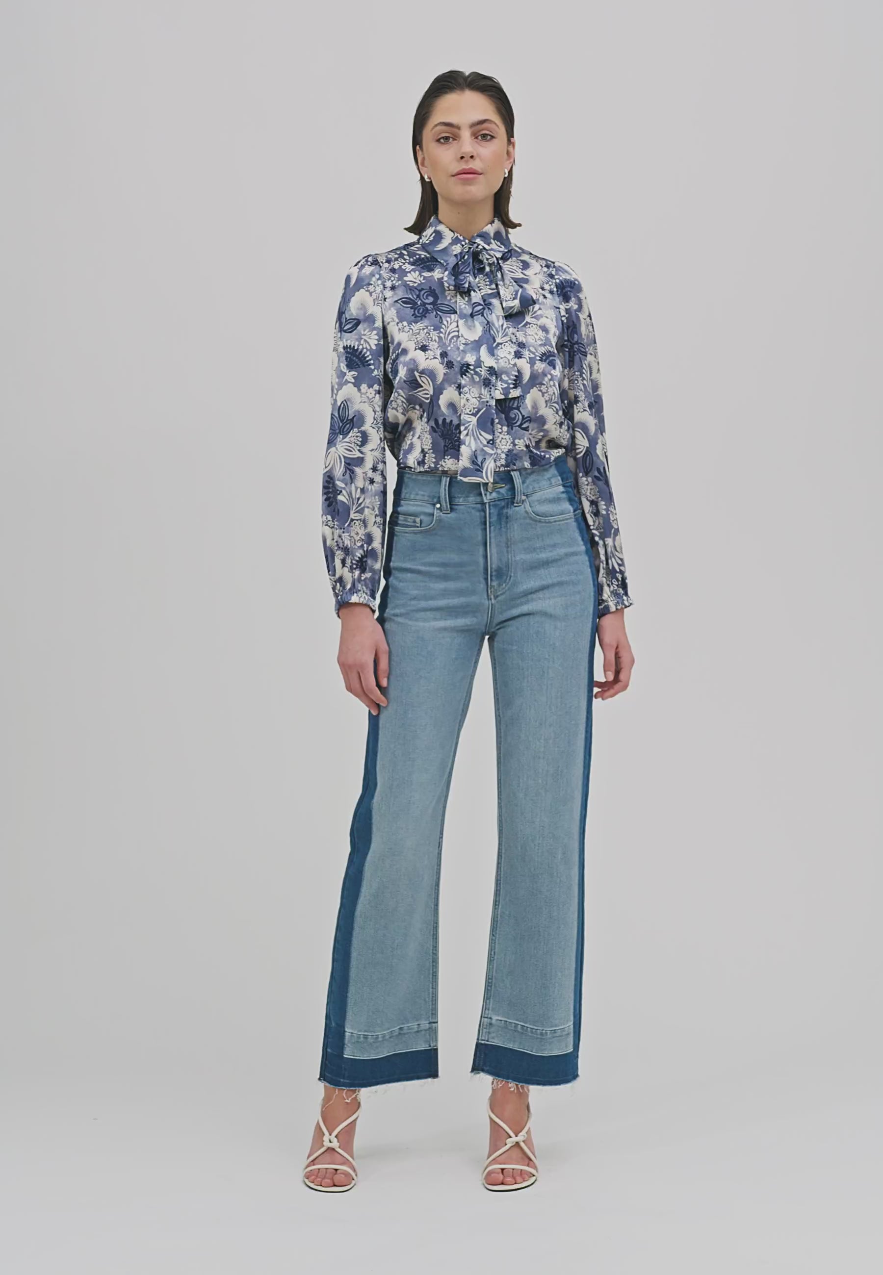 Smuk silketunika med skjortekrave, aftageligt bindebånd i halsen, bærestykke med wienerlæg og ærme med elastikmanchet. Tunikaen er i et skønt abstrakt blomsterprint bestående af hvide og blålige nuancer .