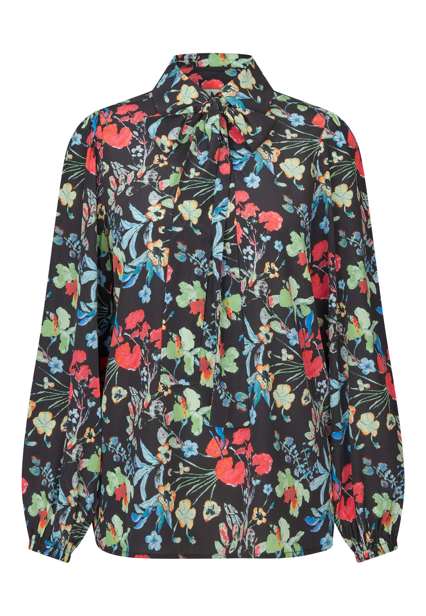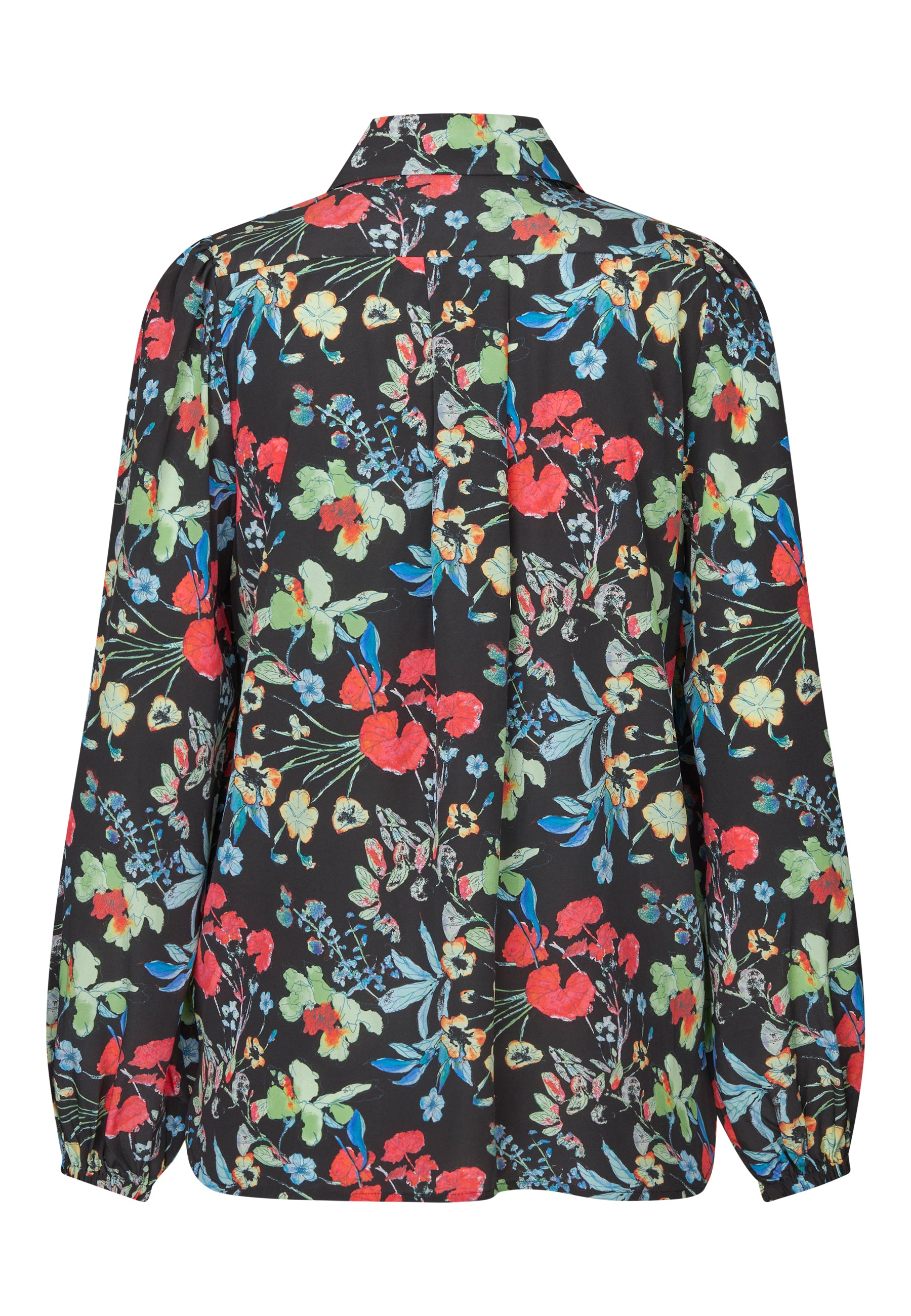 Smuk tunika i mat silke. Tunikaen har skjortekrave, aftageligt bindebånd i halsen, bærestykke med wienerlæg og ærme med elastikmanchet. Tunikaen er i et farvestrålende print bestående af akvarel malede blomster på sort bund.