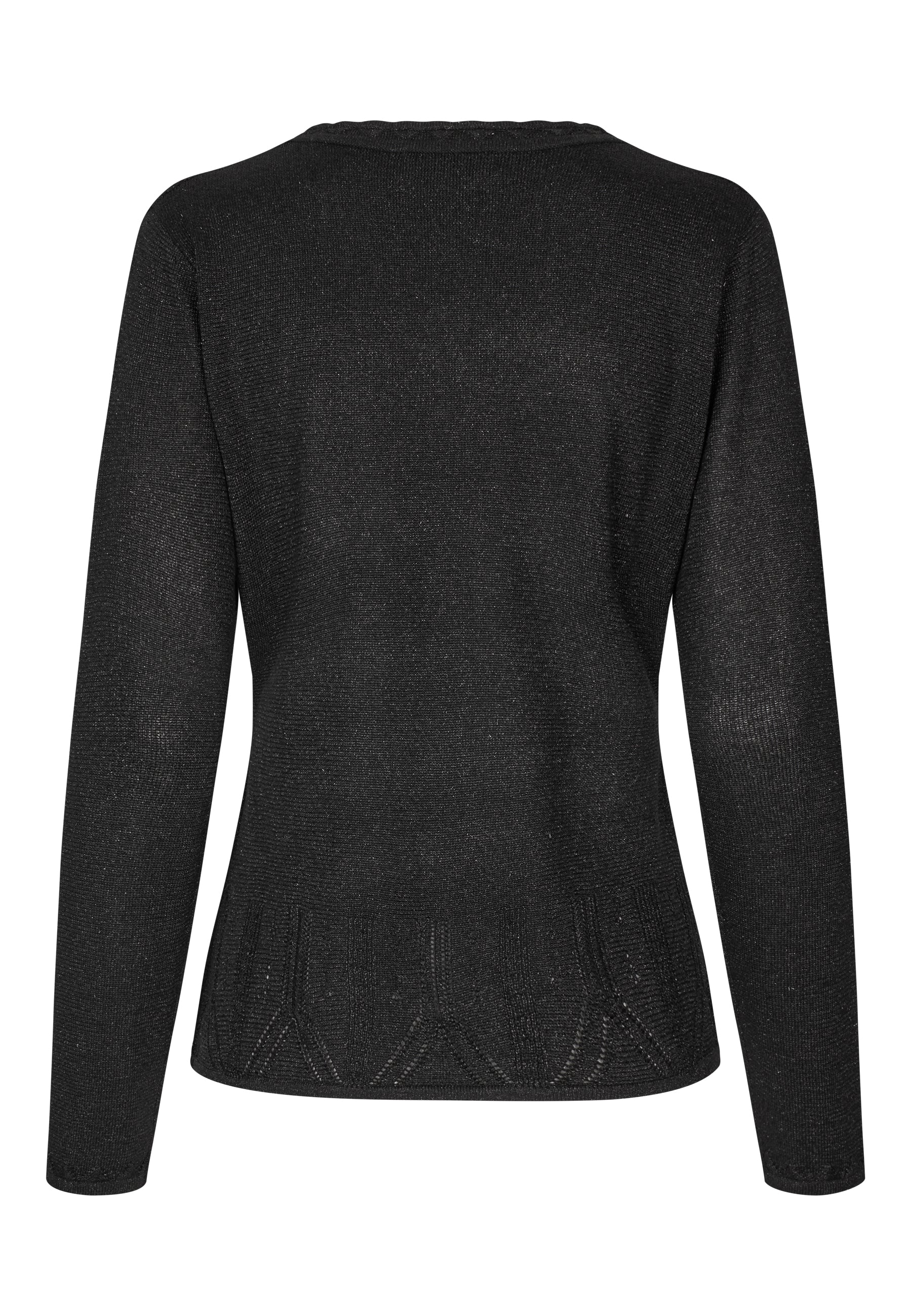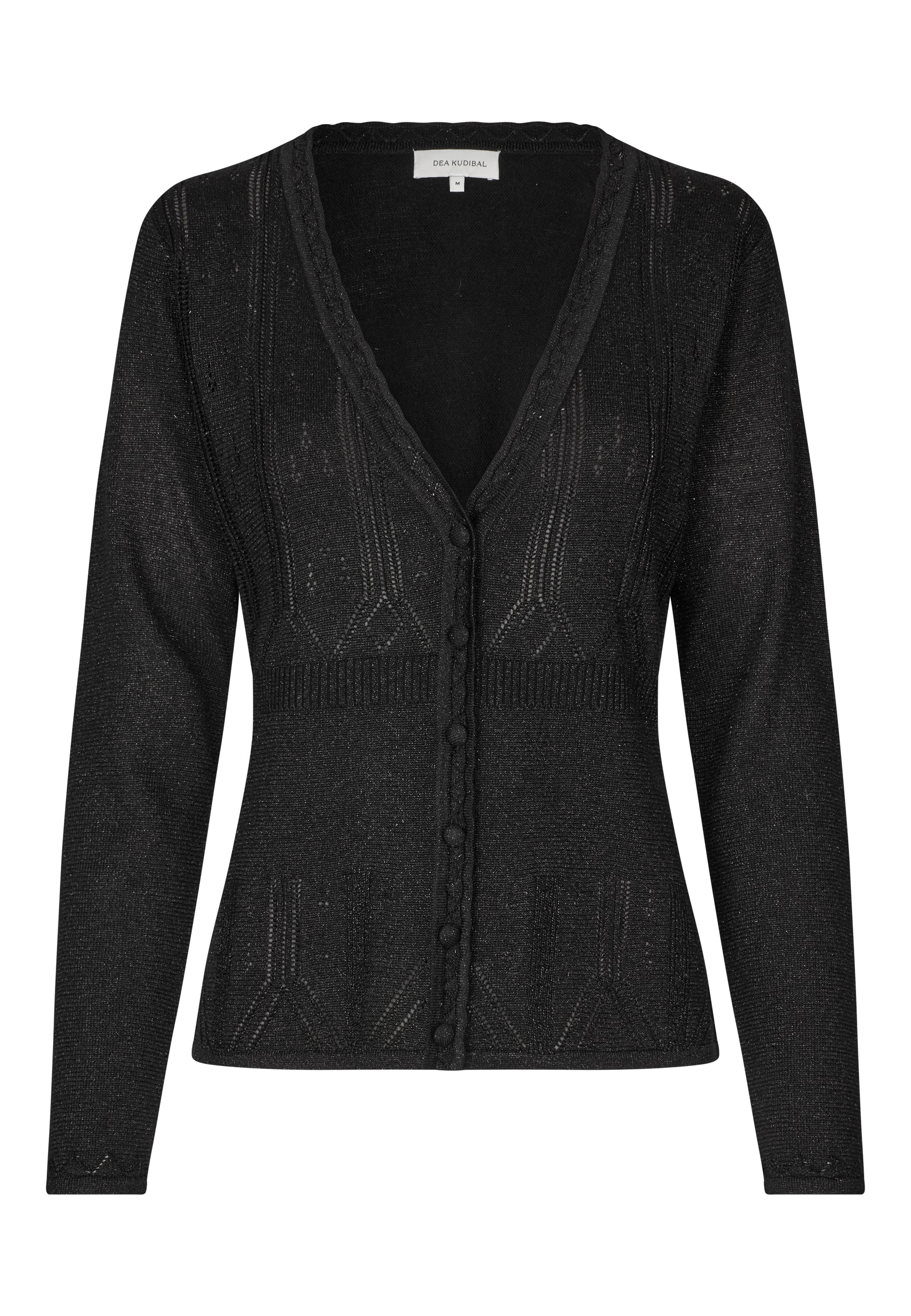 Feminin strik cardigan med feminine detaljer såsom, fint hulmønster, ribbet empire-overskæring og betrukne knapper.