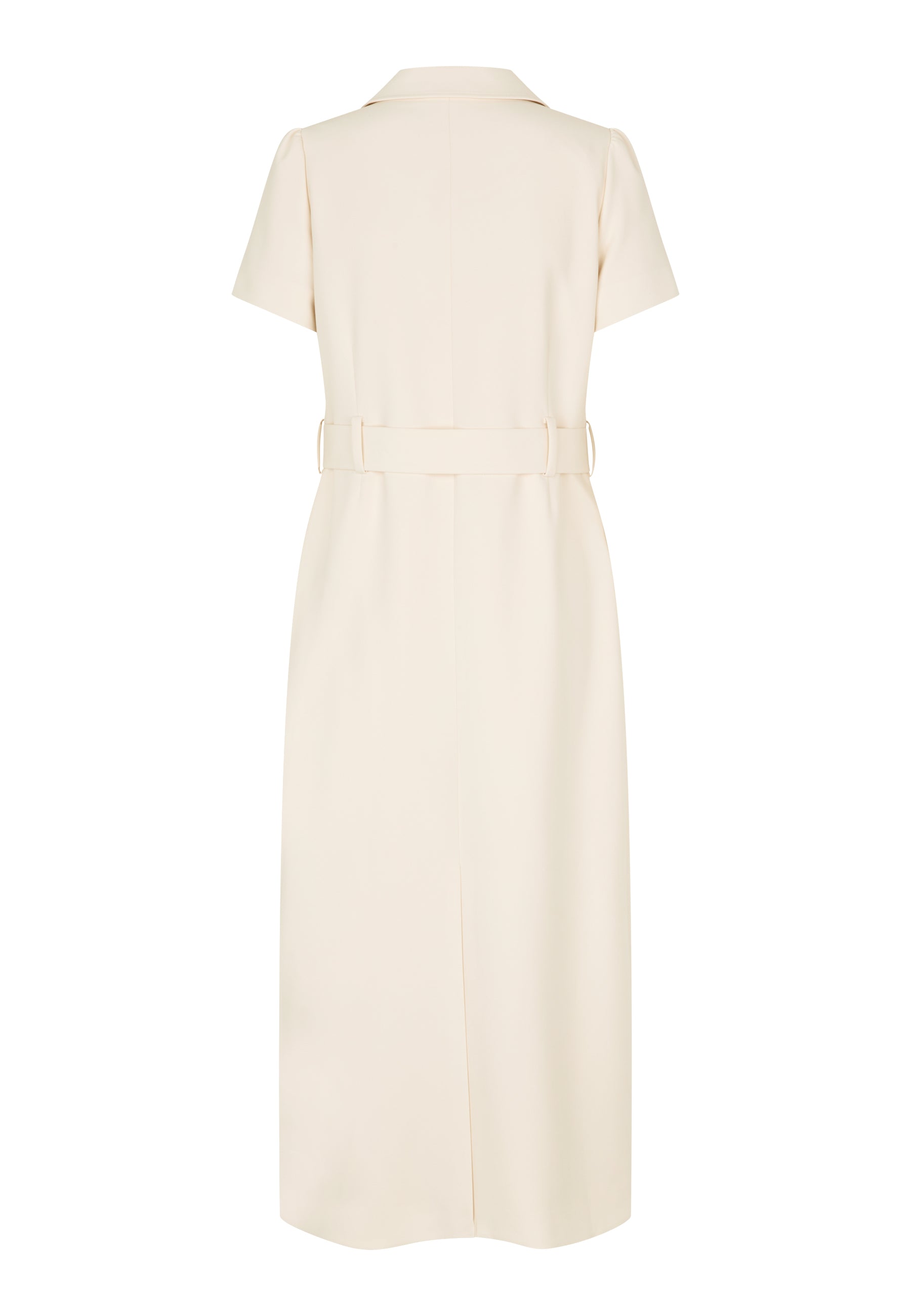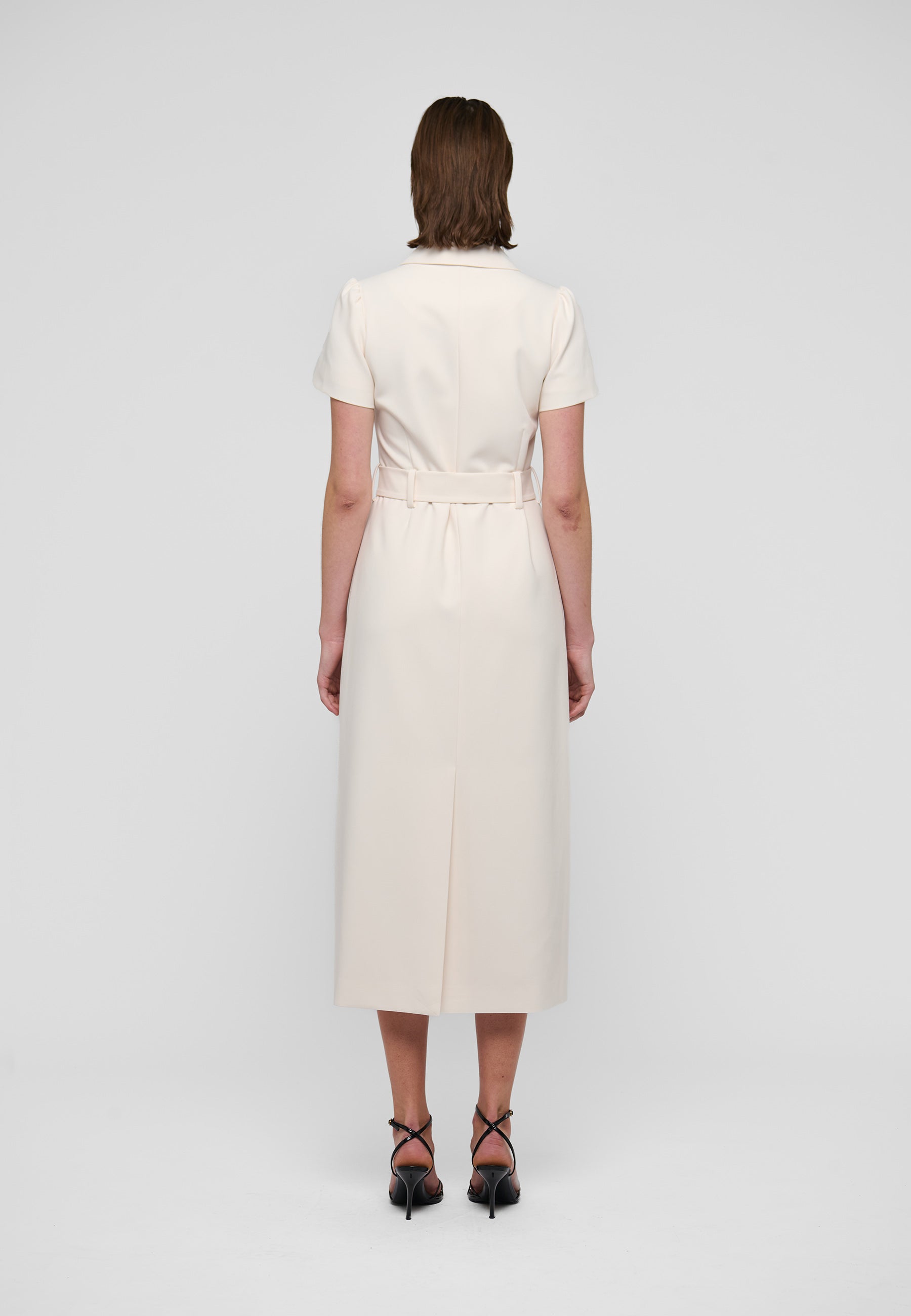 Enkel og elegant gennemknappet blazer-kjole med revers og markeret talje. Kjolen er skåret over i taljen hvilket understeges af det medfølgende bælte.