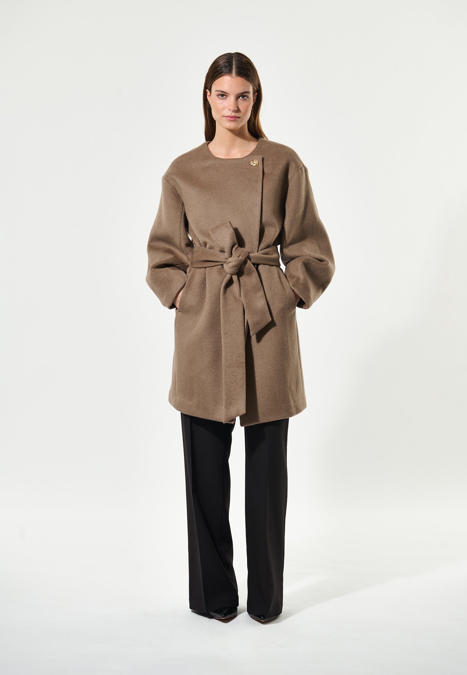 Lækker kort vinterfrakke i klassisk camelfarvet uldmateriale. Frakken har et løst snit og bredt bindebælte til at fremhæve taljen. Den har stiklommer, en asymmestrisk lukning som holdes på plads af en gylden banket knap samt et bred bindebælte. Ærmerne er volumiøse og men smalle ved håndledet.