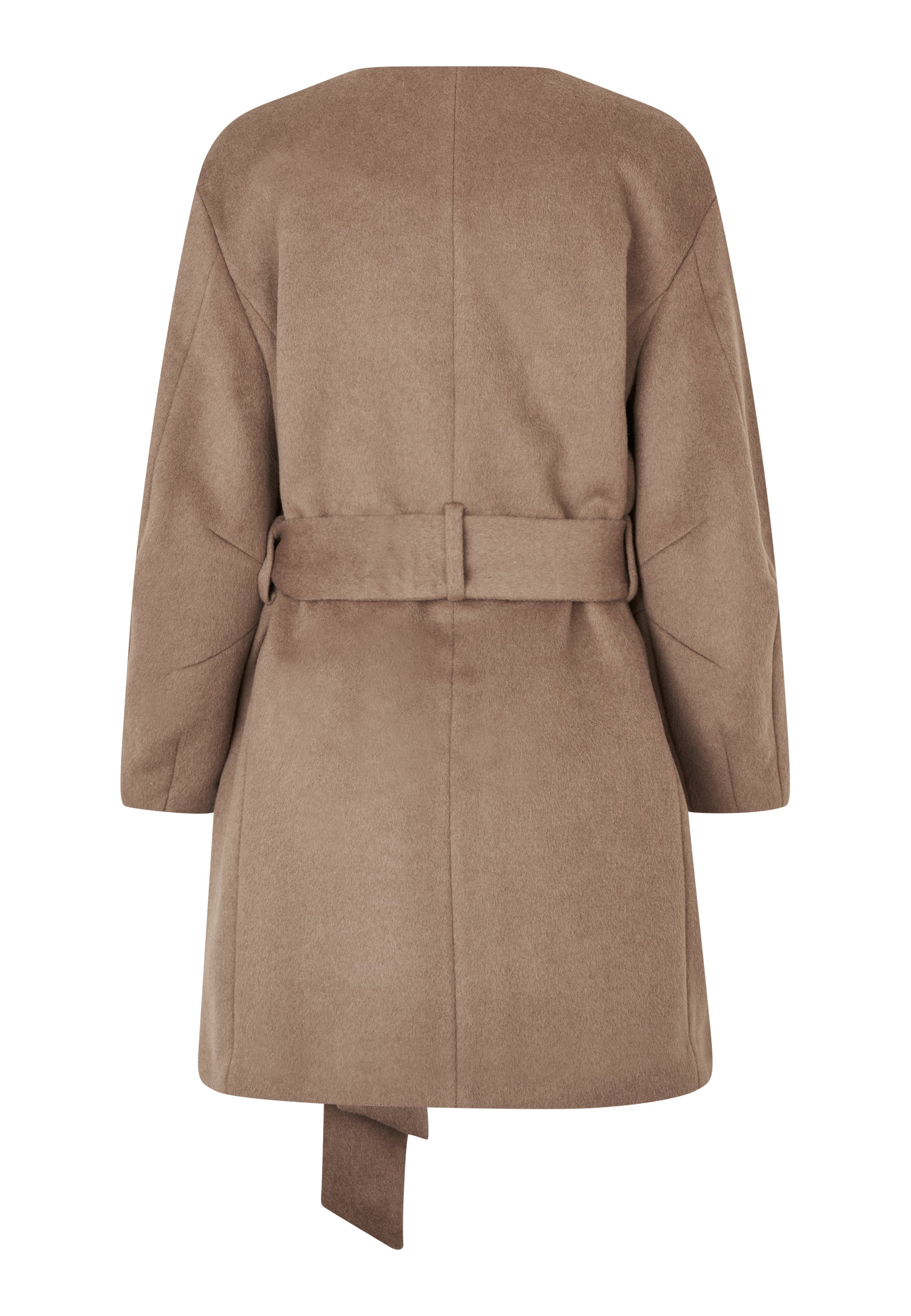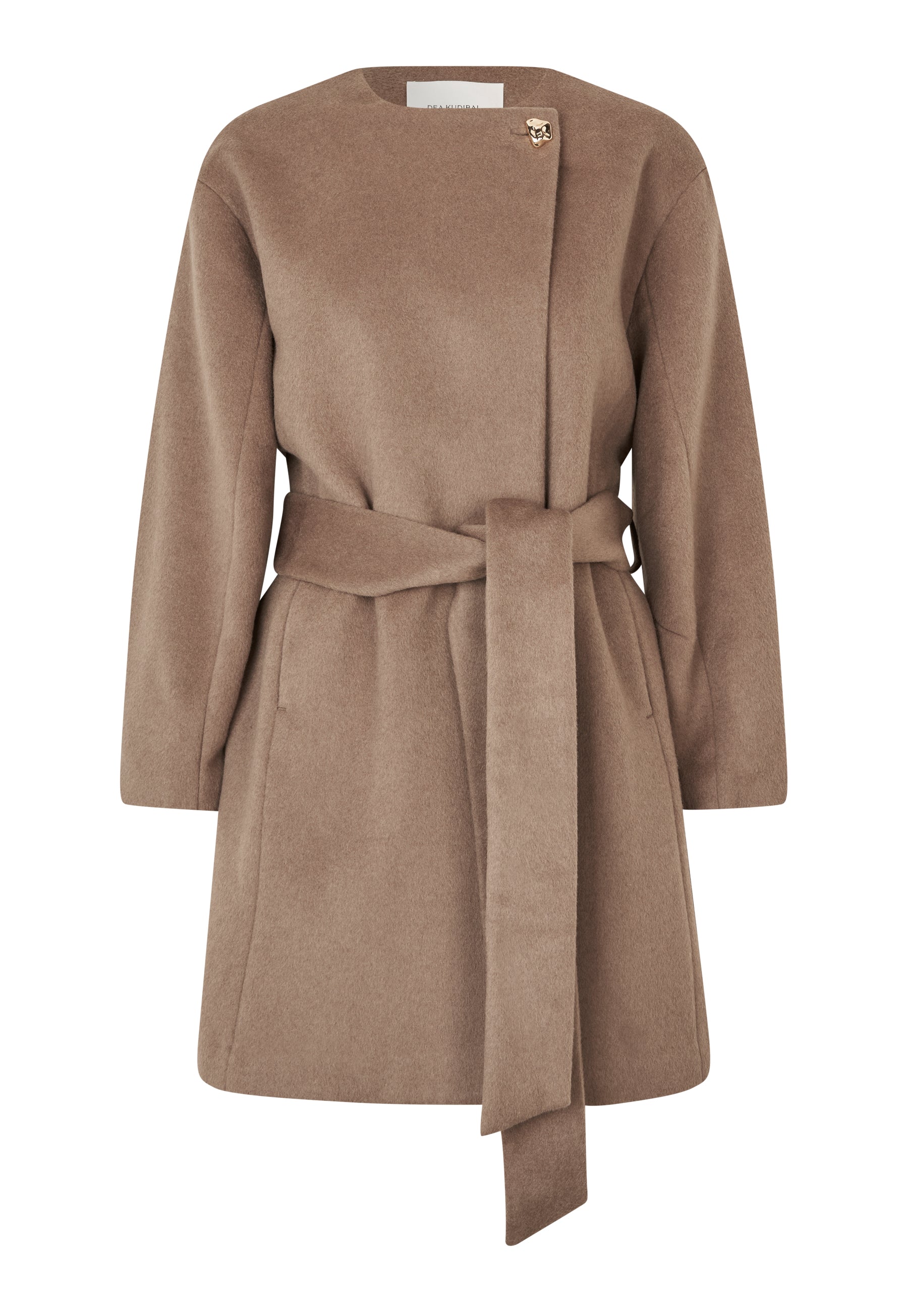 Lækker kort vinterfrakke i klassisk camelfarvet uldmateriale. Frakken har et løst snit og bredt bindebælte til at fremhæve taljen. Den har stiklommer, en asymmestrisk lukning som holdes på plads af en gylden banket knap samt et bred bindebælte. Ærmerne er volumiøse og men smalle ved håndledet.