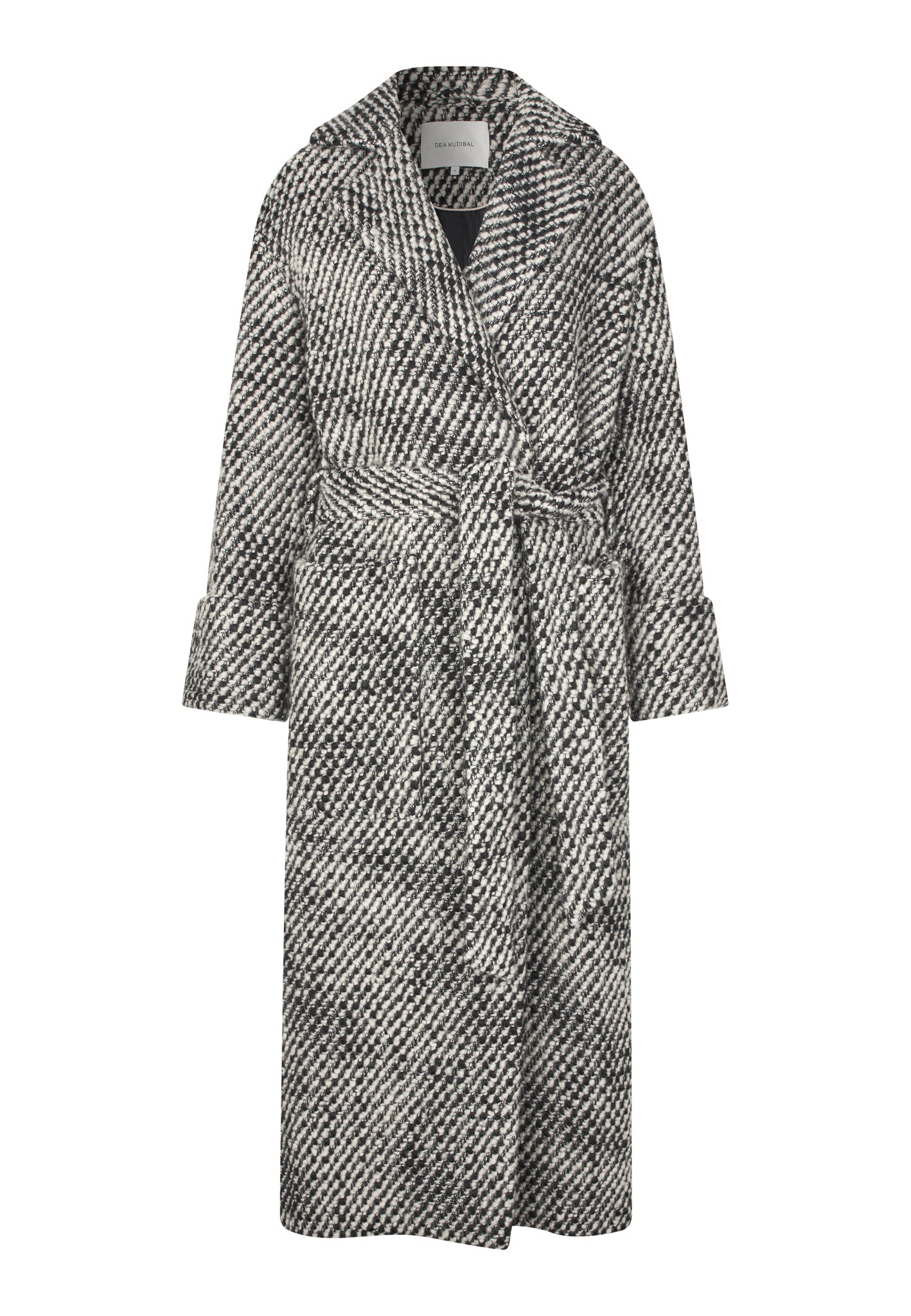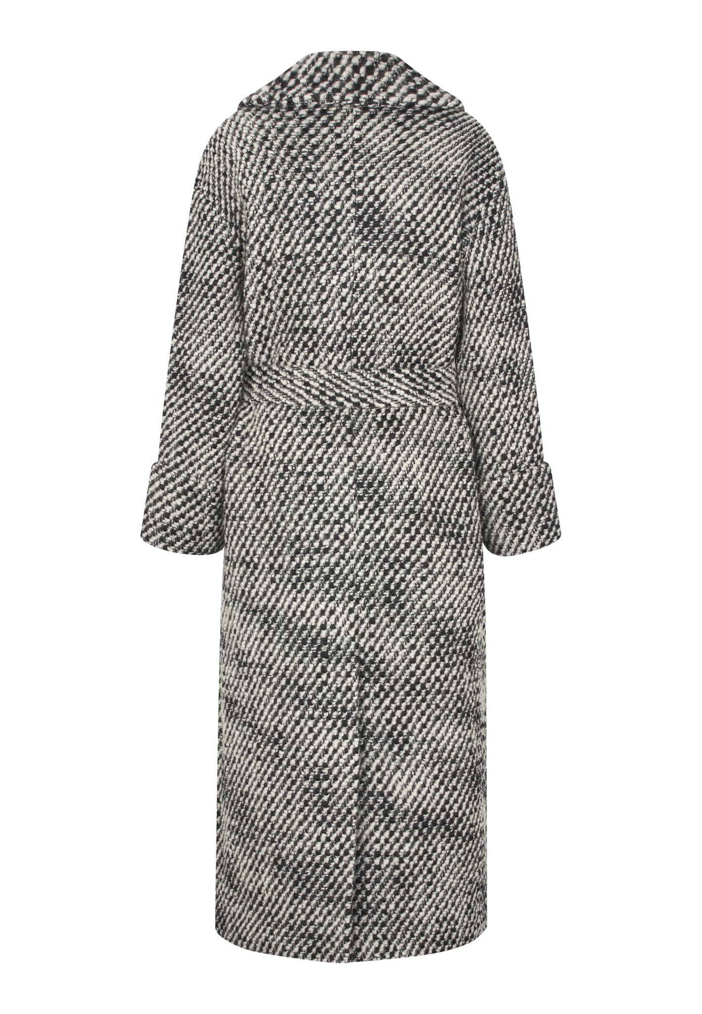Skøn lang vinterfrakke i sort hvidt bouclemateriale. Frakken har et løst snit, klassisk revers, påsyede lommer og bredt bindebælte til at fremhæve taljen. .