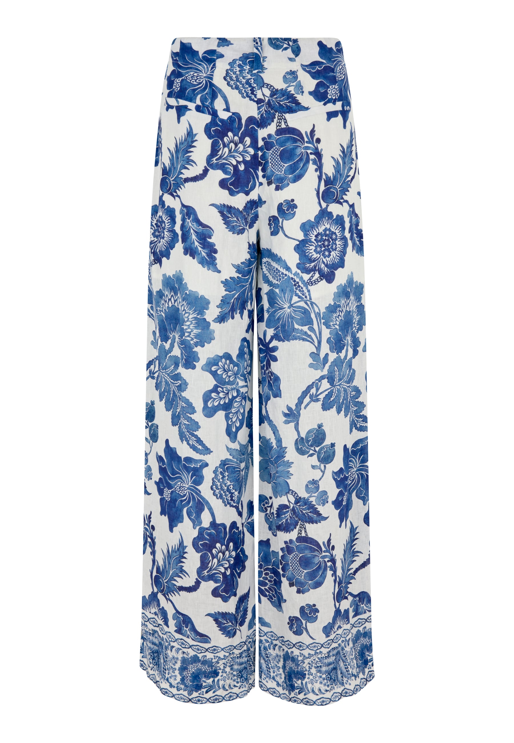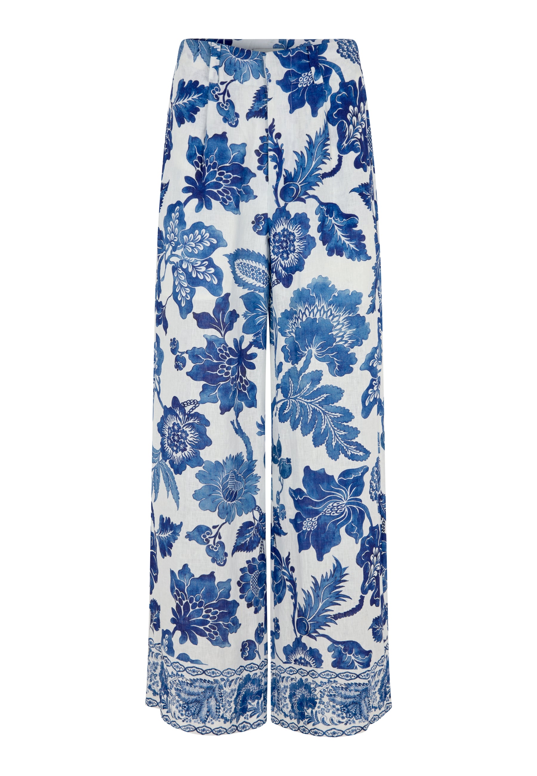 Højtaljet hør-buks med brede ben. Buksen er i et skønt blåt 70´er inspireret blomsterprint på hvid baggrund.