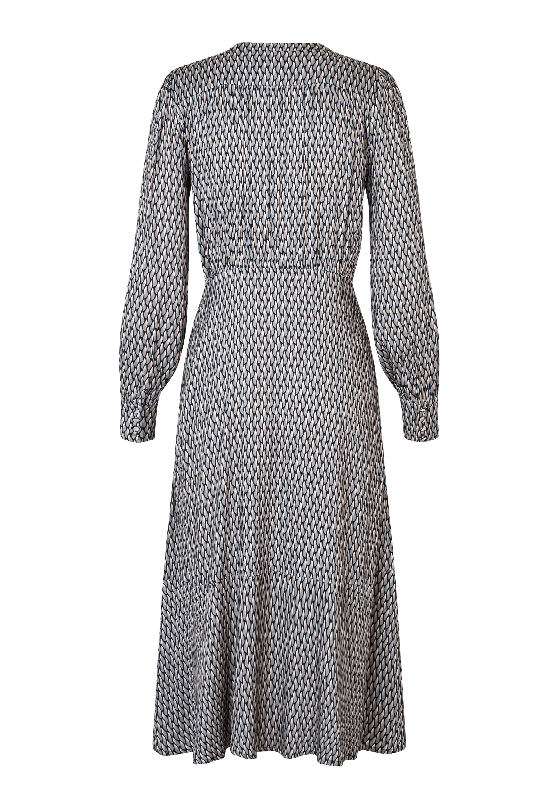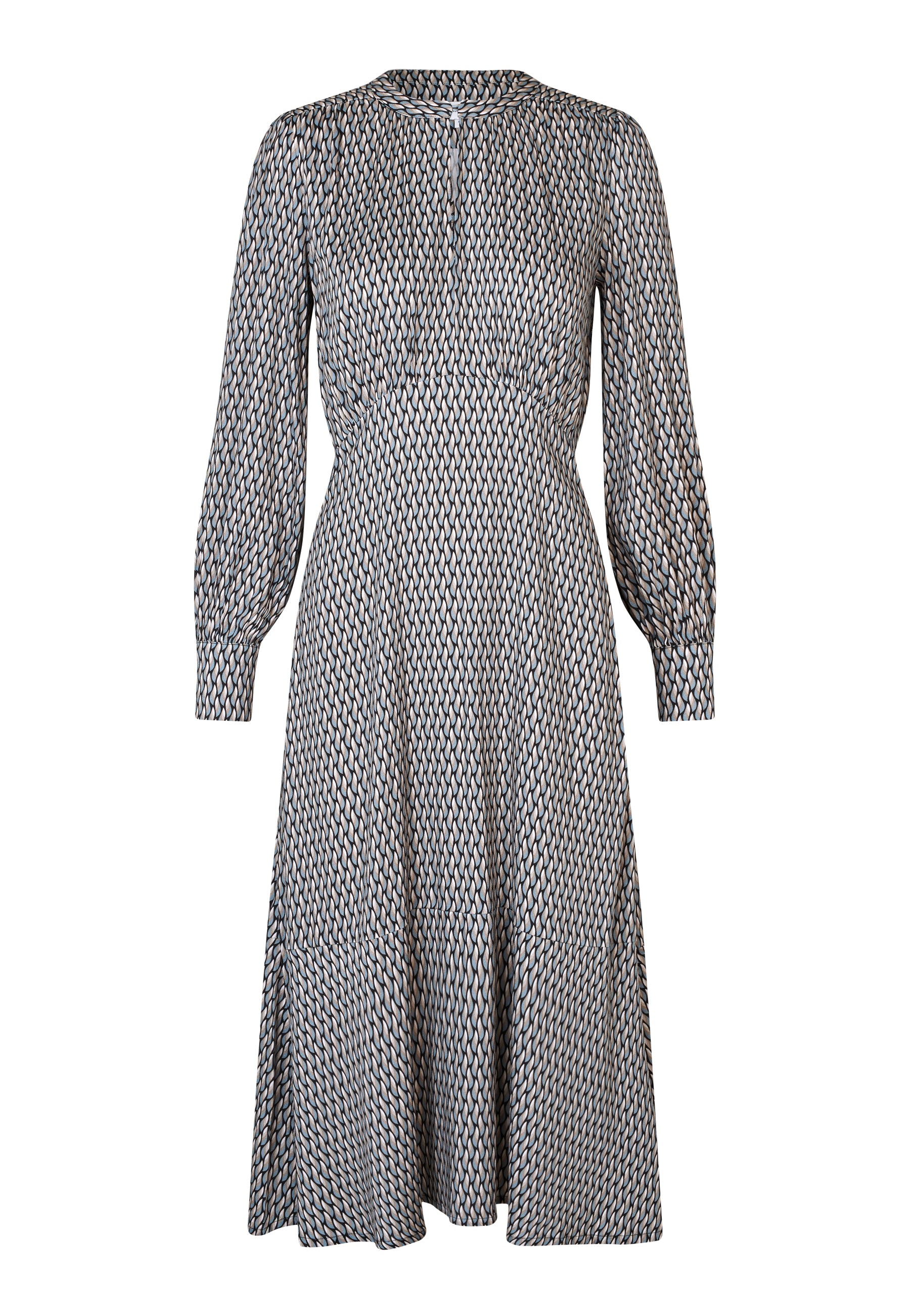 Smuk viskosekjole i et enkelt print bestående af creme-nuancer, sort og lyseblå. Kjolen har en empire-overskæring med små rynk, og en høj taljeoverskæring ligeledes med rynk. Løse ærmer med lille puf og manchet som lukkes med fine betrukne knapper. Bagpå er ligeledes en overskæring med små rynk, som fremhæver lænden på en meget feminin måde, nederst er et bredt flæsestykke. Kjolen kan enten lukkes med en lille knap i halsen eller stå åben hvis du ønsker en V-udskæring.