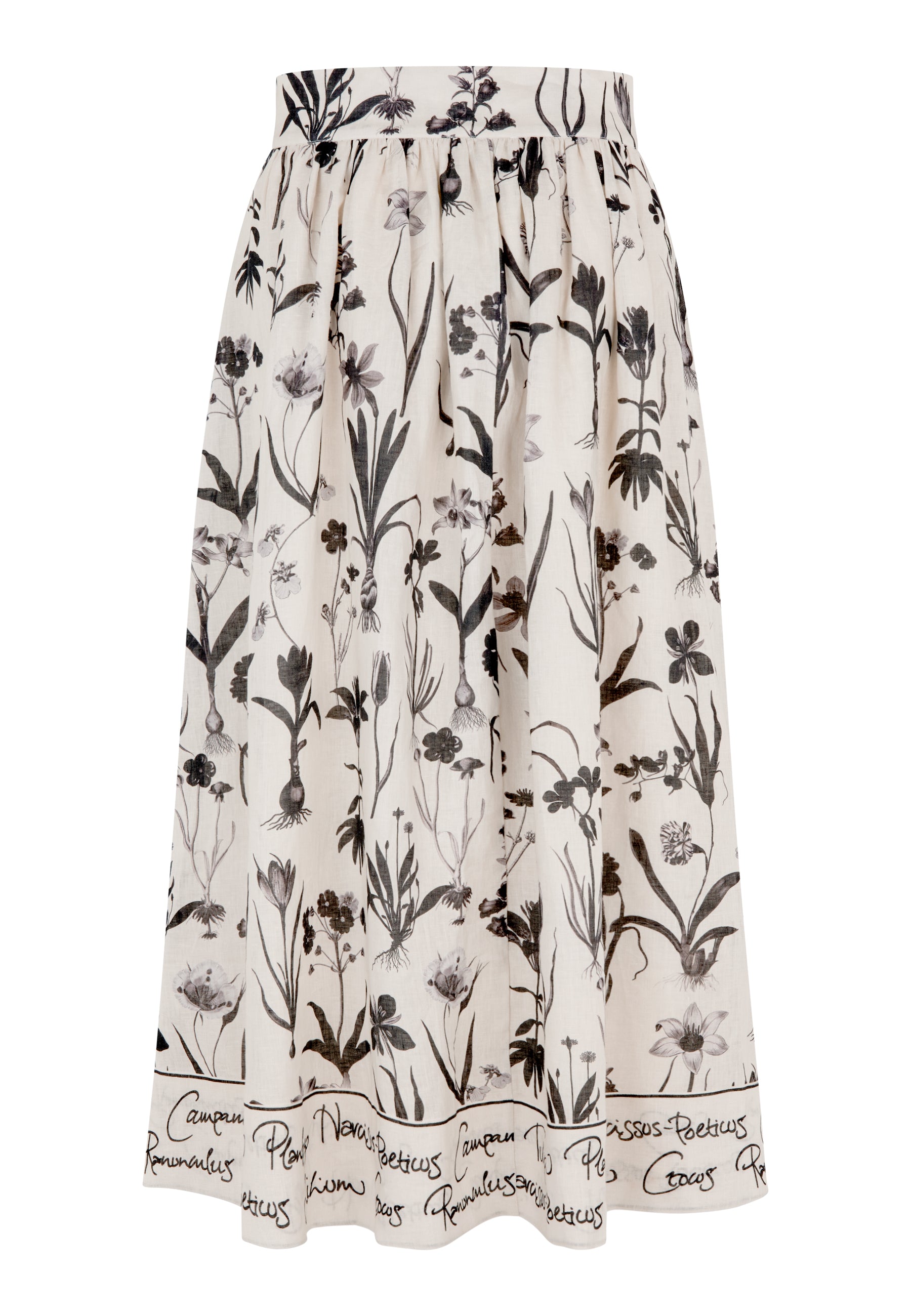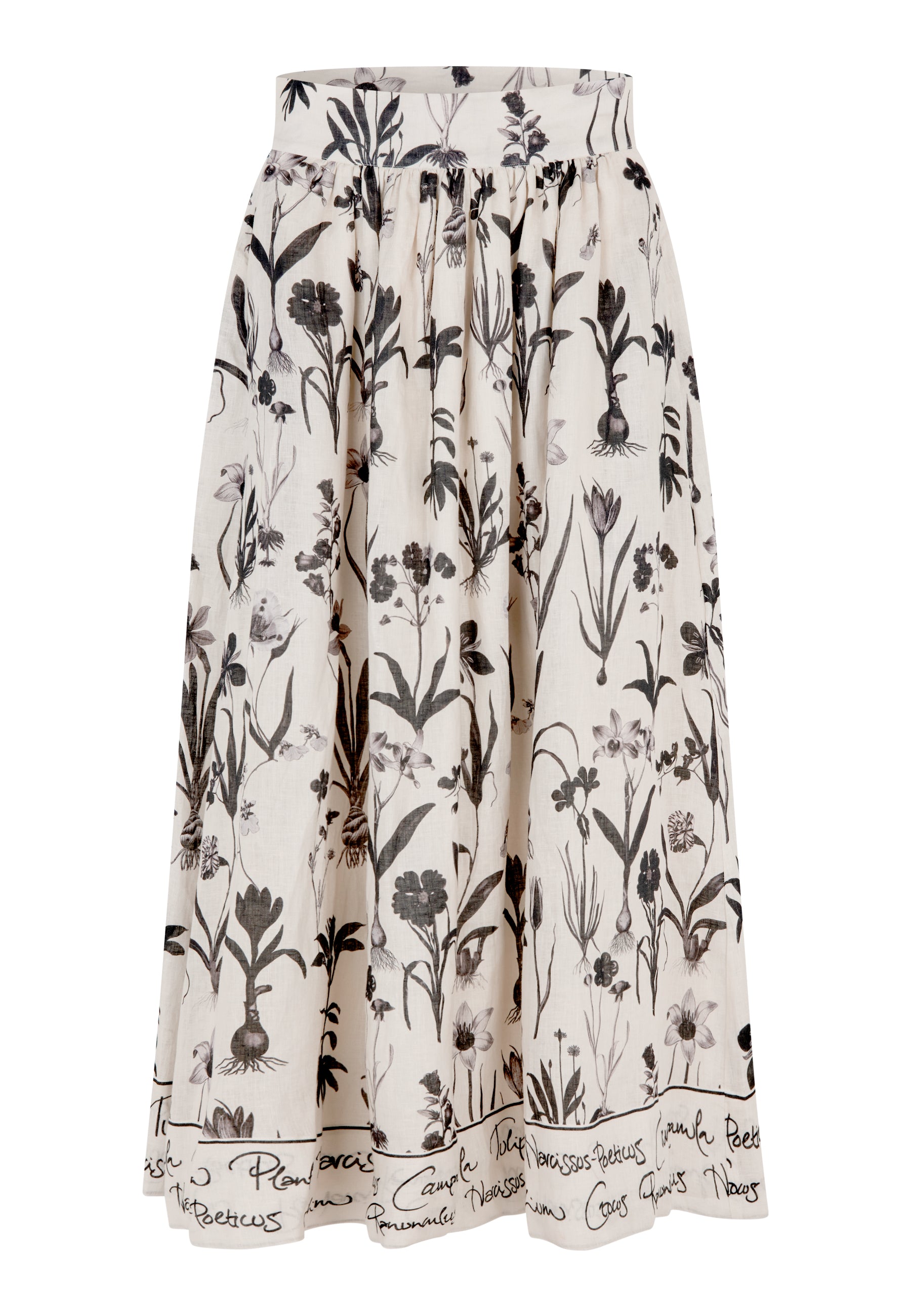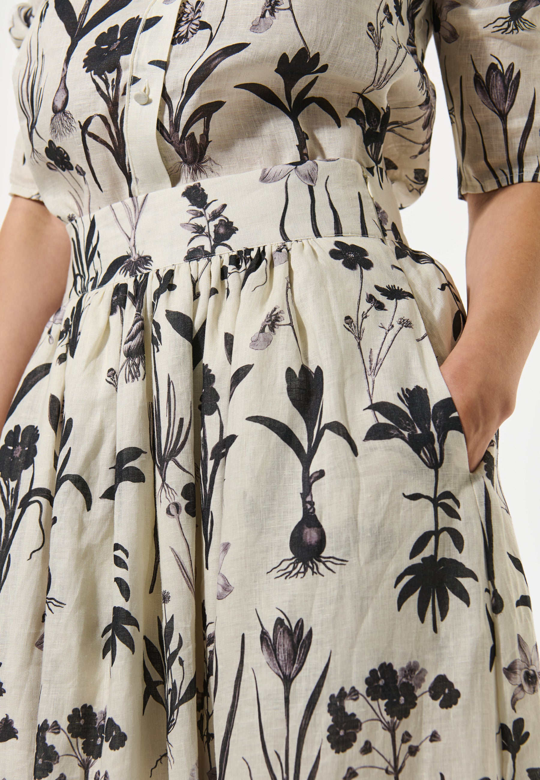 Skøn bomulds nederdel med linning, lommer, masser af vidde samt rynk under linningen. Den lukkes med en diskret lynlås-lukning i siden. Nederdelen er i et cool print bestående af sorte, brune og laveldelfarvede blomster på en lys cremefarvet bund. På manchetten og den nederste kant er fine lantinske blomsternavne.