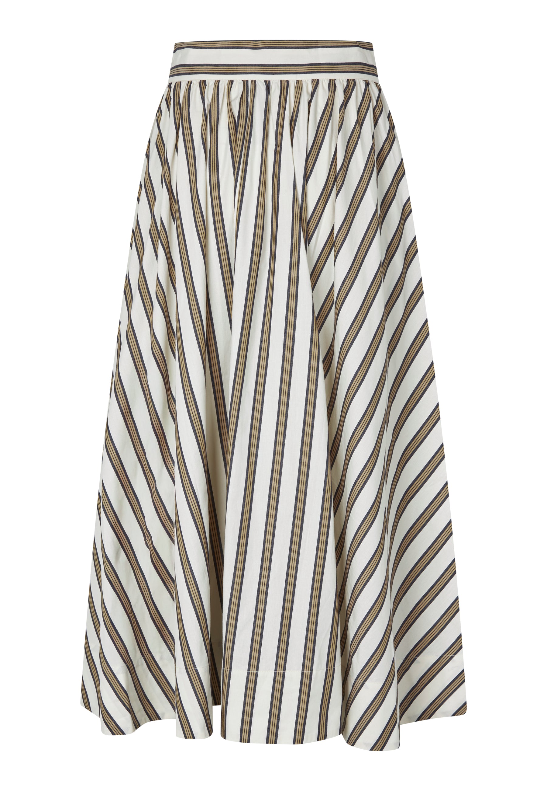 Skøn creamfarvet bomulds nederdel, med et mix af lodrette og skrå striber i beige og sort. Nederdelen har linning, med tvær striber, lommer, masser af vidde samt rynk under linningen. Den lukkes med en diskret lynlås-lukning i siden