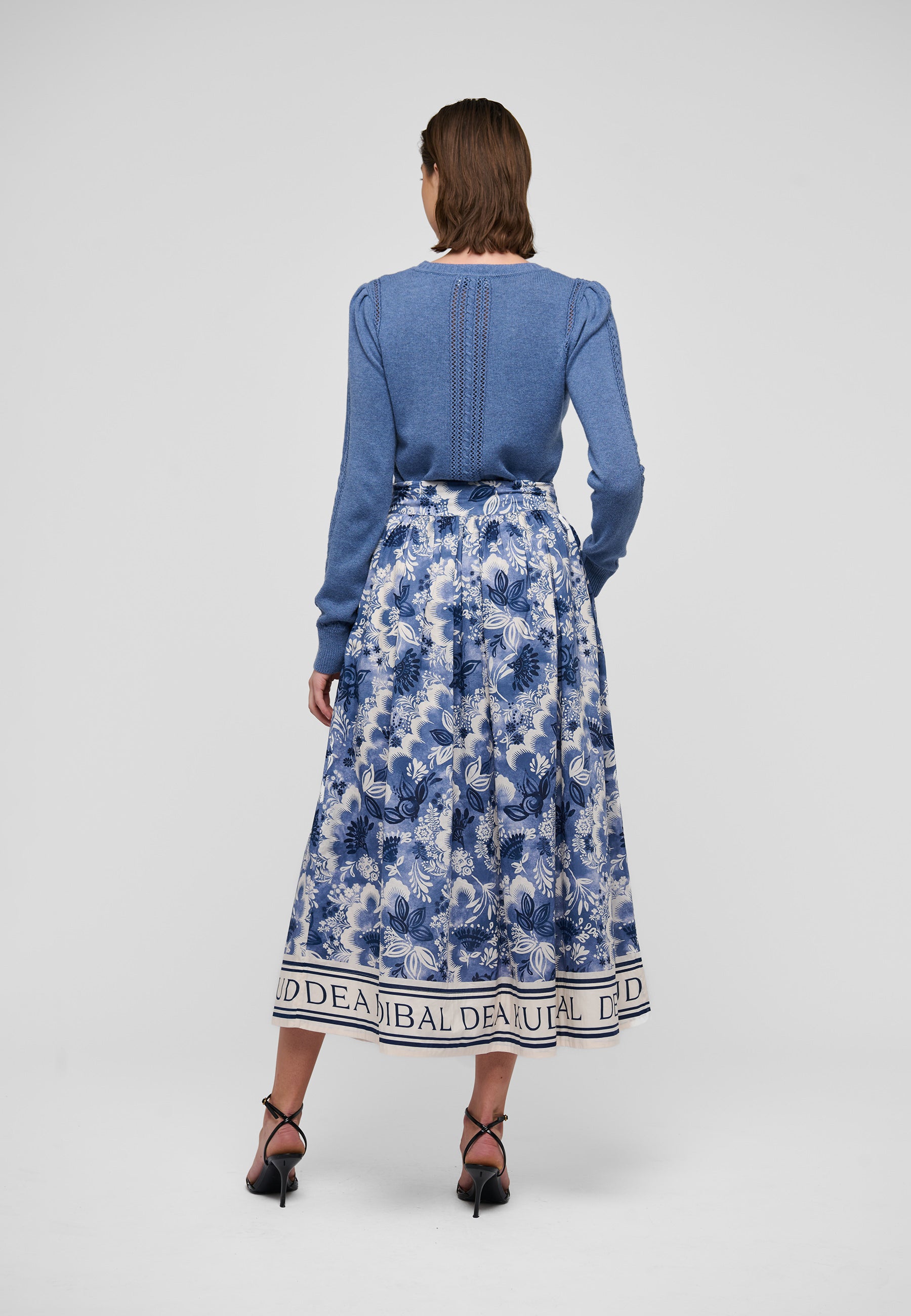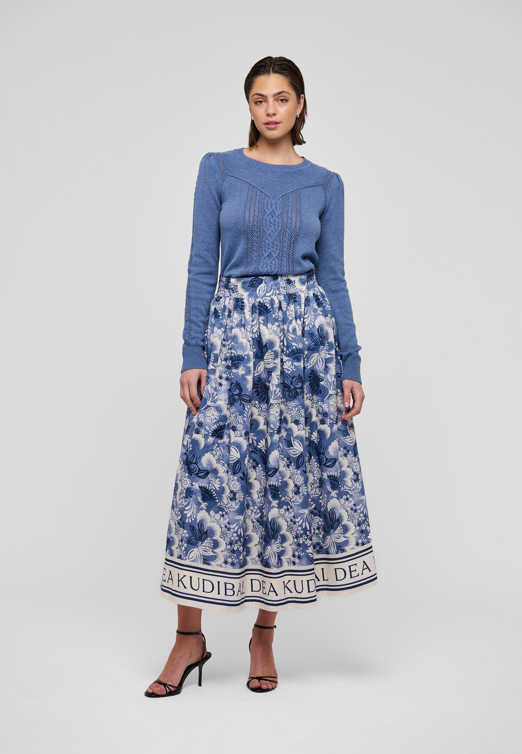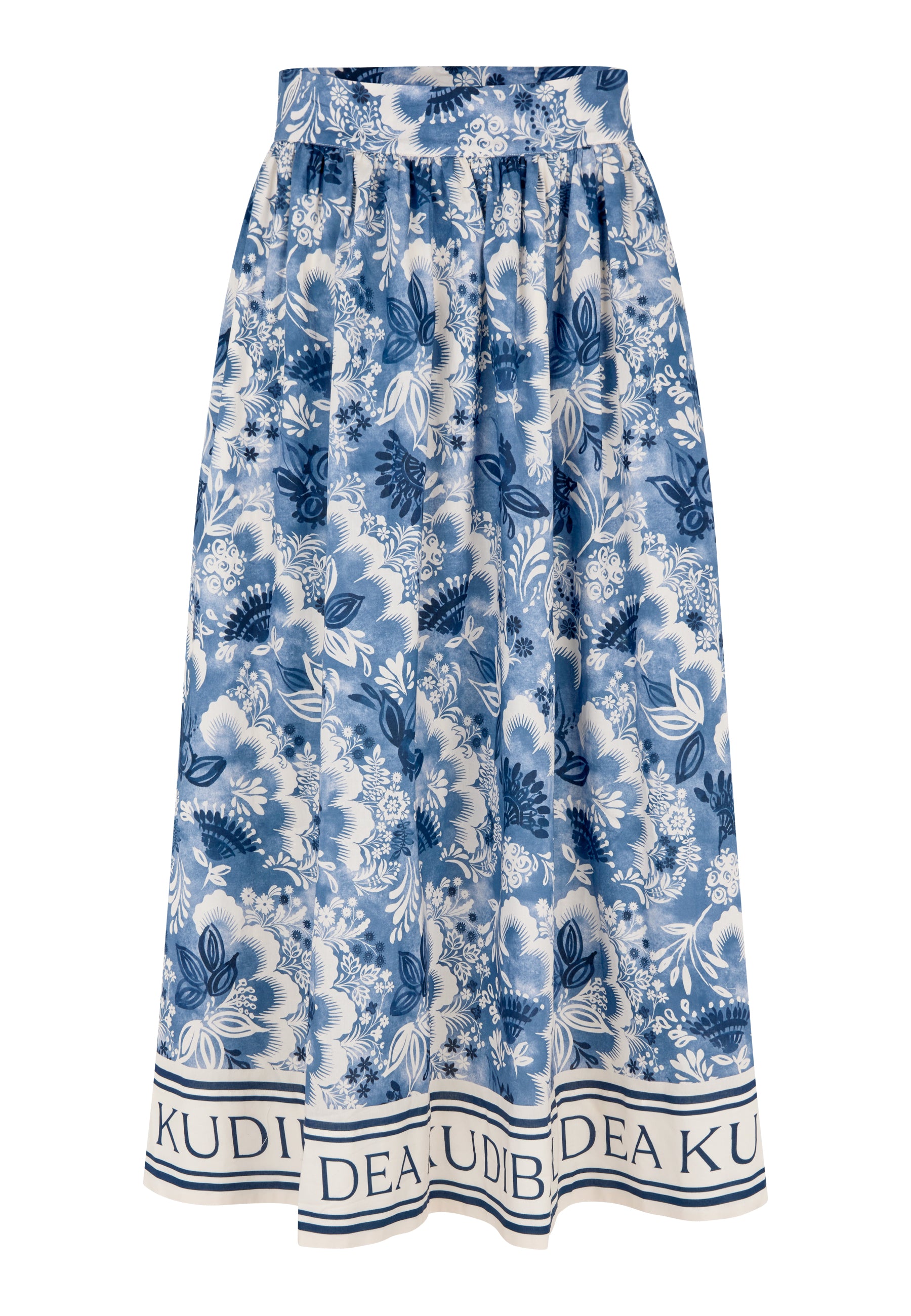 Skøn bomulds nederdel med linning, lommer, masser af vidde samt rynk under linningen. Den lukkes med en diskret lynlås-lukning i siden. Nederdelen er i et skønt abstrakt blomsterprint bestående af hvide og blålige nuancer, nederst har den en bord med logoprint.