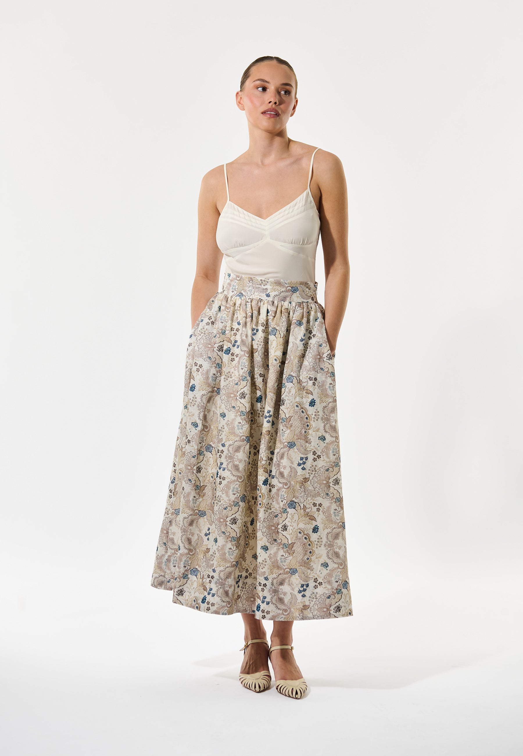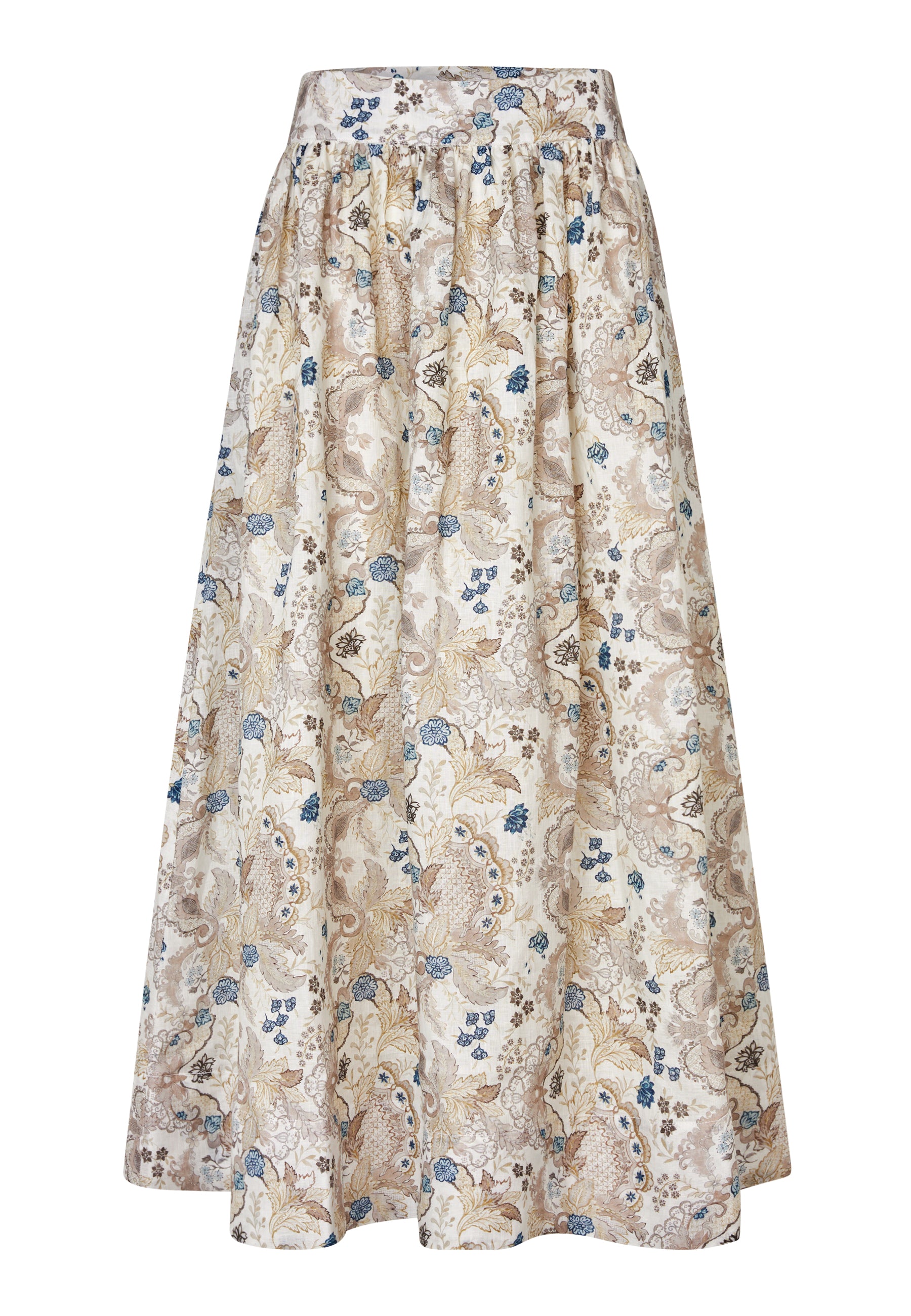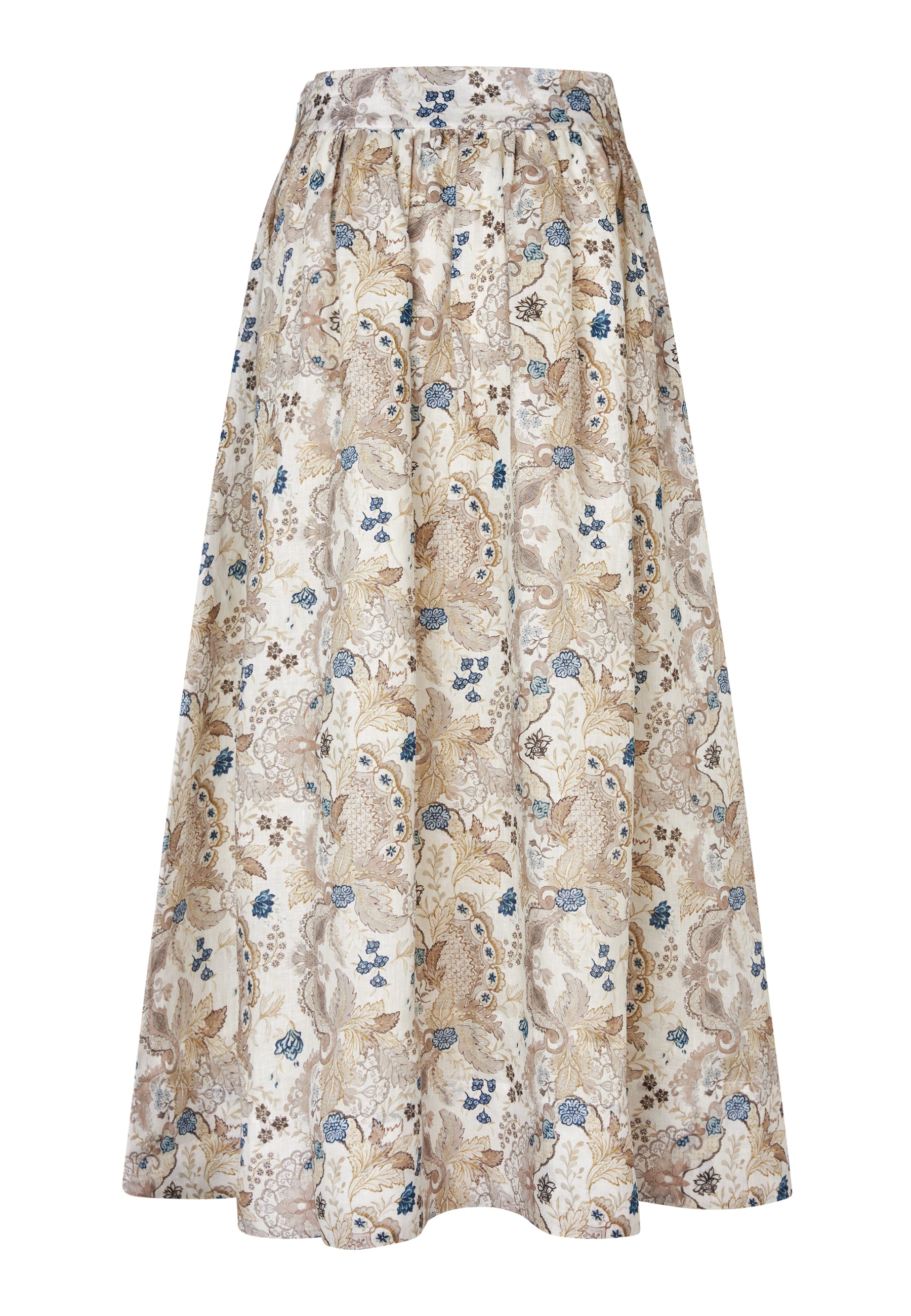 Skøn bomulds nederdel med linning, lommer, masser af vidde samt rynk under linningen. Den lukkes med en diskret lynlås-lukning i siden. Nederdelen er i et delikat feminint print i creme nuancer tilsat lidt kontrast i form af små blå blomster.