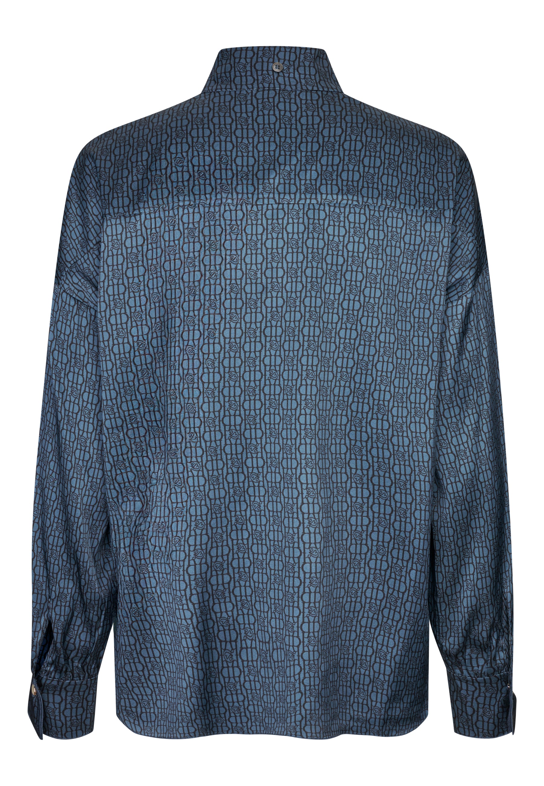 Smuk enkel silkeskjorte med skjult knapluning, høj kinakrave, lav skuldersøm og en fin manchet med dobbelt-lags detalje. Skjorten er i en smuk petroliumsblå farve med sort logo print.