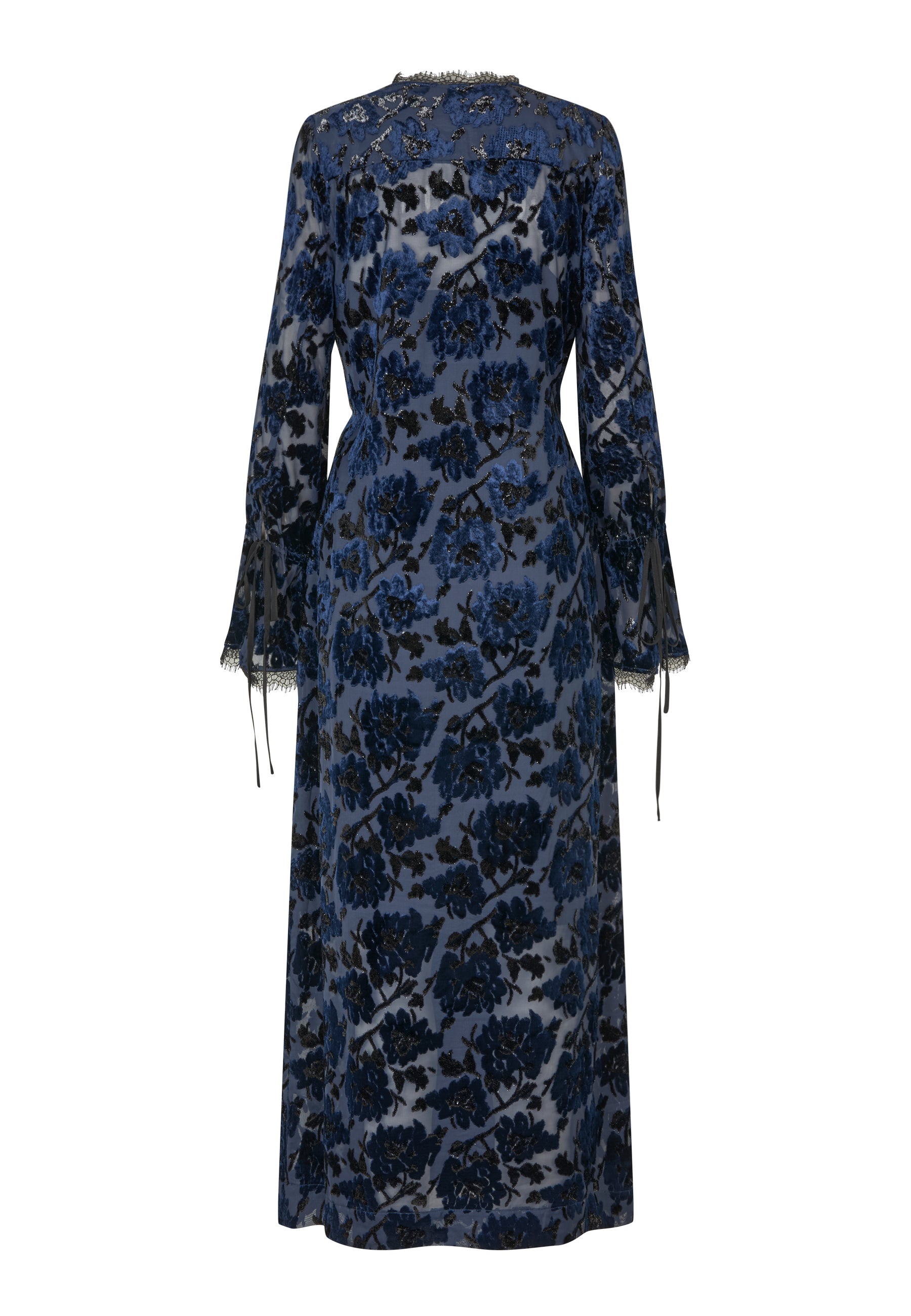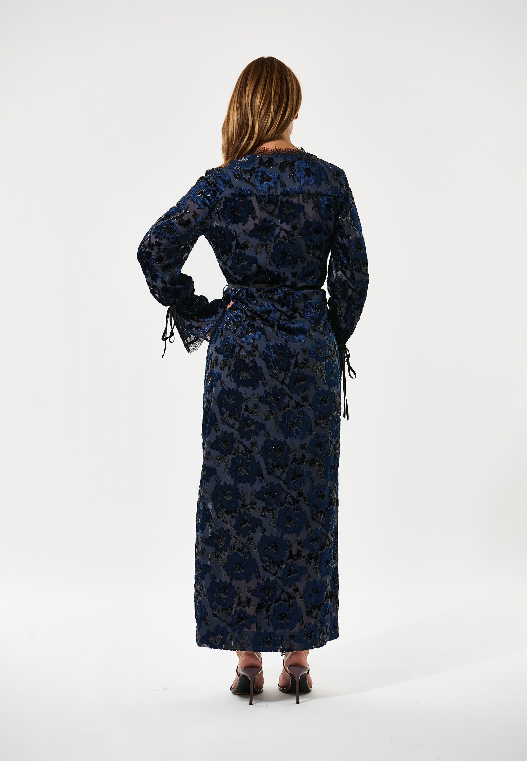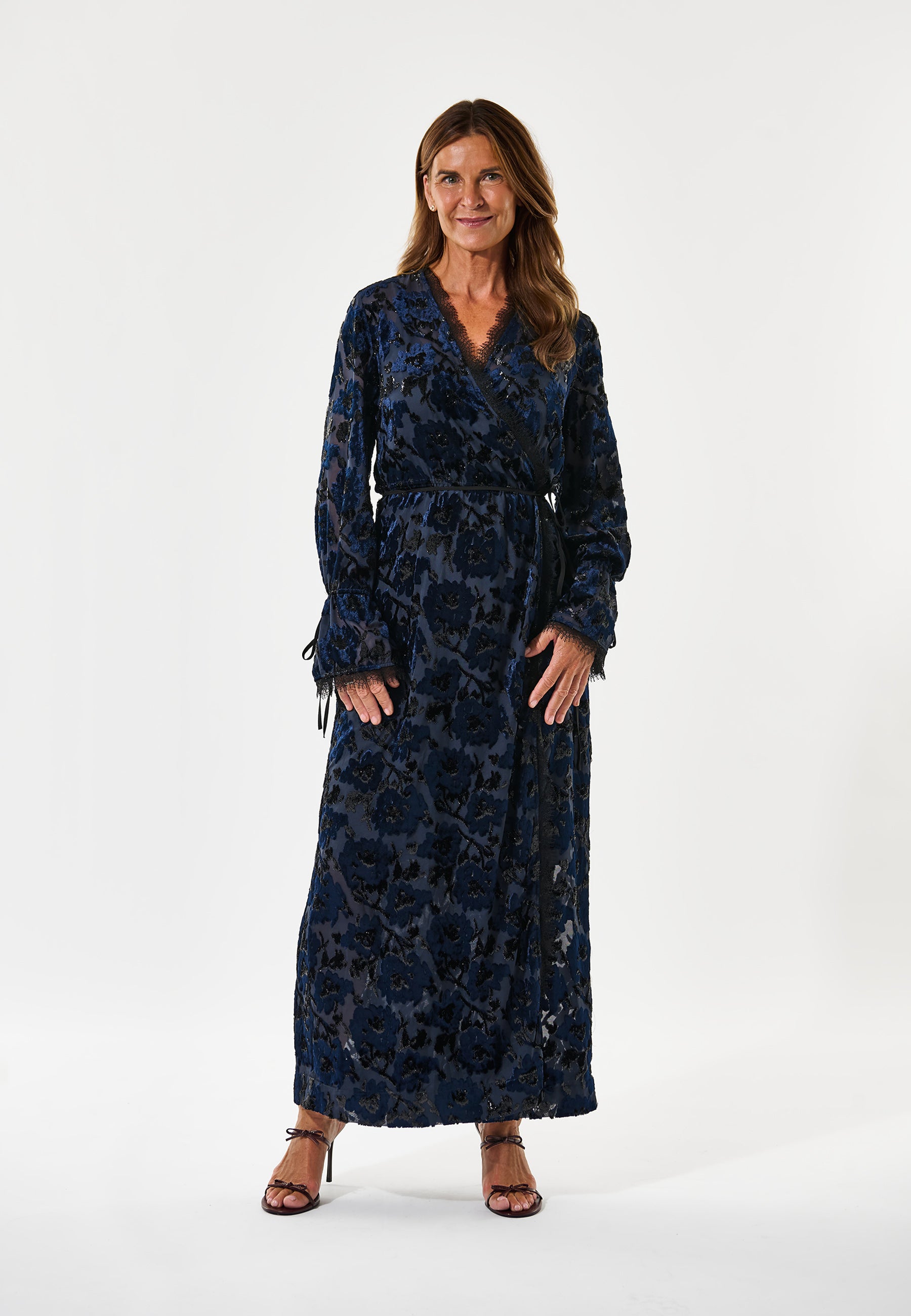 Smuk lang slå-om kjole  burn-out silkevelour. Kjolen har en bred manchet som falder ud over hånden, og fin blondedetalje i halsudskæring og på manchet.