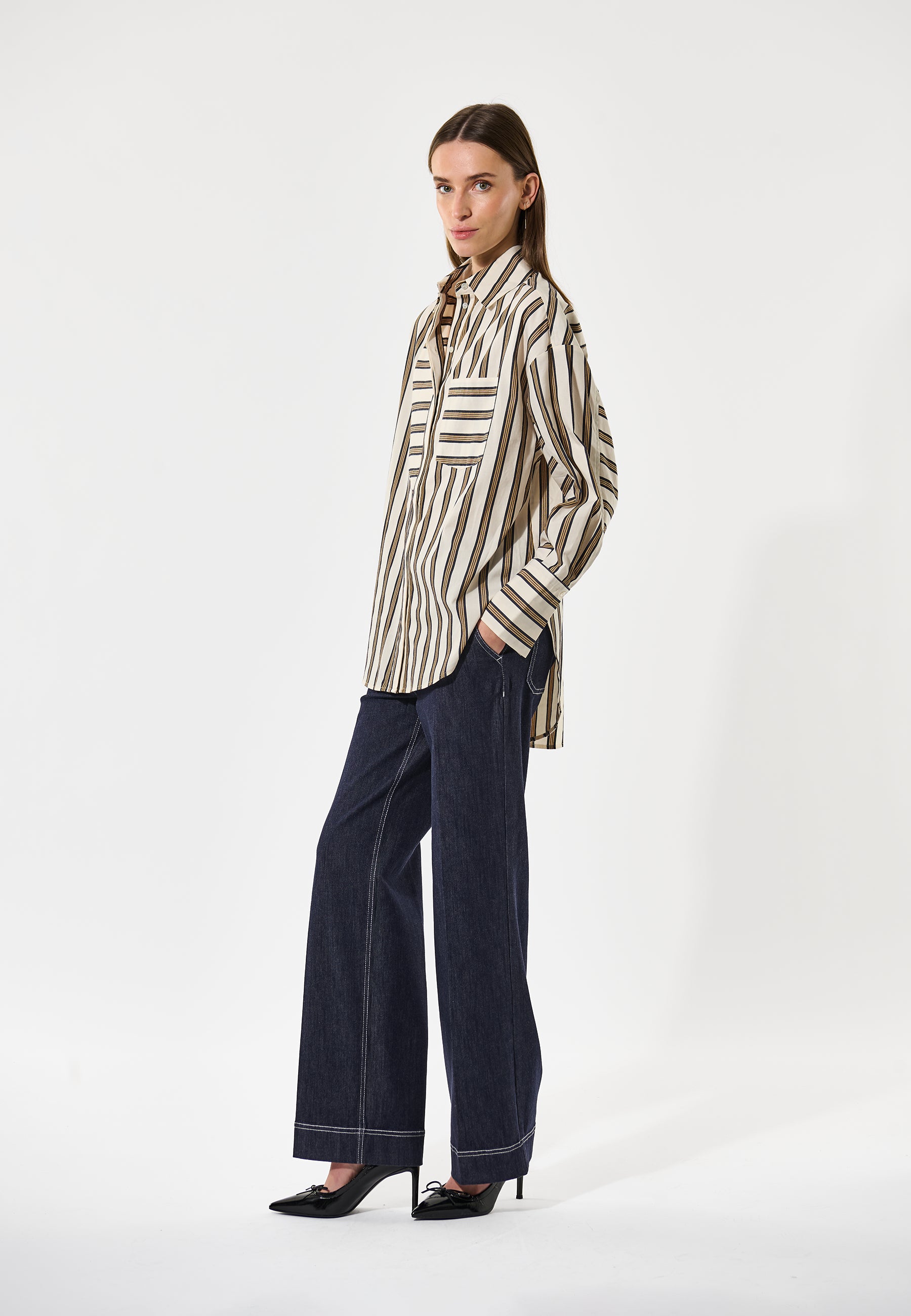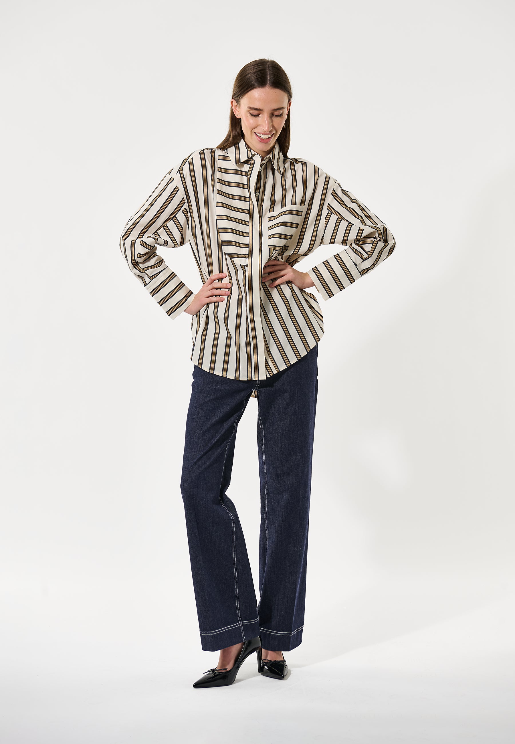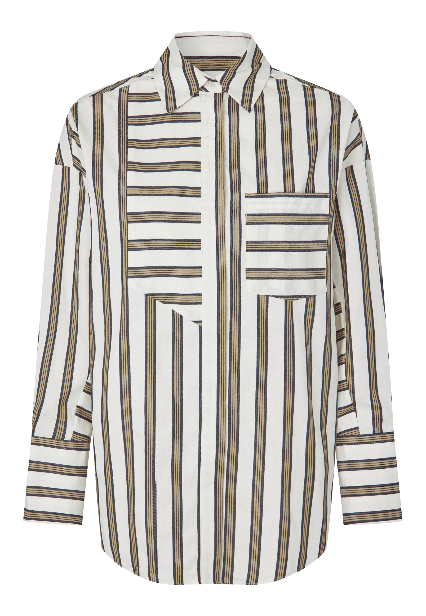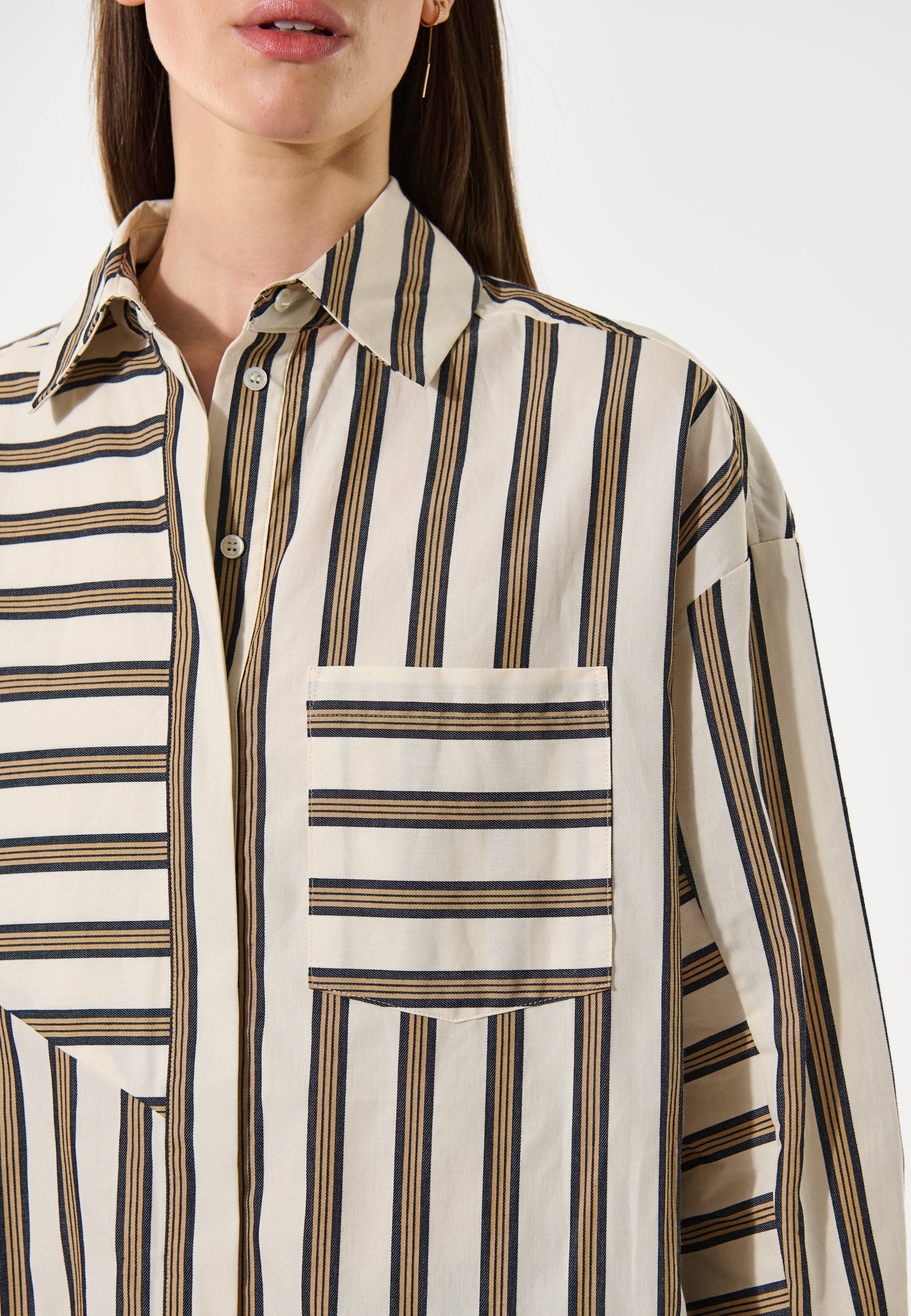 Oversize bomuldsskjorte med med klassisk krave, samt sorte og creme farvede striber.