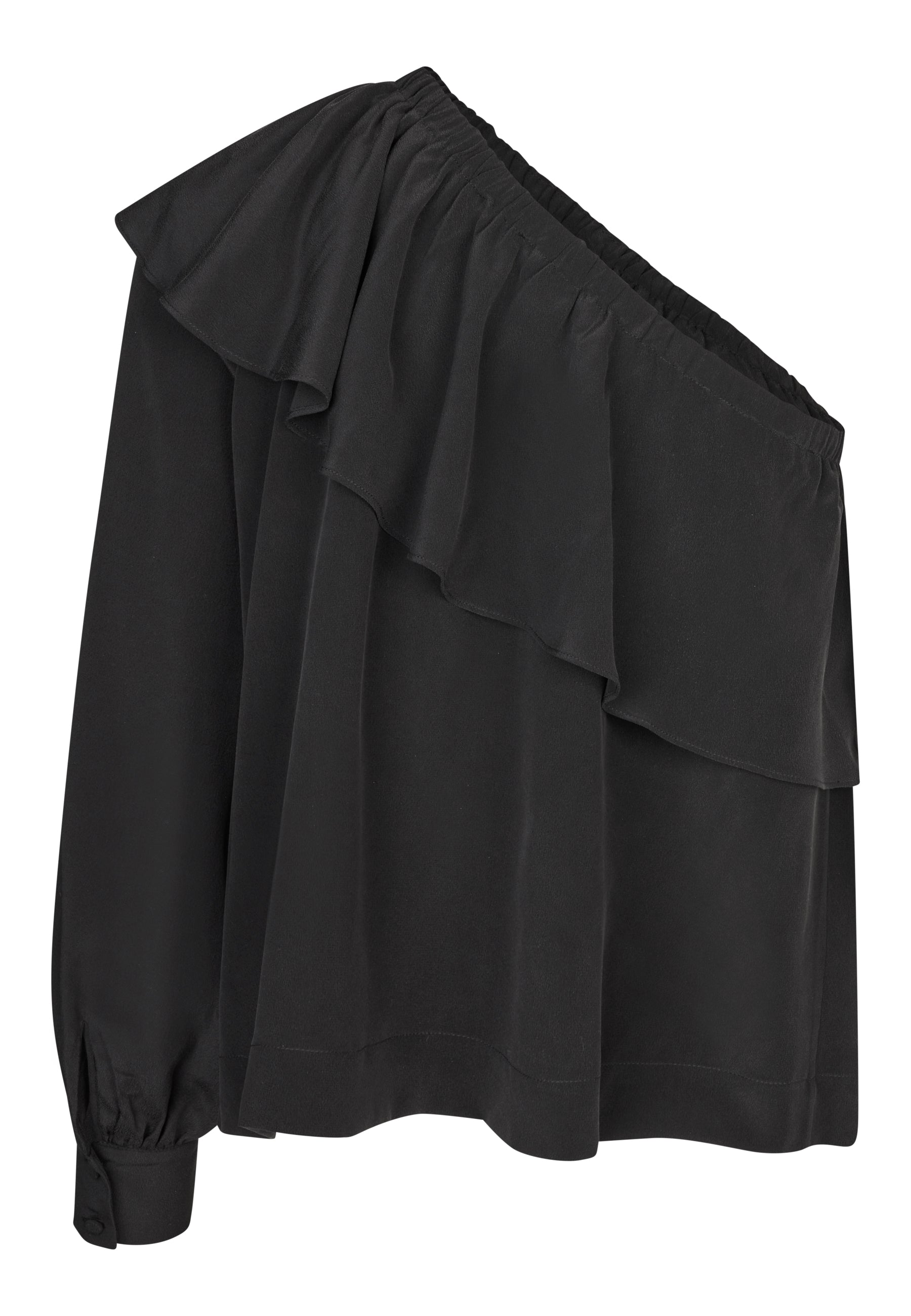 Cool asymetrisk silke bluse, blusen har bred flæsekant og ærme med klassisk manchet.
