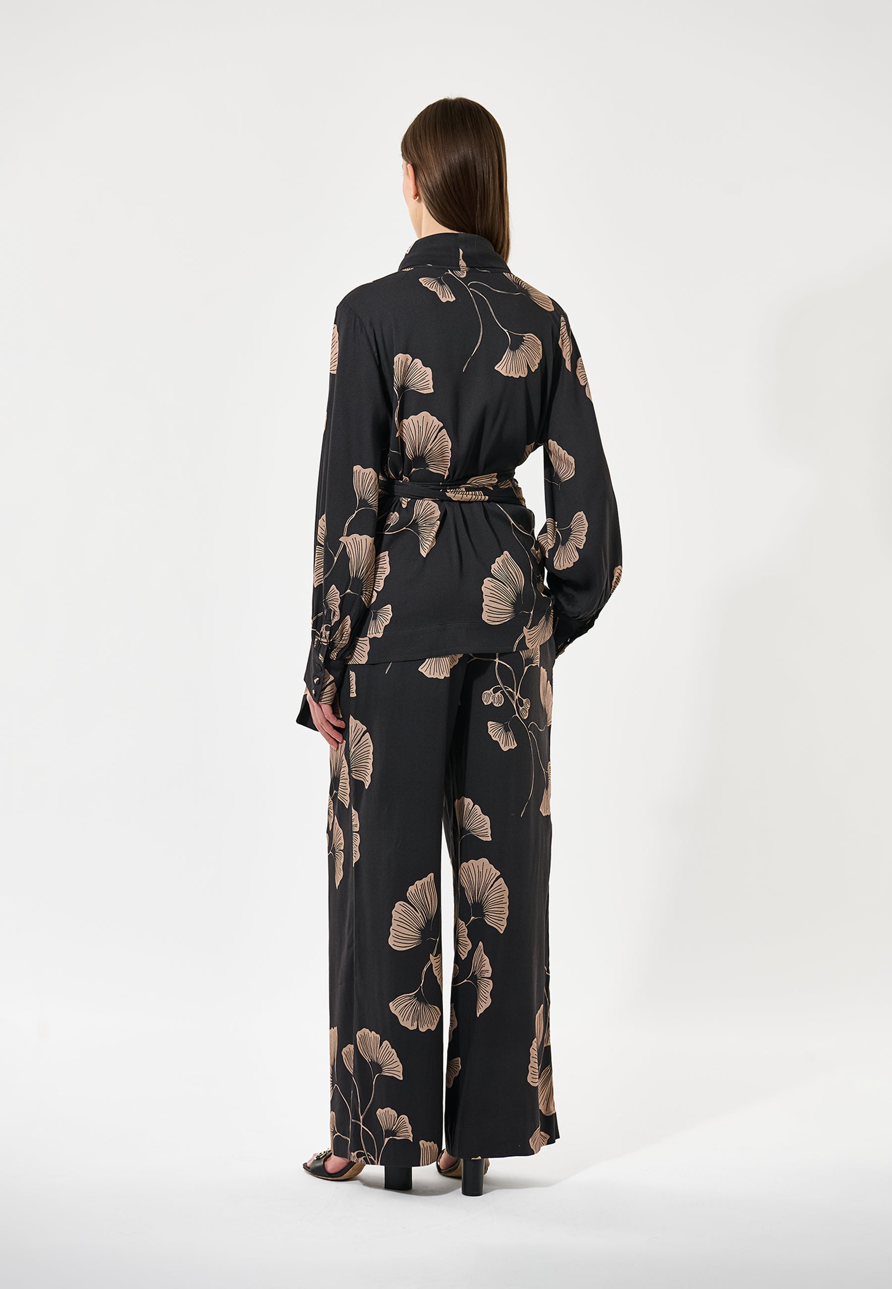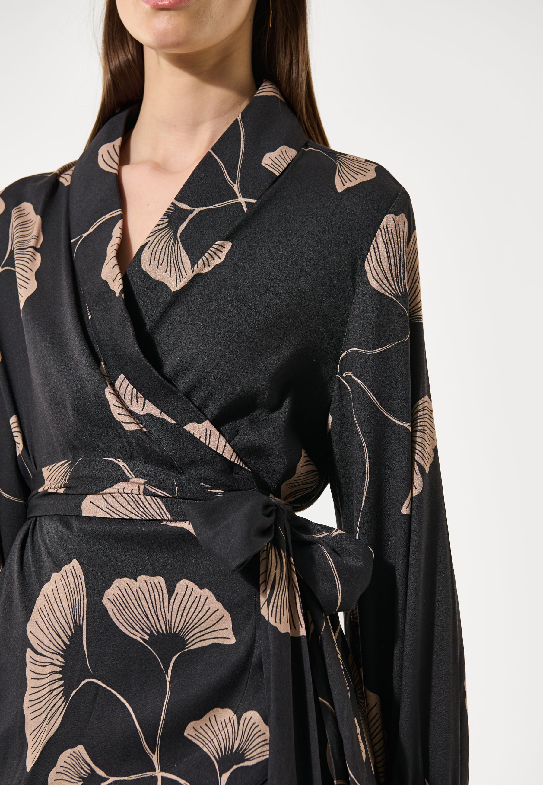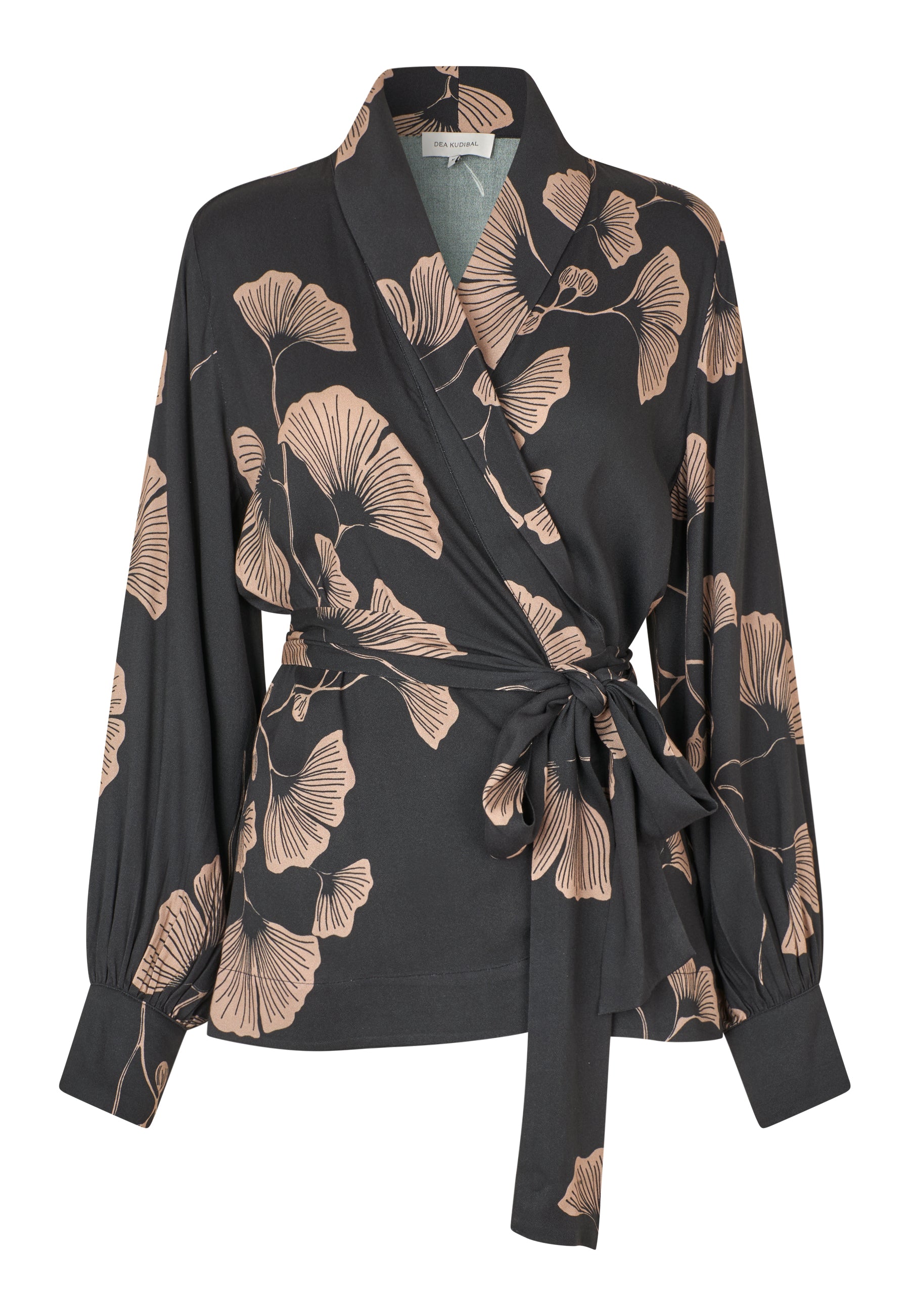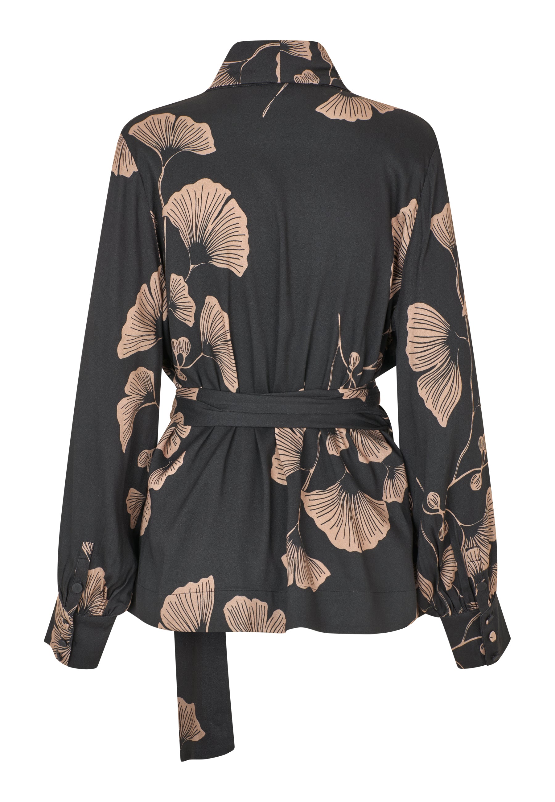Feminin slåom skjorte med sjalskrave, brede ærmer med rynk ved den klassiske manchet, som har fine betrukne knapper.