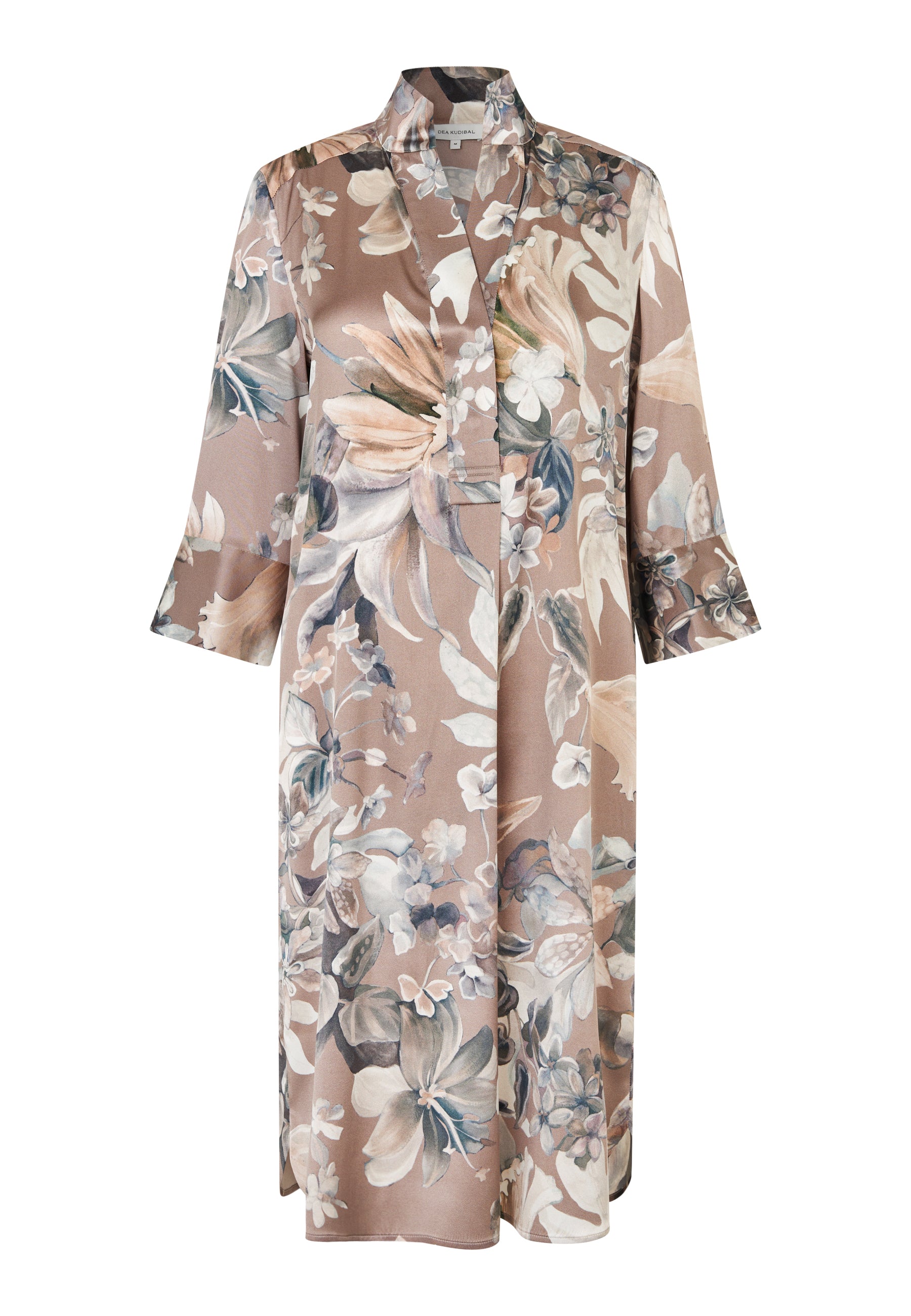 Skøn silketunikakjole i et skønt blomsterprint bestående af creame, gyldne, hvide og grålige nuancer. Kjolen har brede manchetter, stolpelukningen og kina krave.