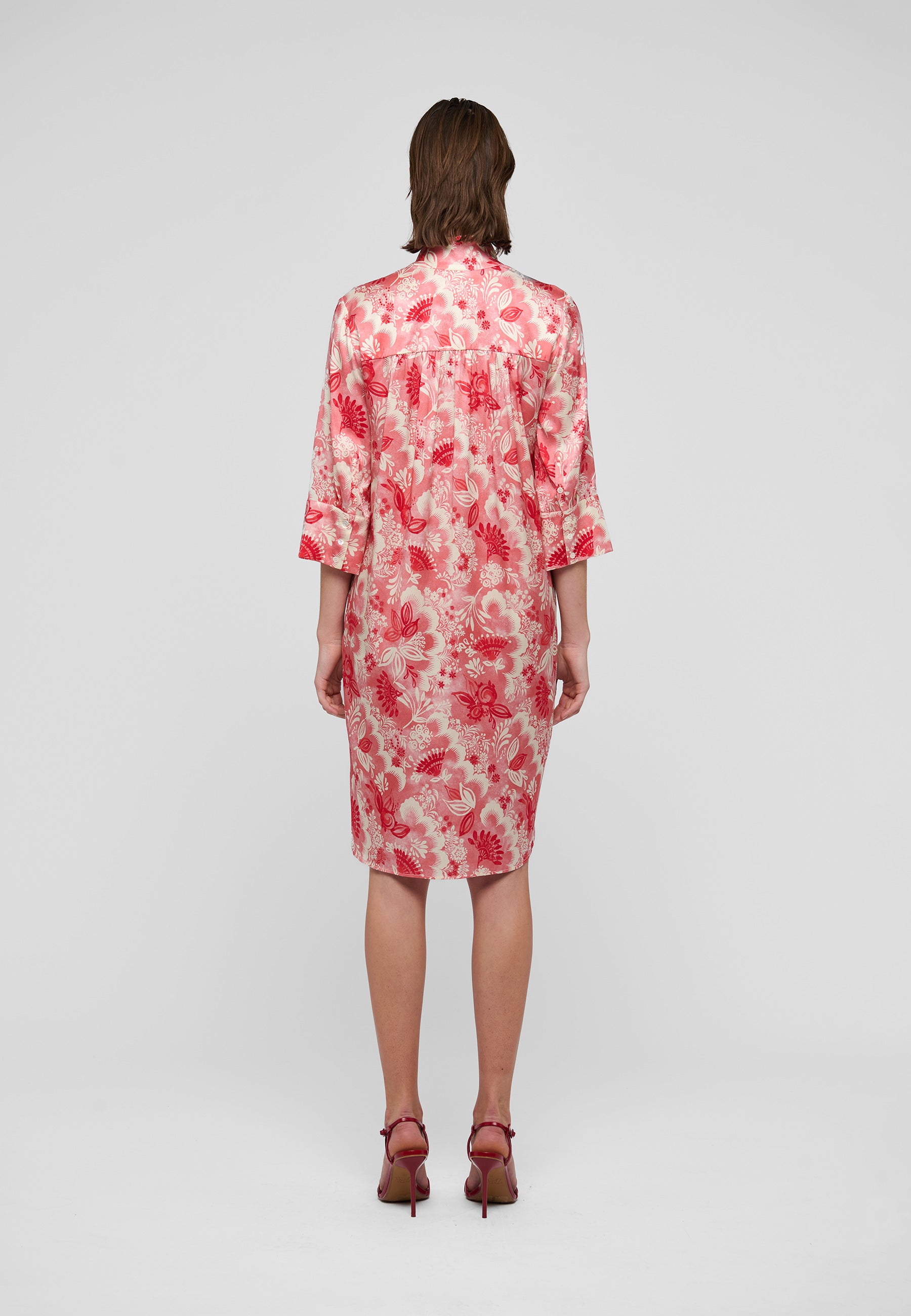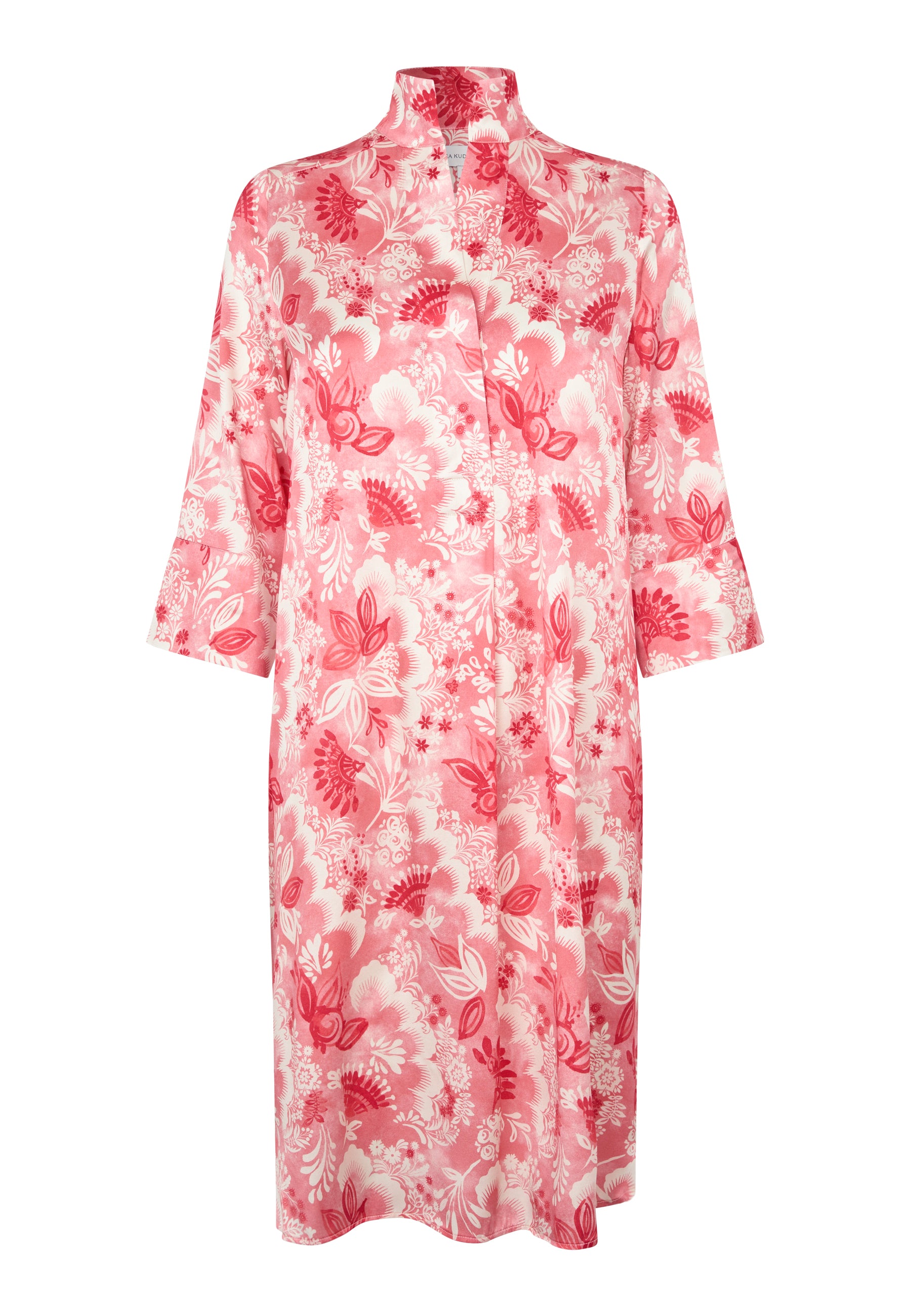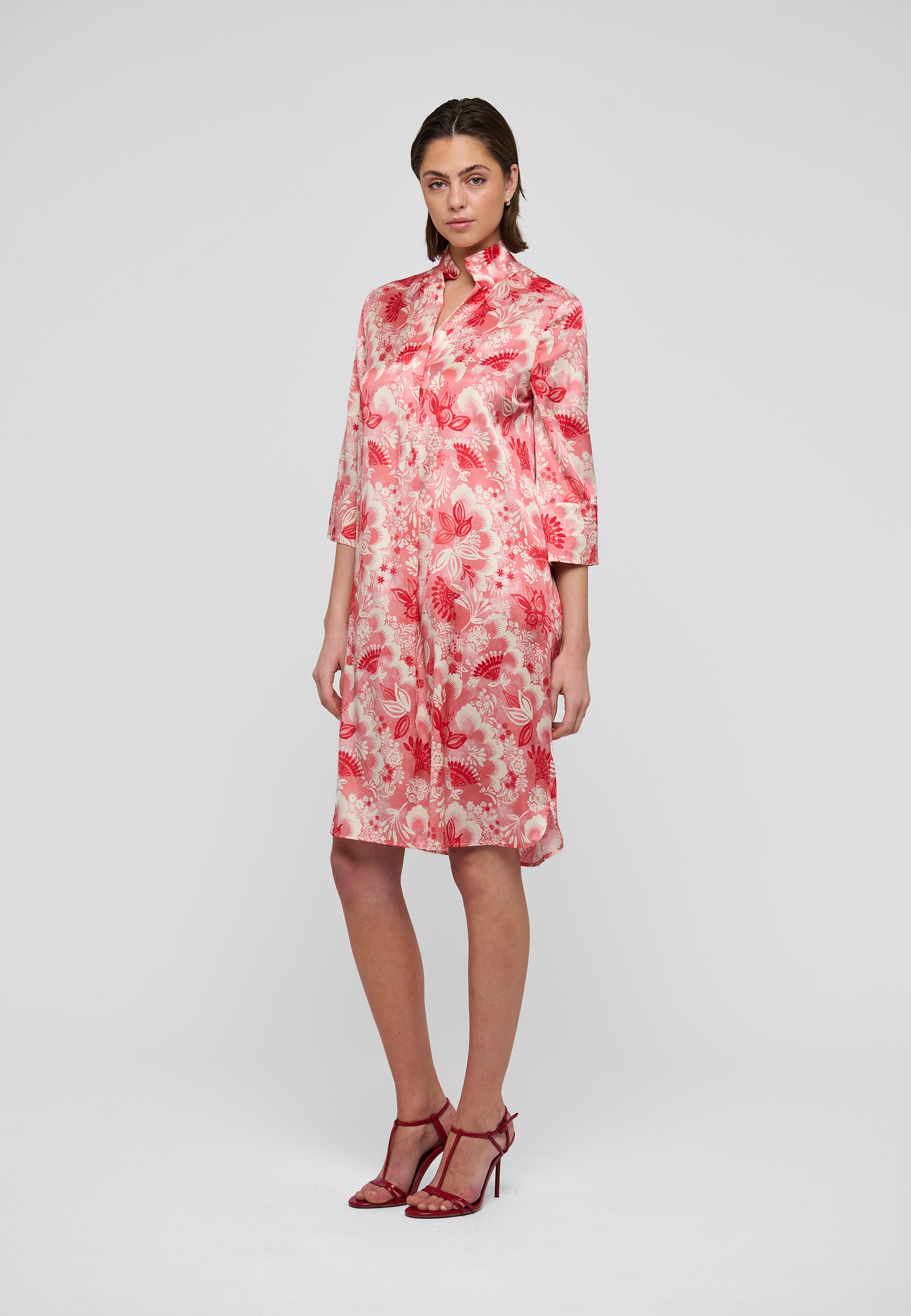 Skøn silke tunikakjole i fint blomsterprint bestående af røde nuancer og cremehvid.