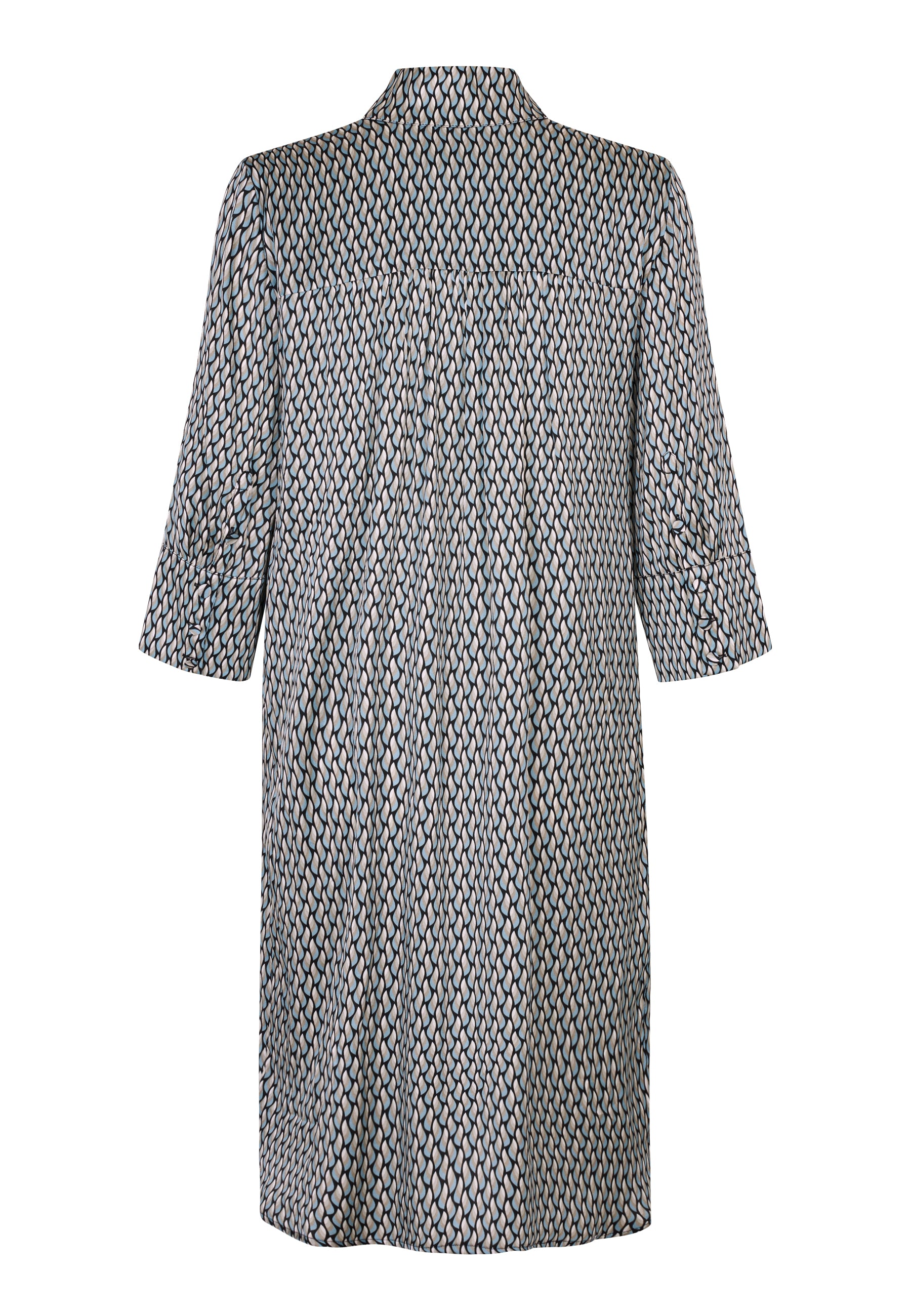 Smuk silketunika kjole i et enkelt grafisk vintage print bestående af sort, lyseblå og cremede-nuancer. Kjolen har stolpelukning, høj krave, trekvartærme med bred manchet og en rundet slids forneden