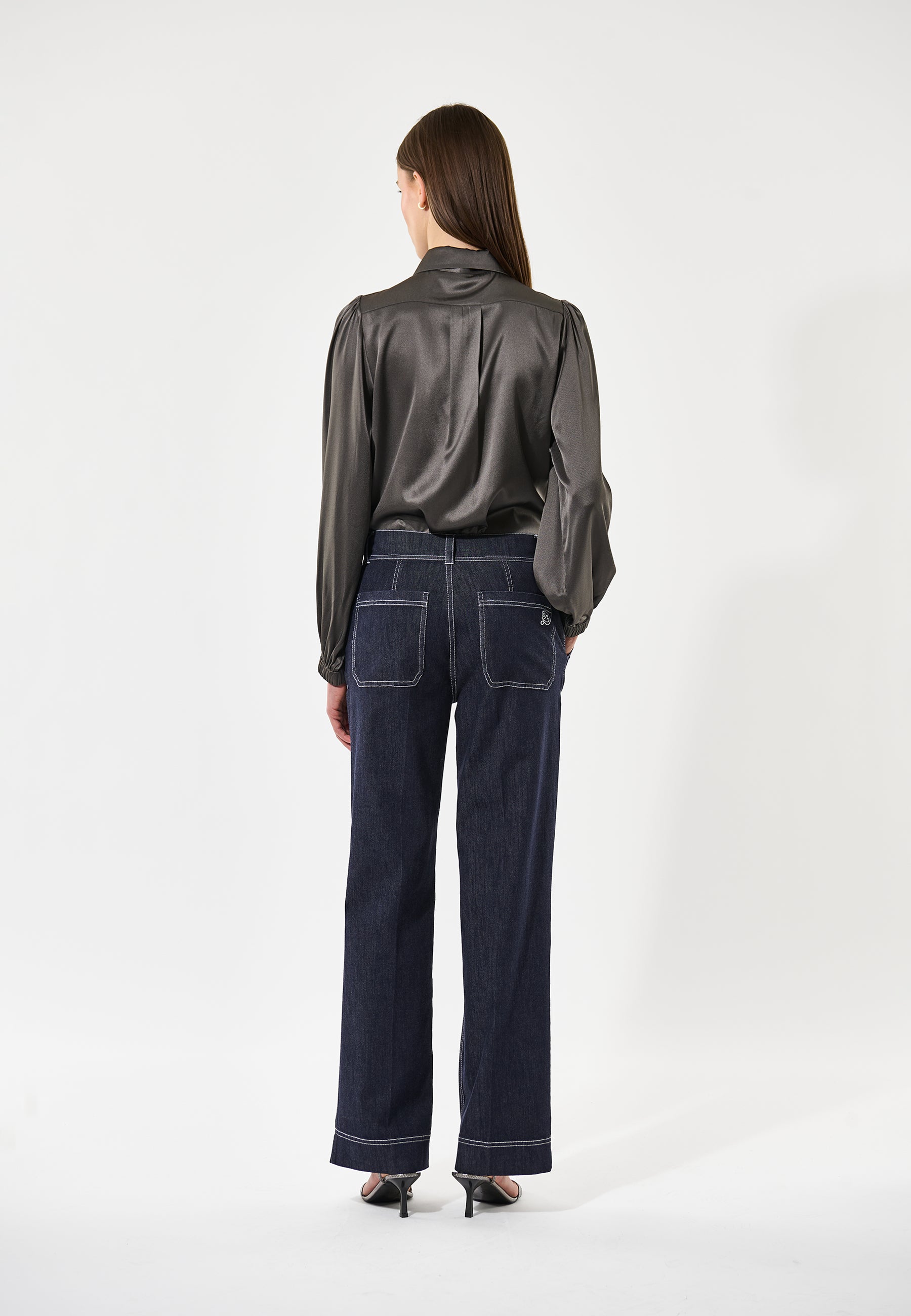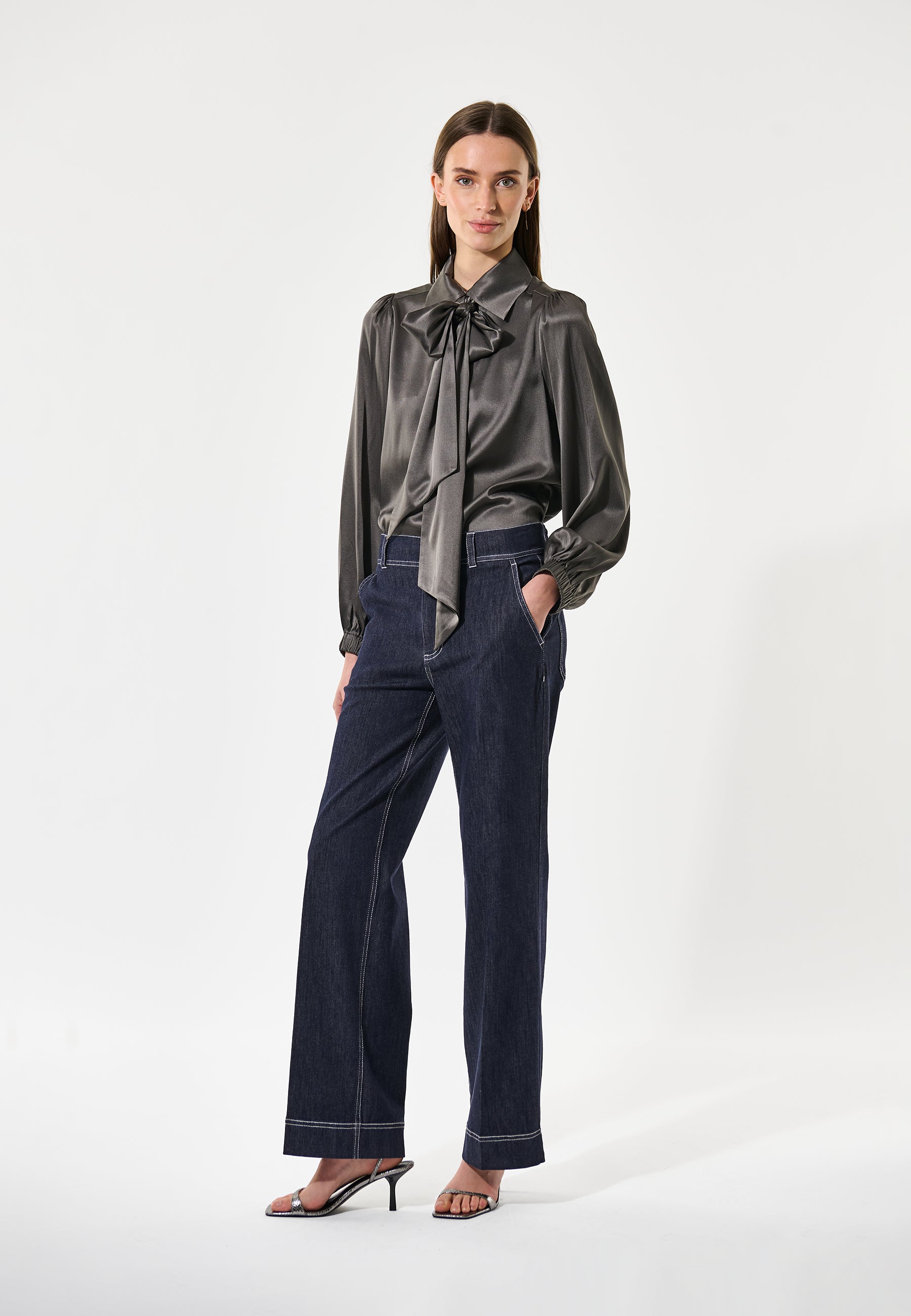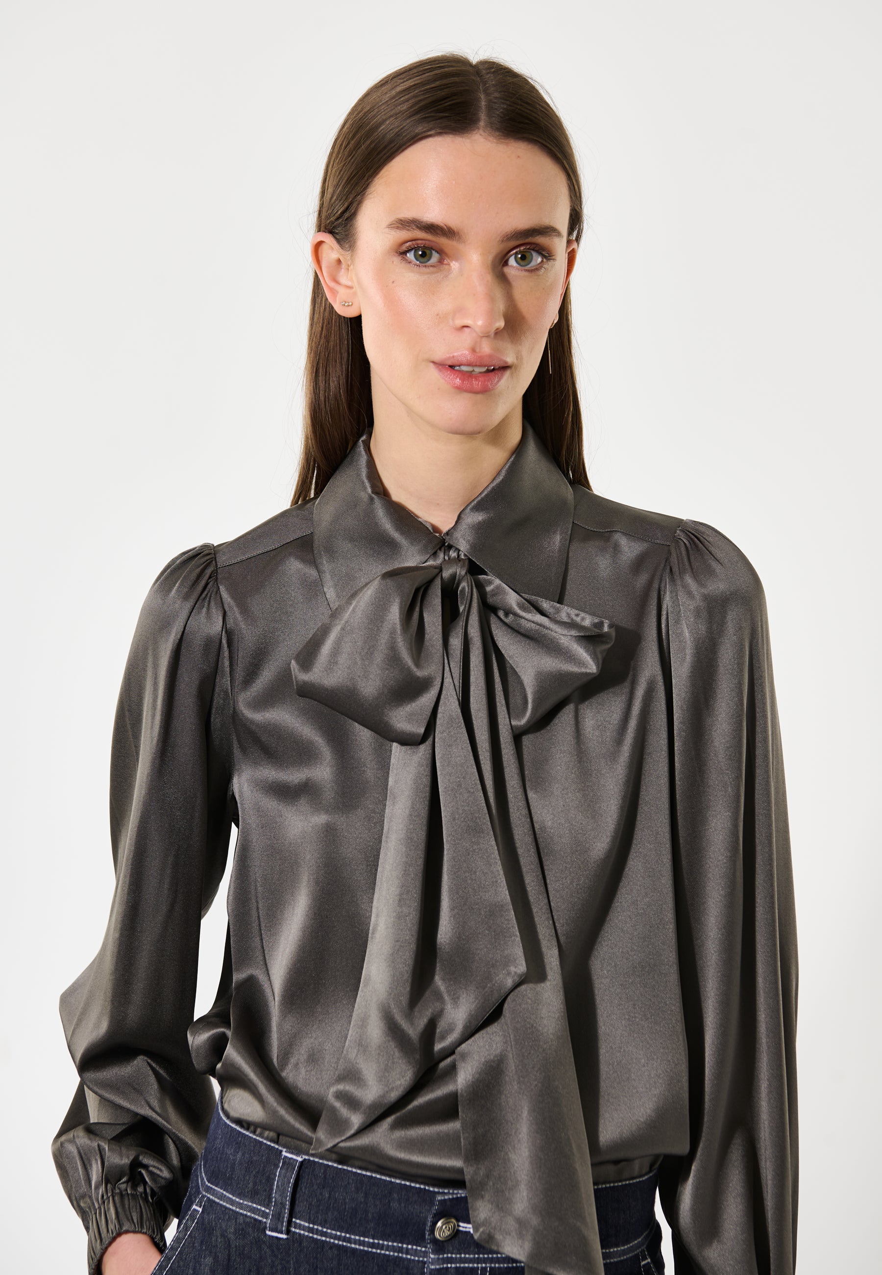 Smuk silketunika med skjortekrave og aftageligt bindebånd, i en smuk karamelfarvet silke. Tunikaen har bærestykke med læg, og vidde i ærmet som har elastikmanchet.