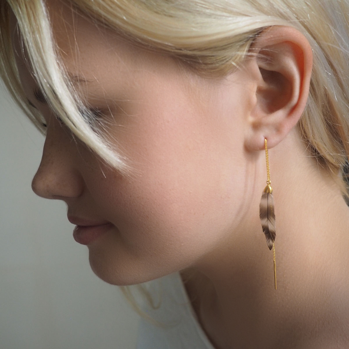 Delikat Kædeørering i forgyldt sølv med en natur hanefjer i smukke beige/brun/grå farve. Øreringen består af en tynd forgyldtkæde i med en naturfjer for enden. OBS da det er naturfjer kan de variere i forhold til farven på billedet.