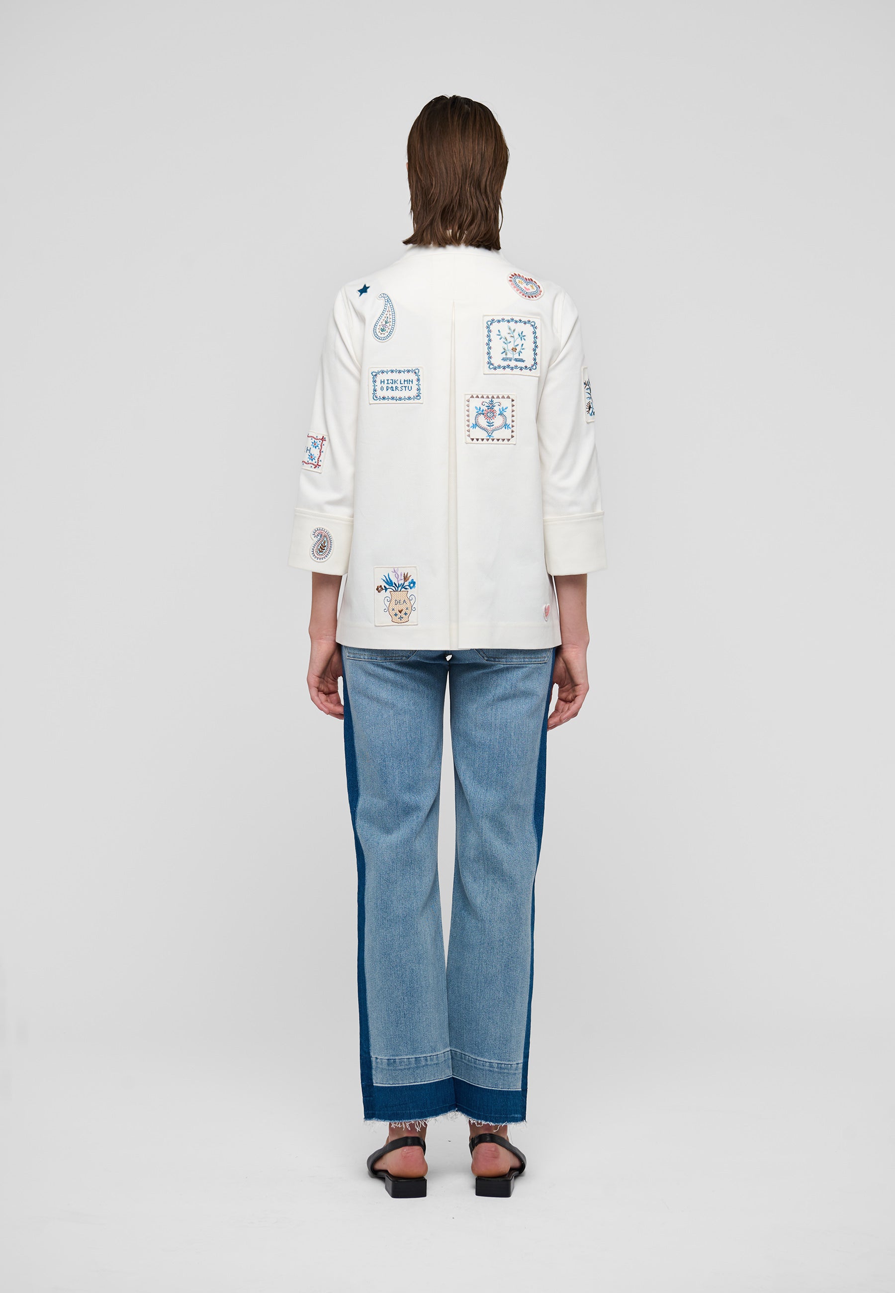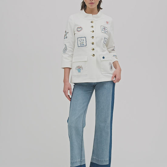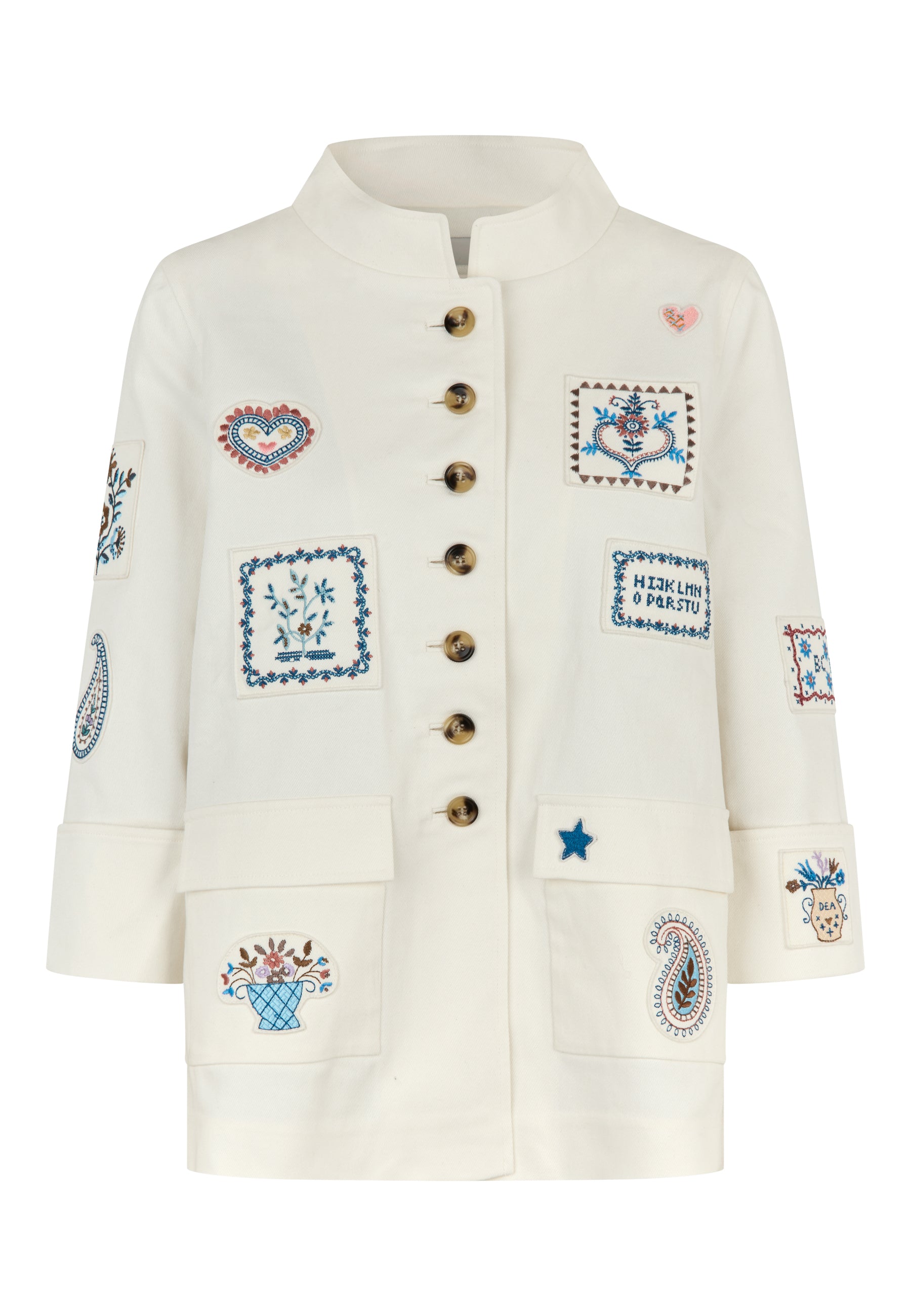 Cool "worker-jacket" med skønne patches. Jakken er i et løst fit, har kinakrave, brede opsmøgede manchetter og wienerlæg bag.