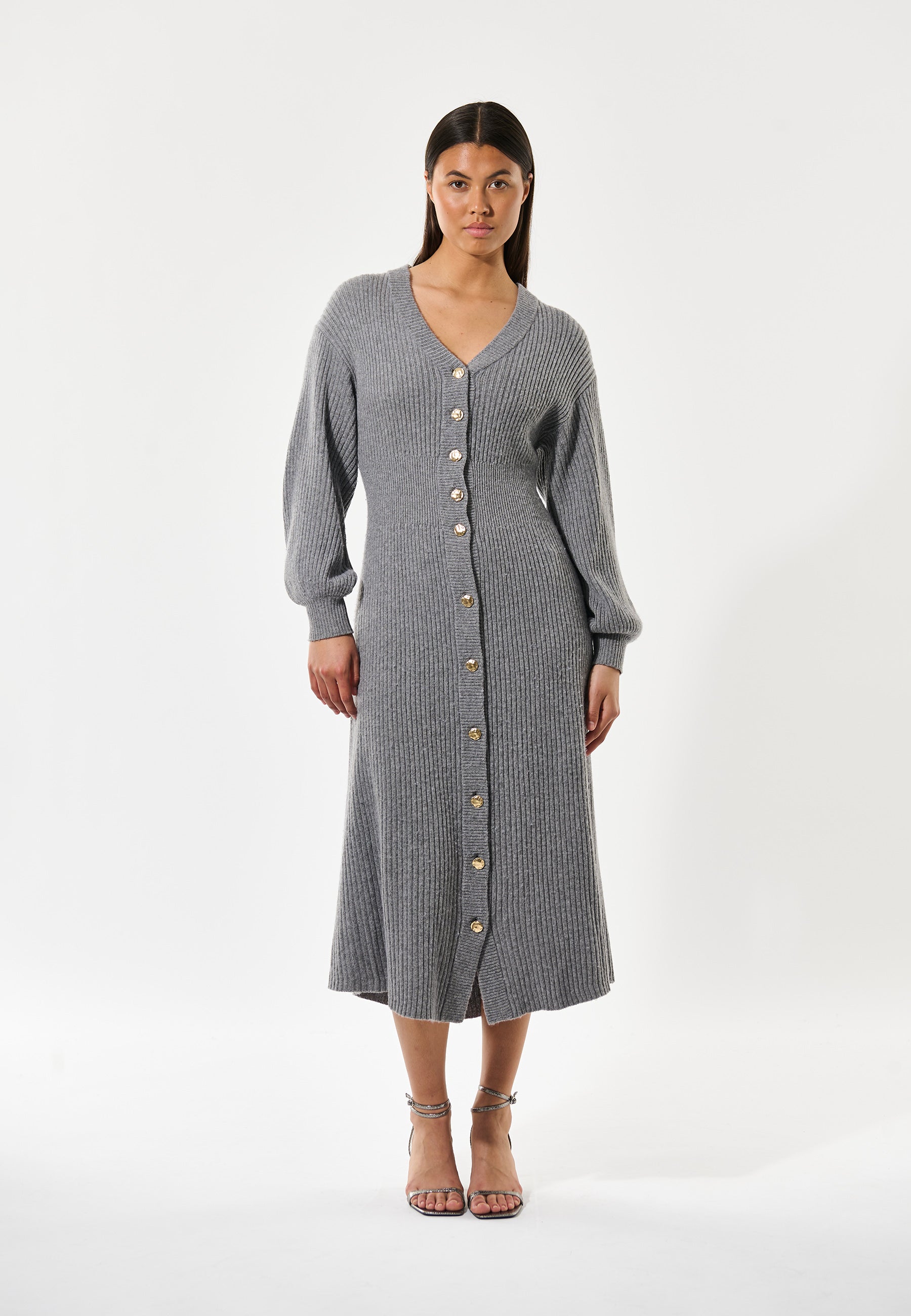 Lang grå-melange strikkjole/cardigan i lækker blød lambswool blanding. Cardiganen har brede ærmer med rib manchet, bankede gyldne knapper, samt en rib-detalje i taljen som giver den et smukt feminint look. Lukket kan cardiganenbruges som kjole.