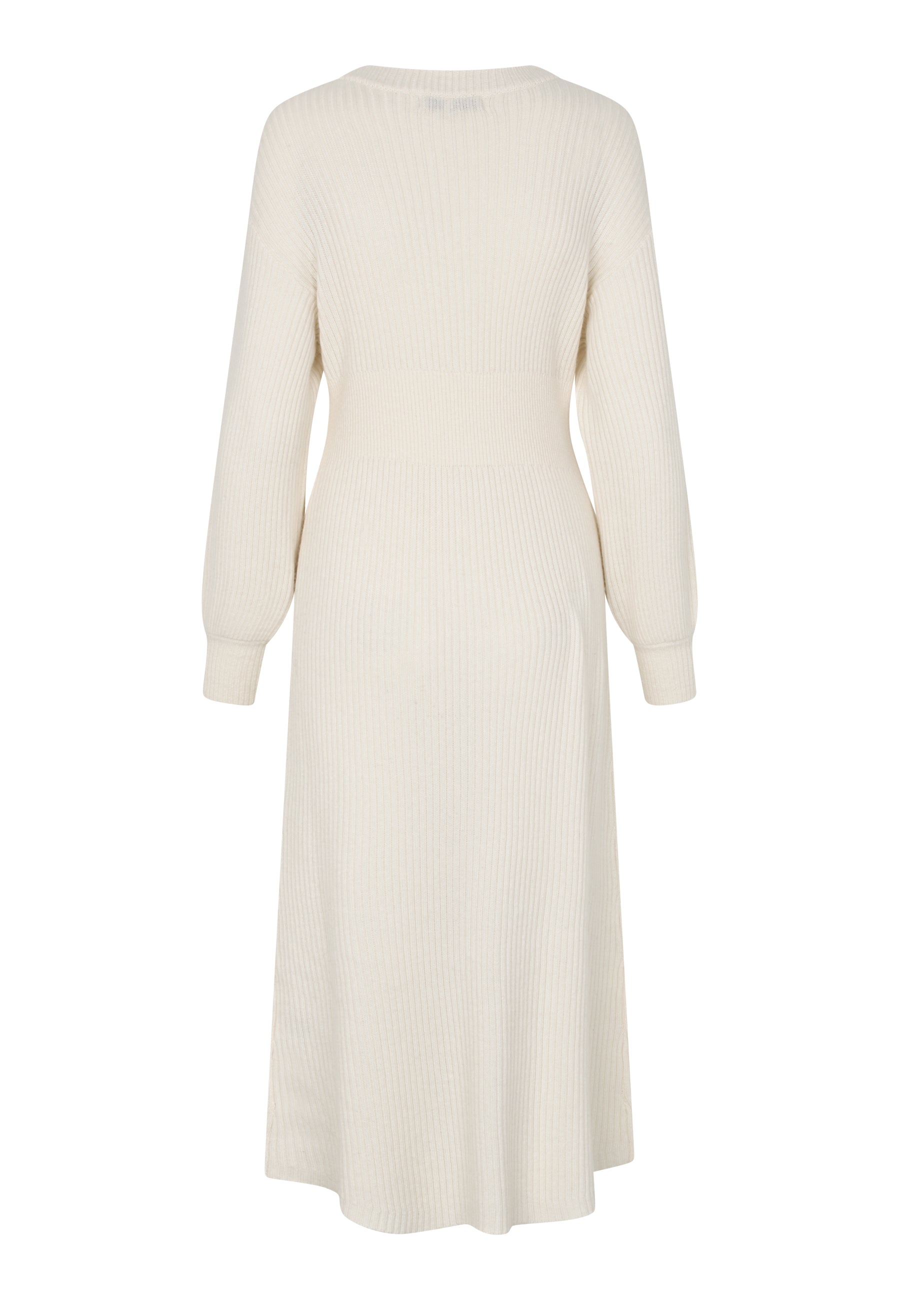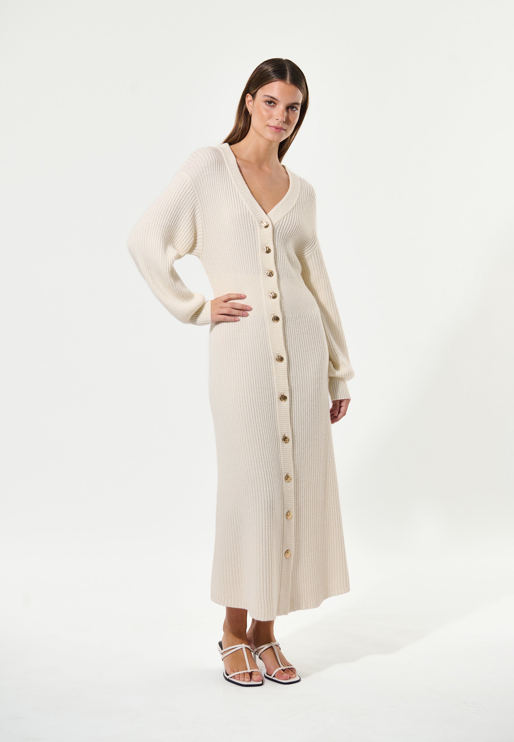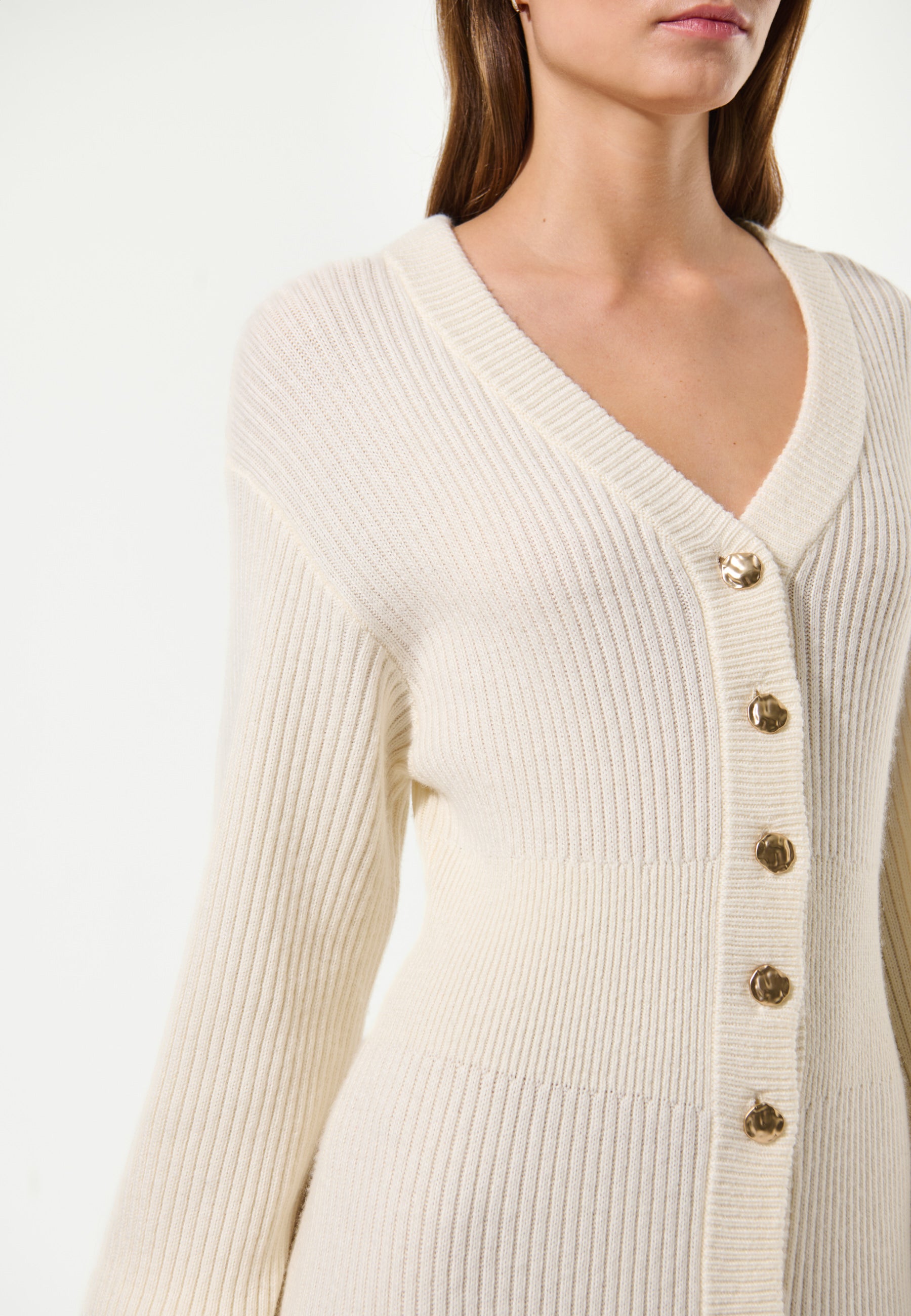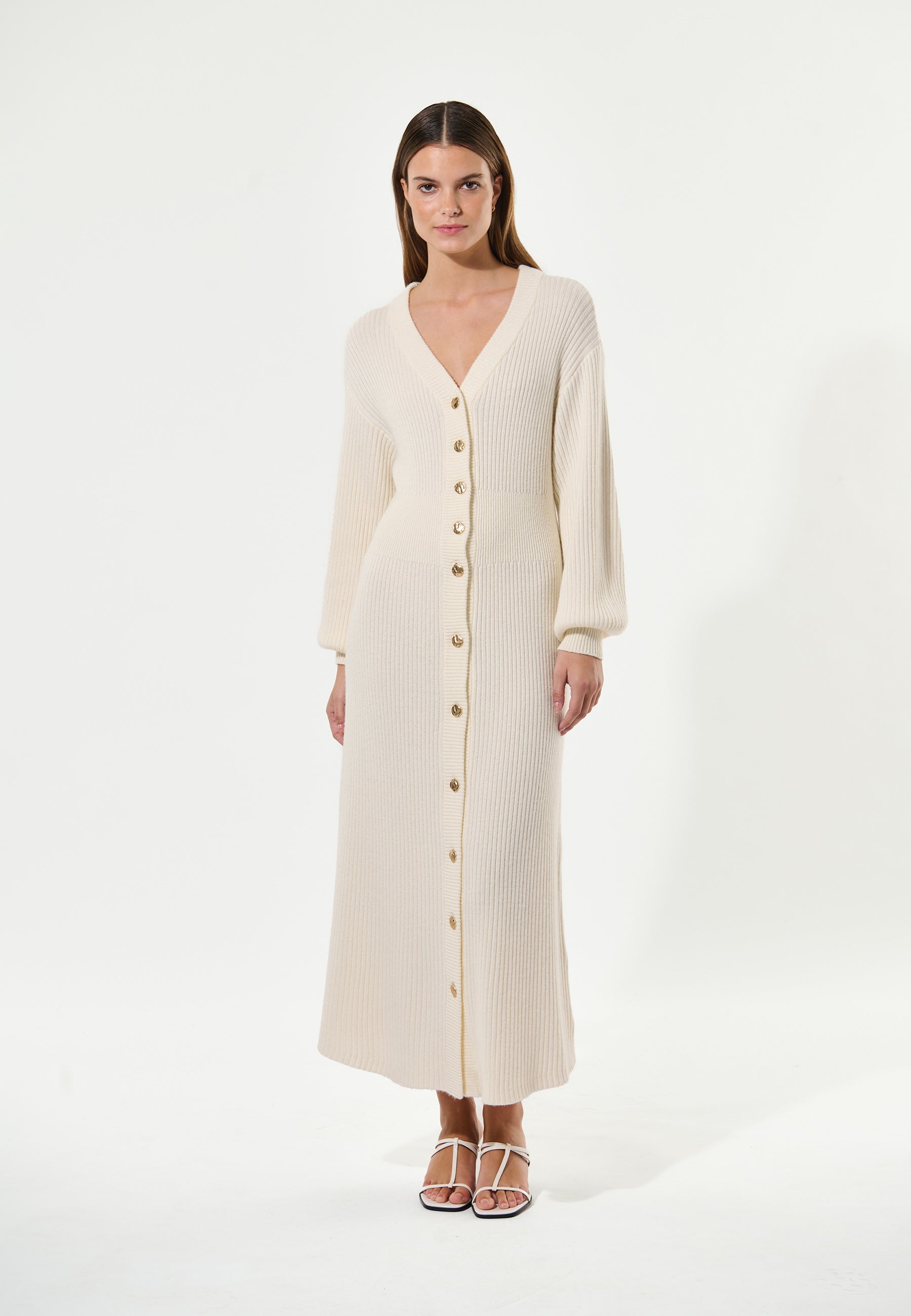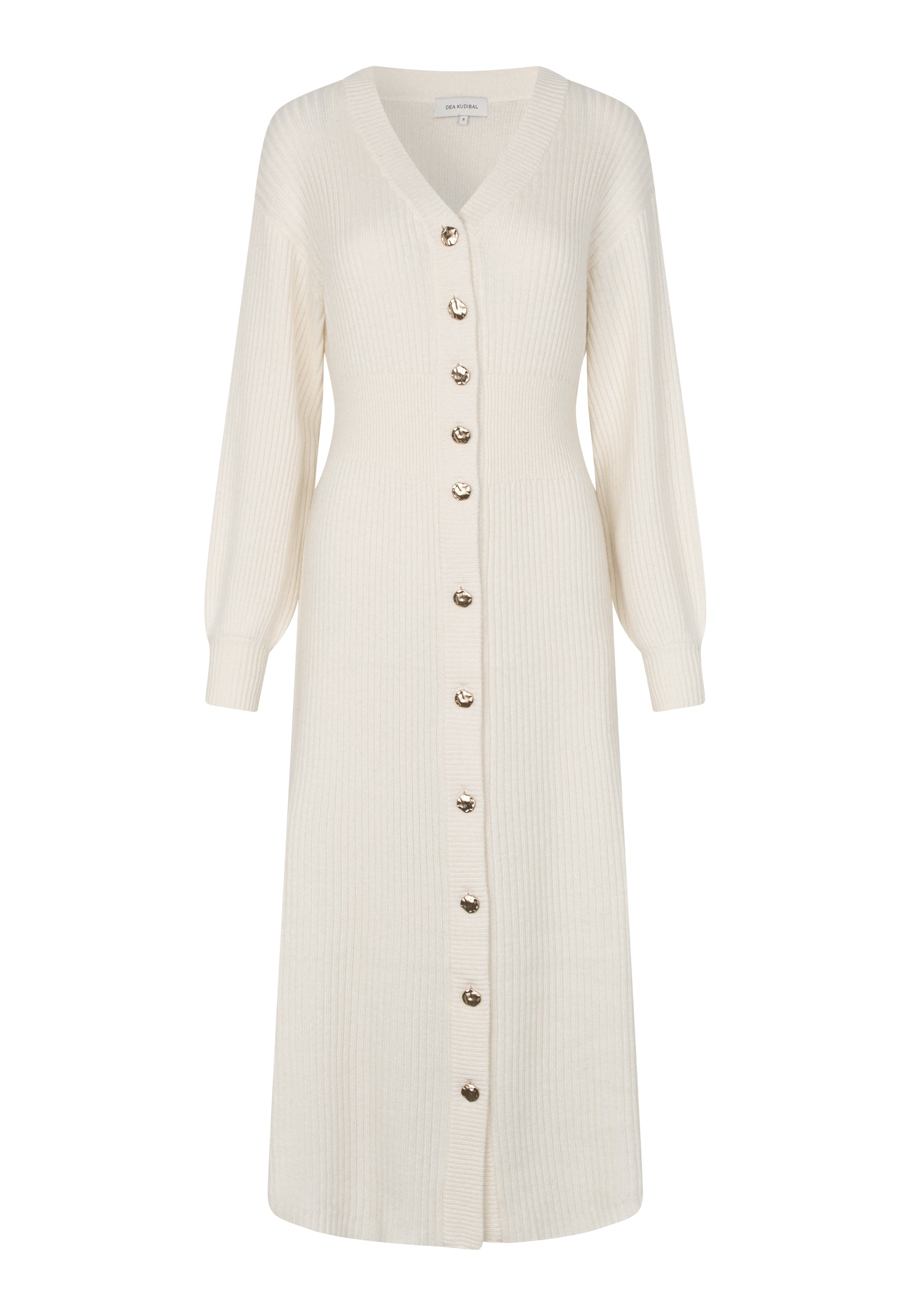 Lang strikkjole/cardigan i lækker blød lambswool blanding. Cardiganen har brede ærmer med rib manchet, bankede gyldne knapper, samt en rib-detalje i taljen som giver den et smukt feminint look. Lukket kan cardiganenbruges som kjole.