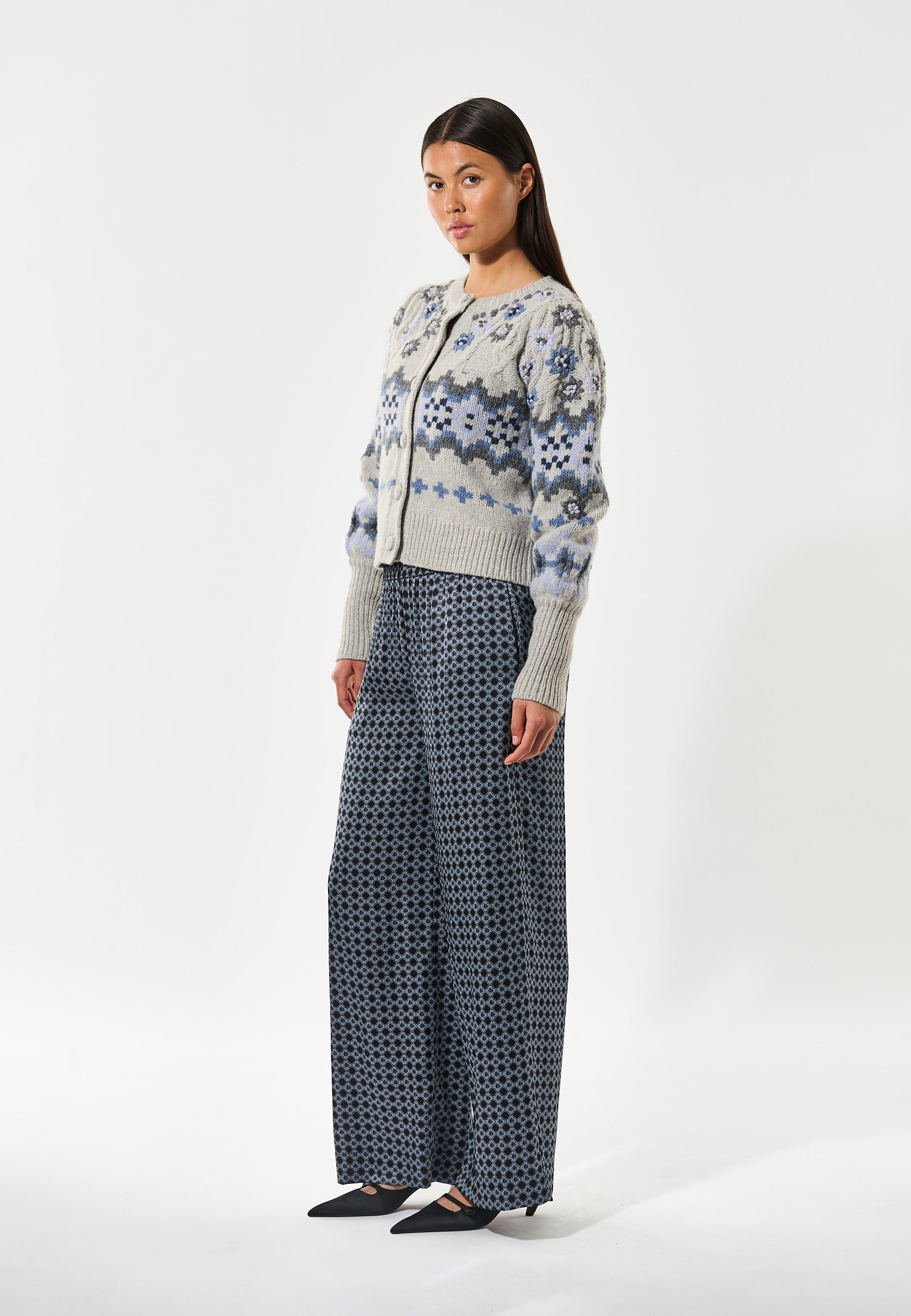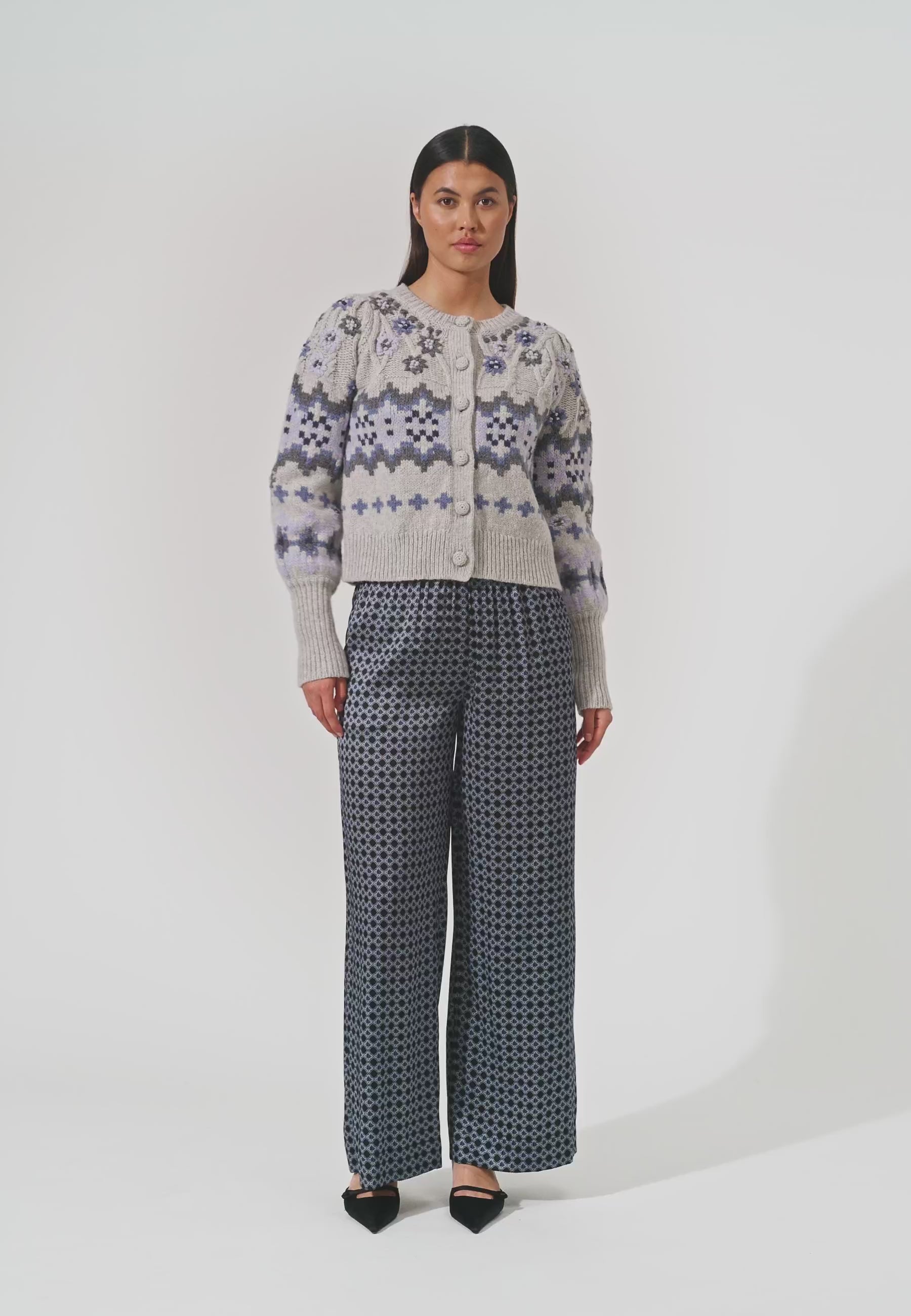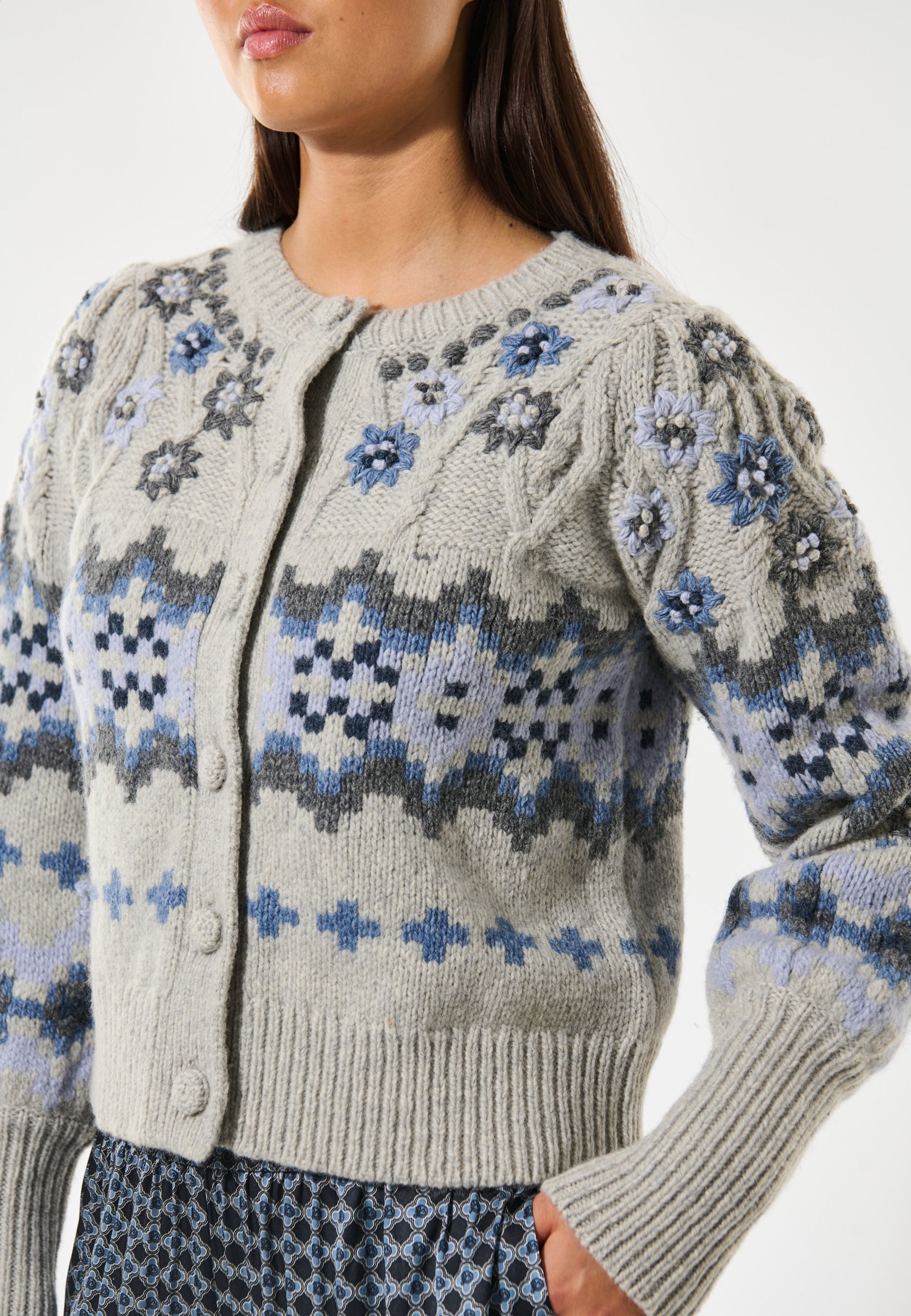 Smuk feminin strik med skønne broderier, brede rib manchetter, fine hæklede knapper.