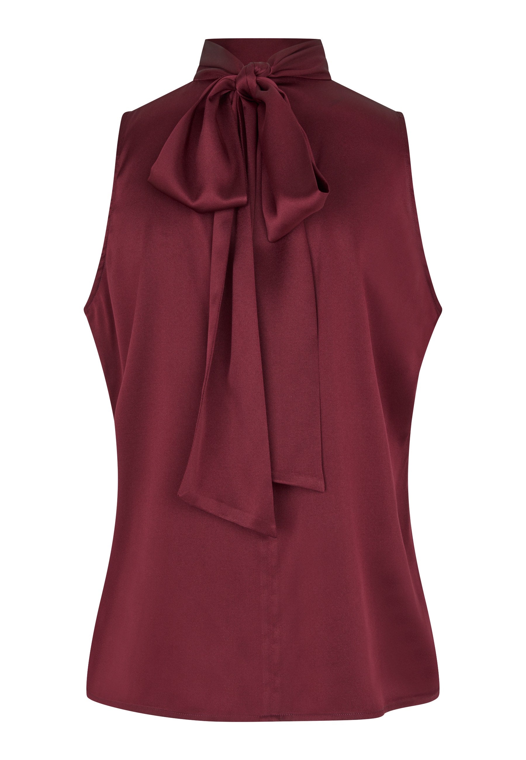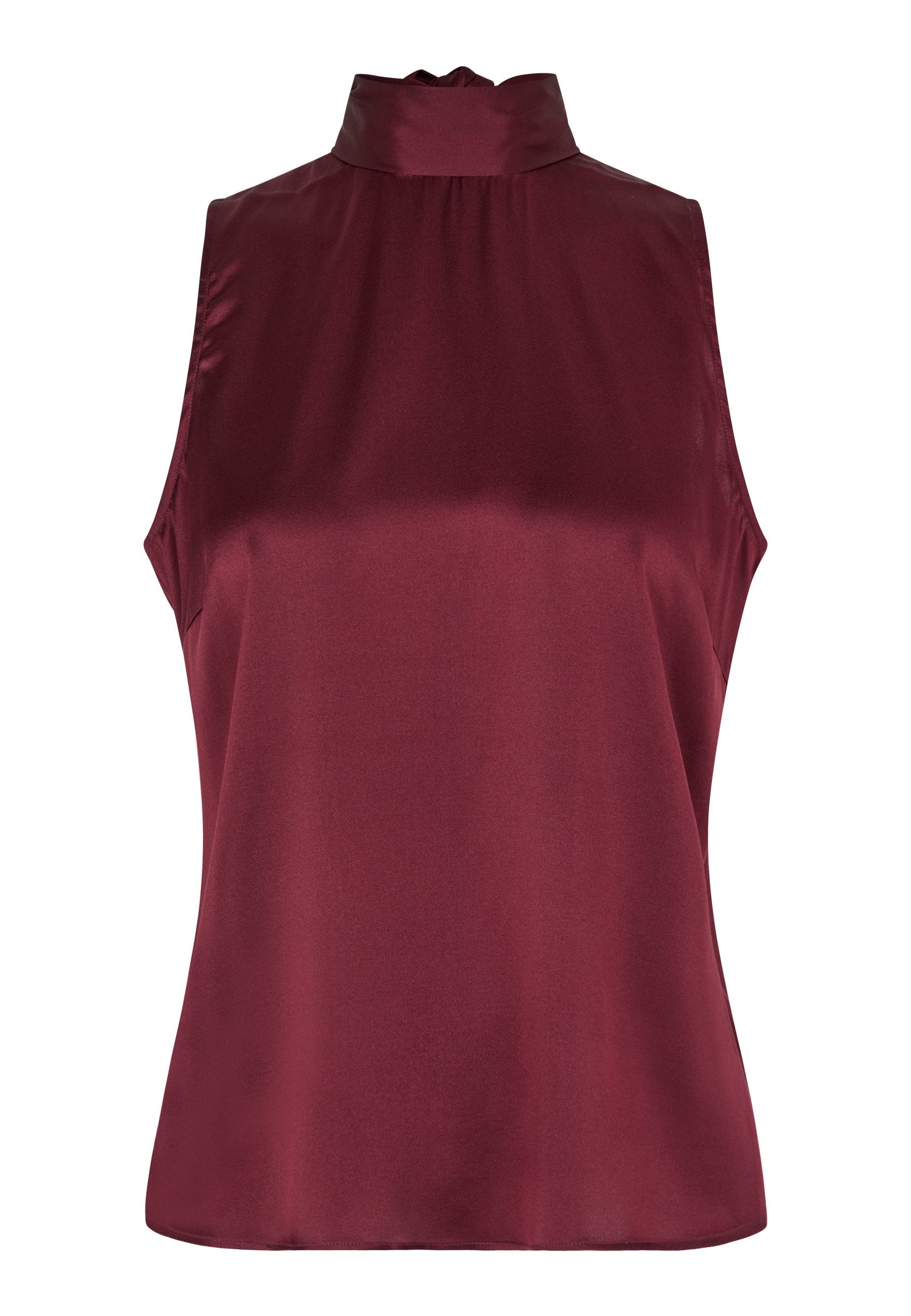 Fin top i smuk rød farve og et enkelt snit. Toppen har højhals som fortsætter i et bindebånd. Bindebåndet kan bindes på flere forskellige måder fx som stor sløjfe for eller bag eller det kan danne en enkel høj-hals.