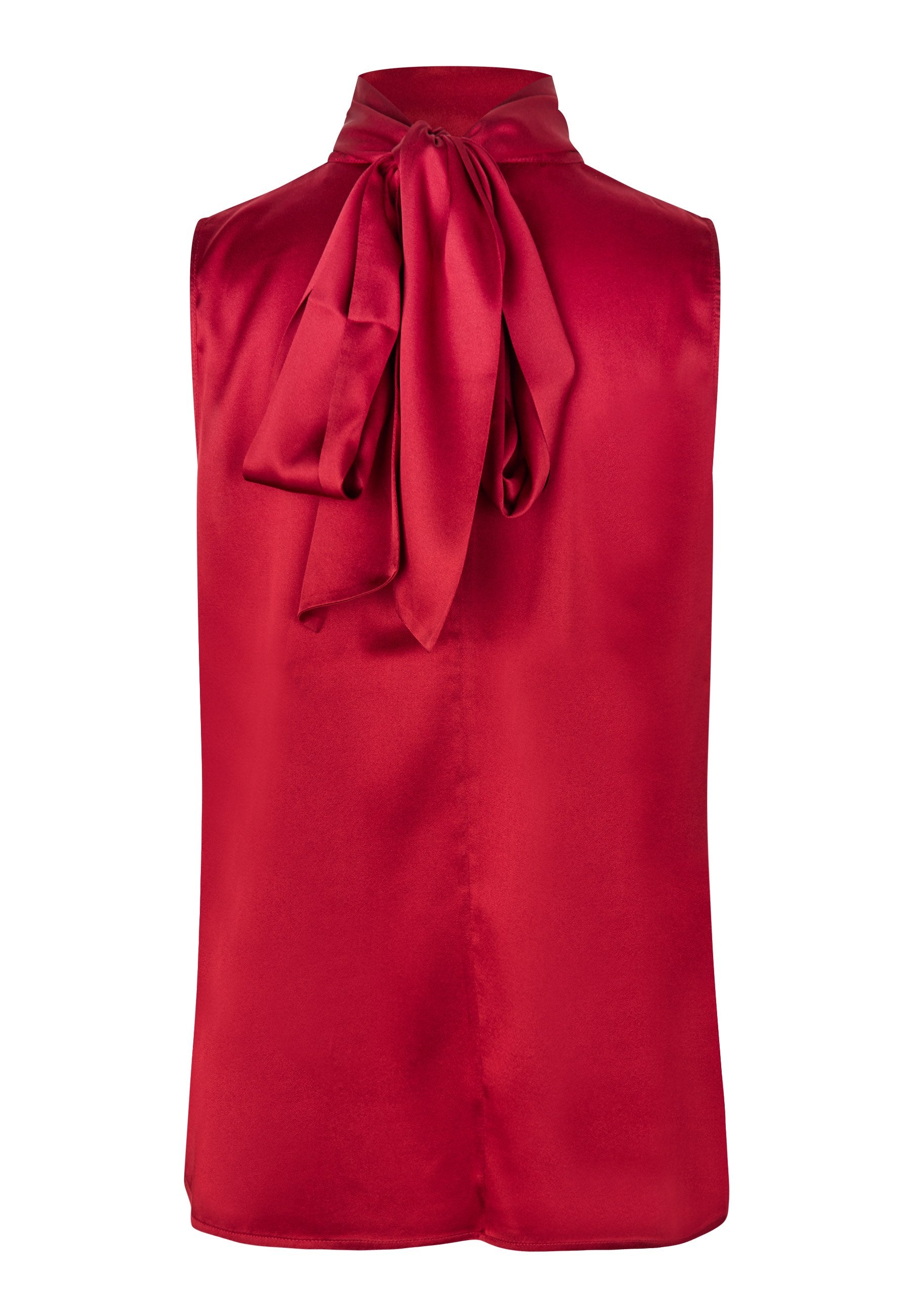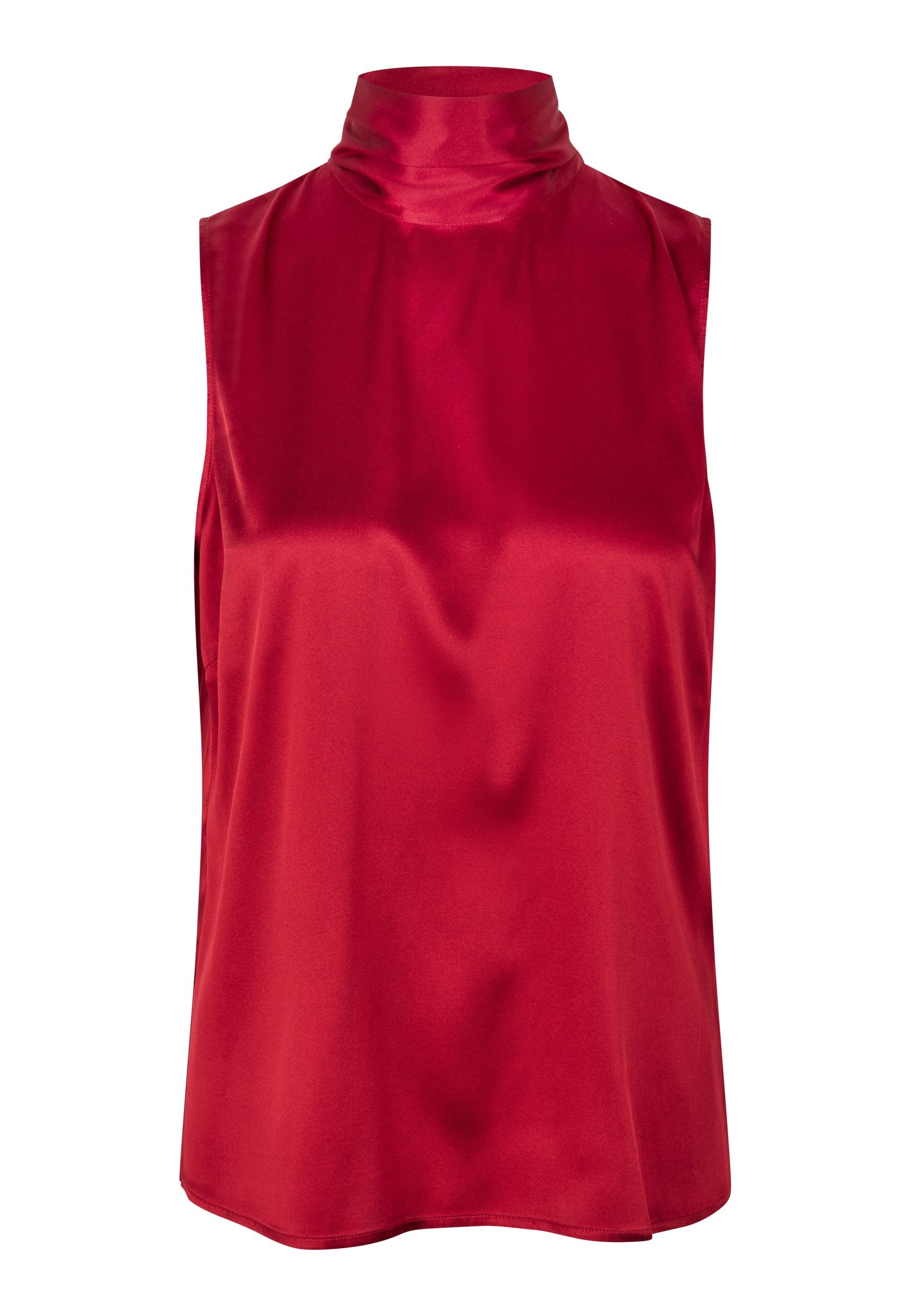 Fin top i smuk rød farve og et enkelt snit. Toppen har højhals som fortsætter i et bindebånd. Bindebåndet kan bindes på flere forskellige måder fx som stor sløjfe for eller bag eller det kan danne en enkel høj-hals.
