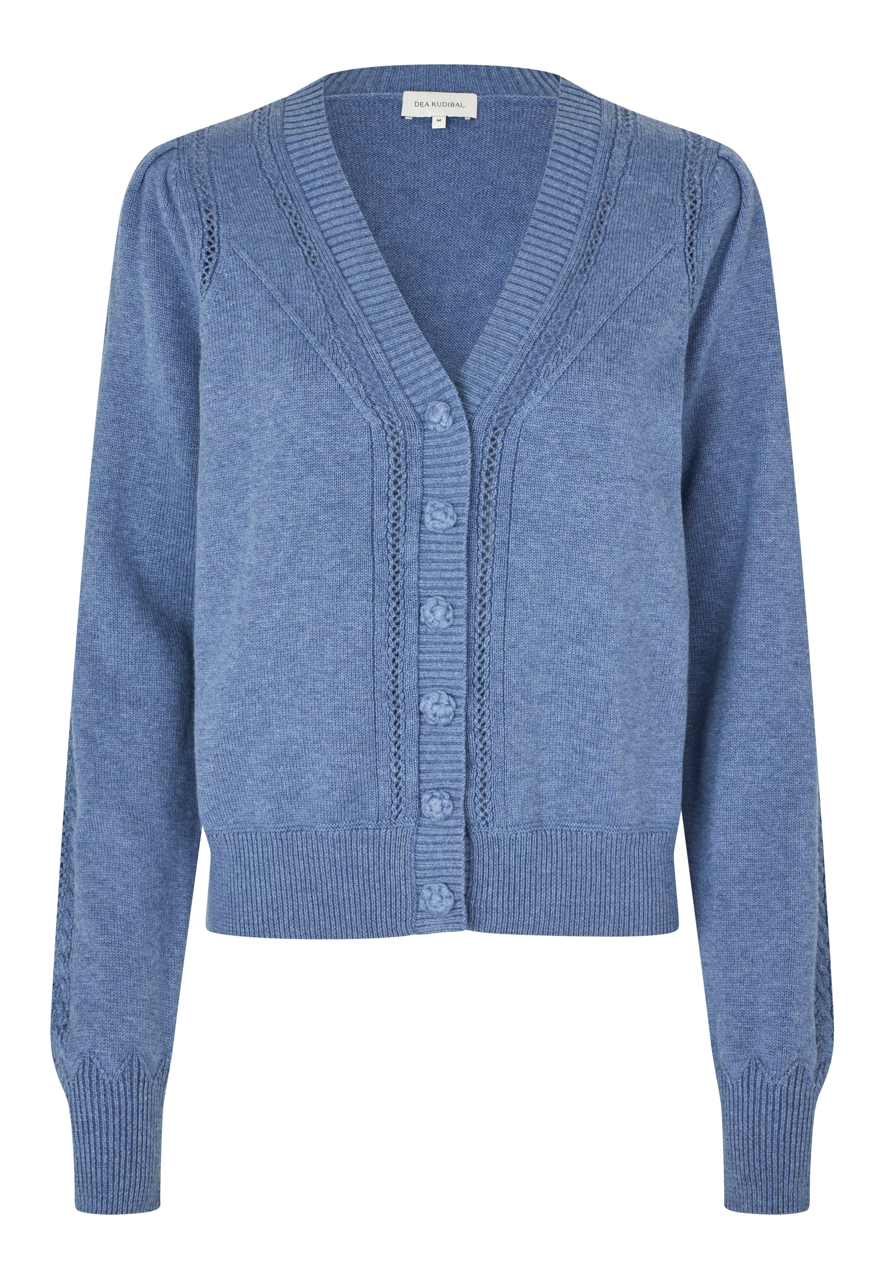 Skøn strik cardigan i et enkelt snit med betrukne knapper, skulderpuder og v-hals. Cardiganen har ribkanter samt et smukt hul-mønster i ærmegabet og langs hals og lukning.