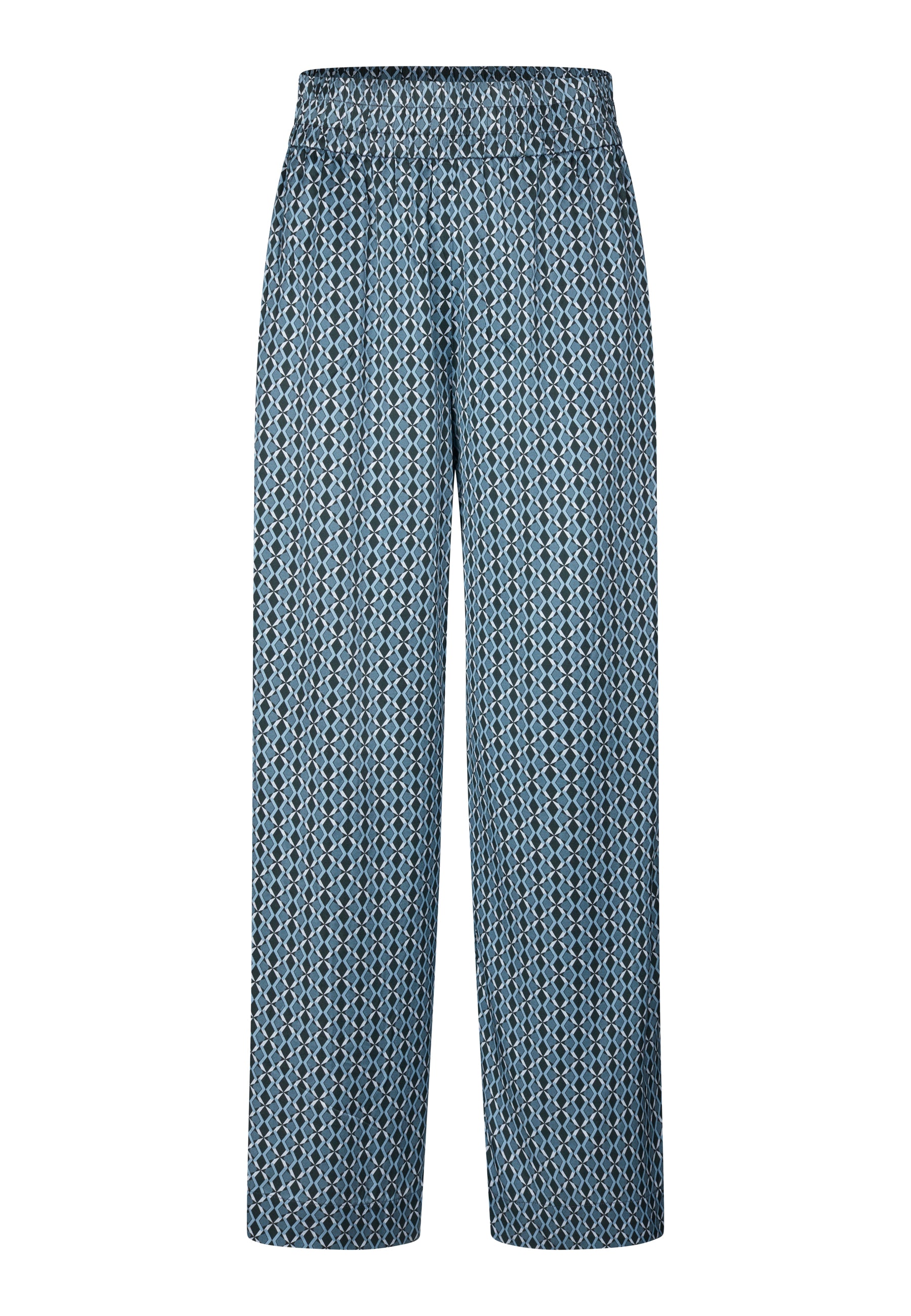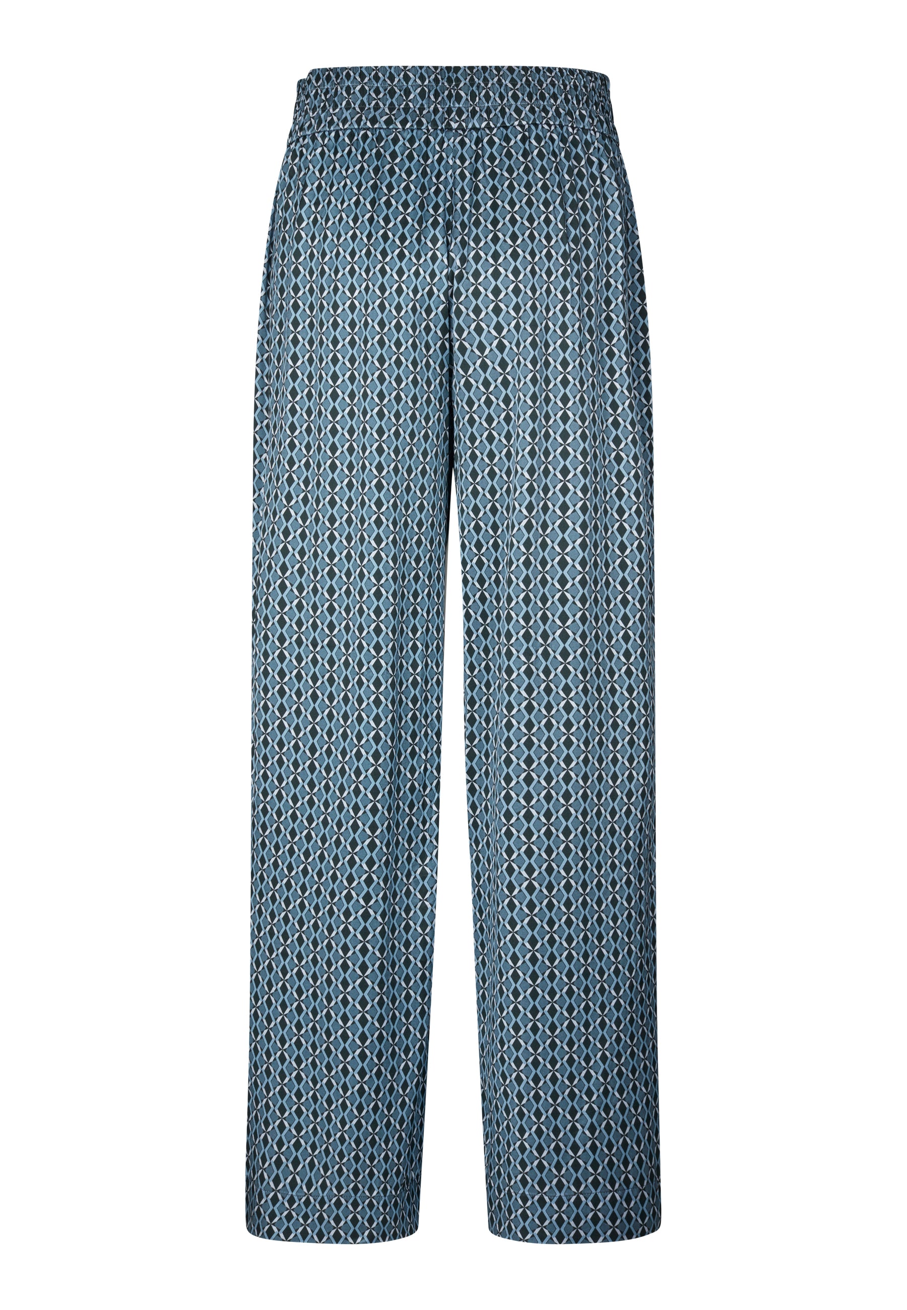 Skønne silkebukser med bred elastik linning i et cool grafisk print bestående af grafiske former i creme og blålige nuancer