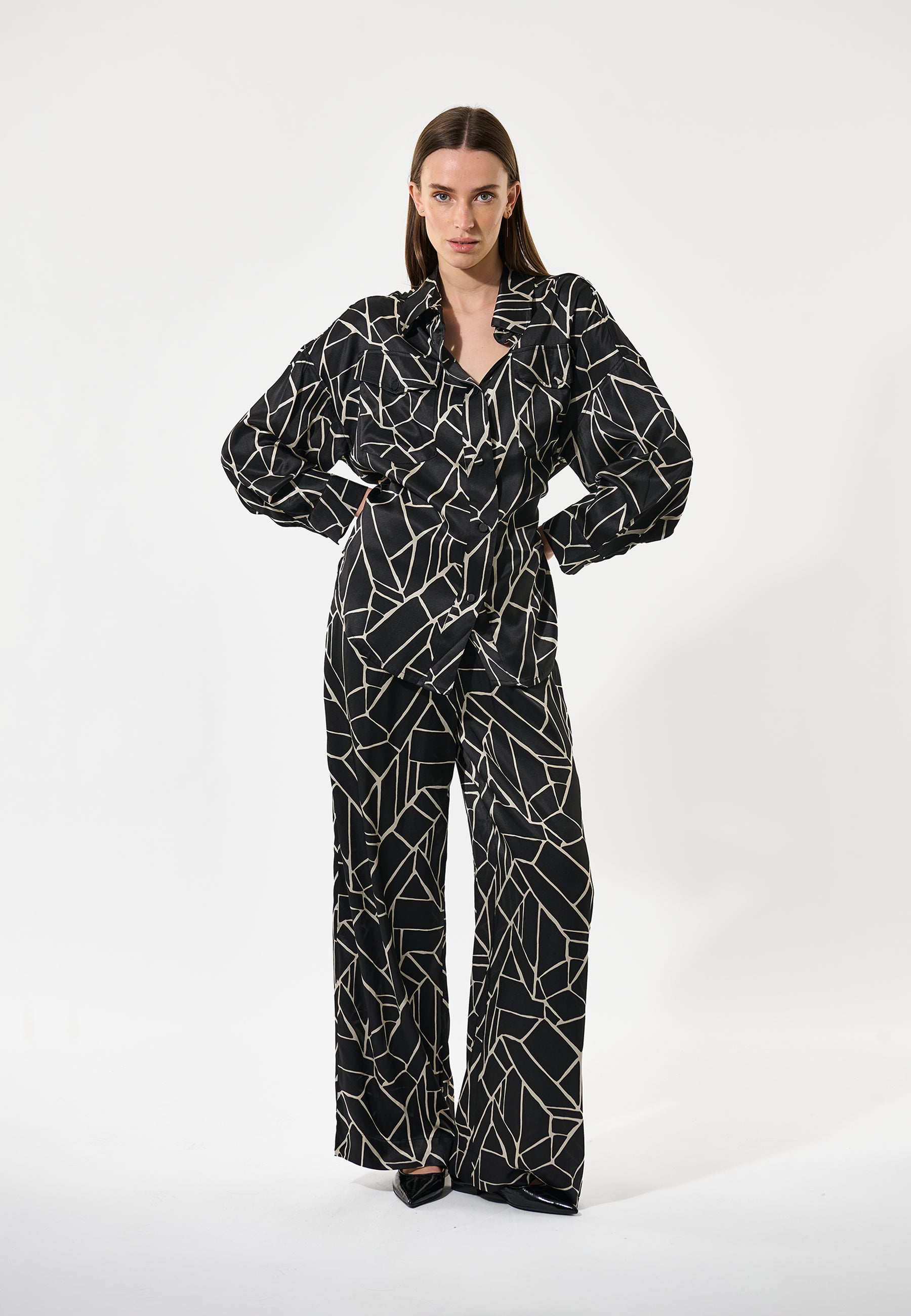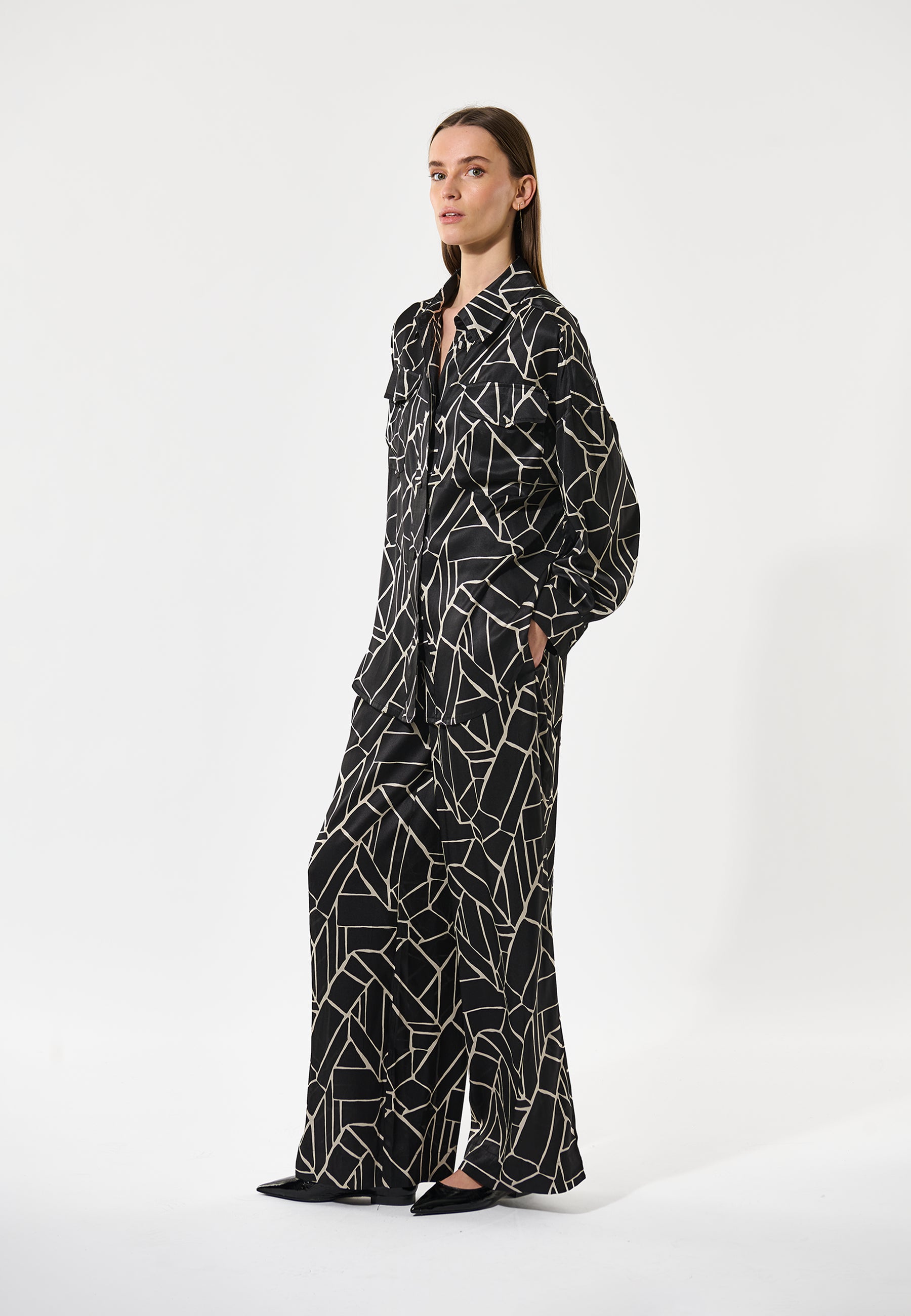 Skønne silkebukser med bred elastik linning i et cool grafisk print bestånde af hvide streger på sort bund.