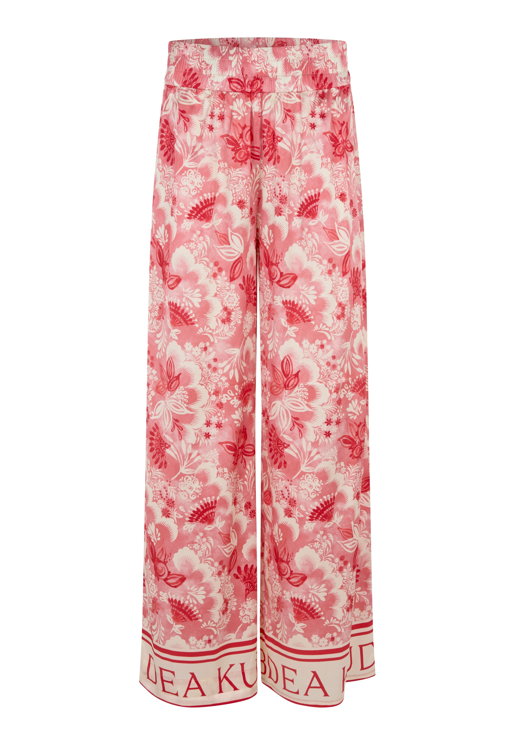 Skønne silkebukser med brede ben og bred elastik linning. bukserne er i et skønt abstrakt blomsterprint bestående af hvide og rødlige nuancer. Buksen har logo-bort nederderst