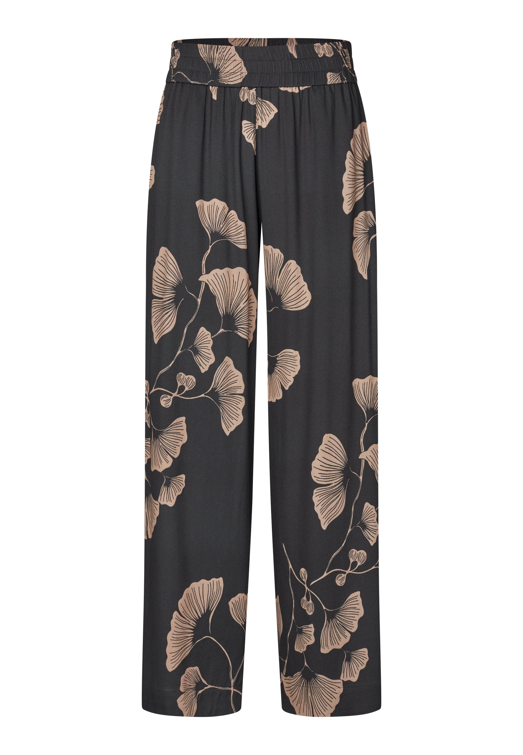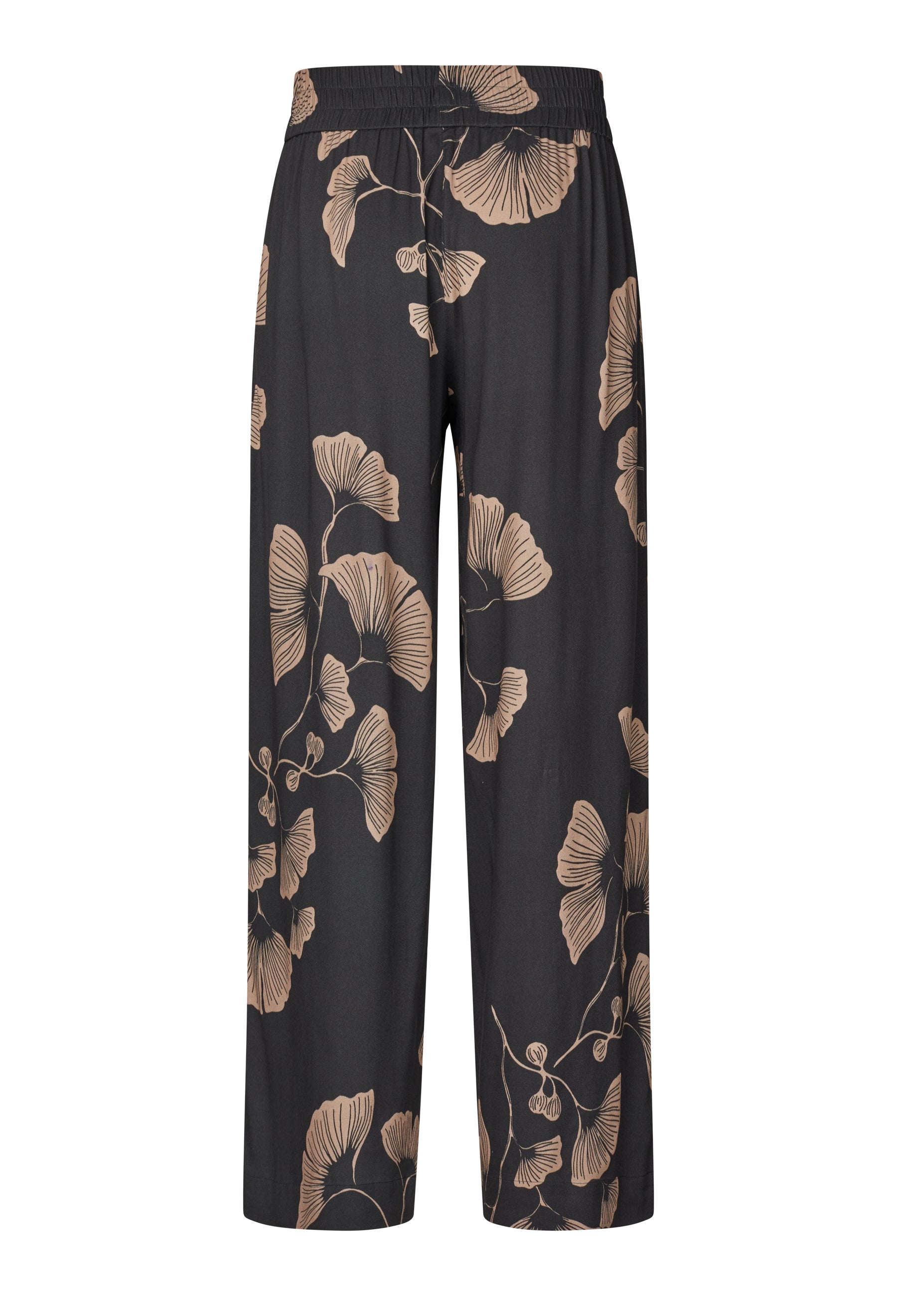 Skønne viscose bukser med bred elastik linning, i et skønt abstrakt blomster/bladeprint, bestående af creme og gyldne nuancer på sort bund.
