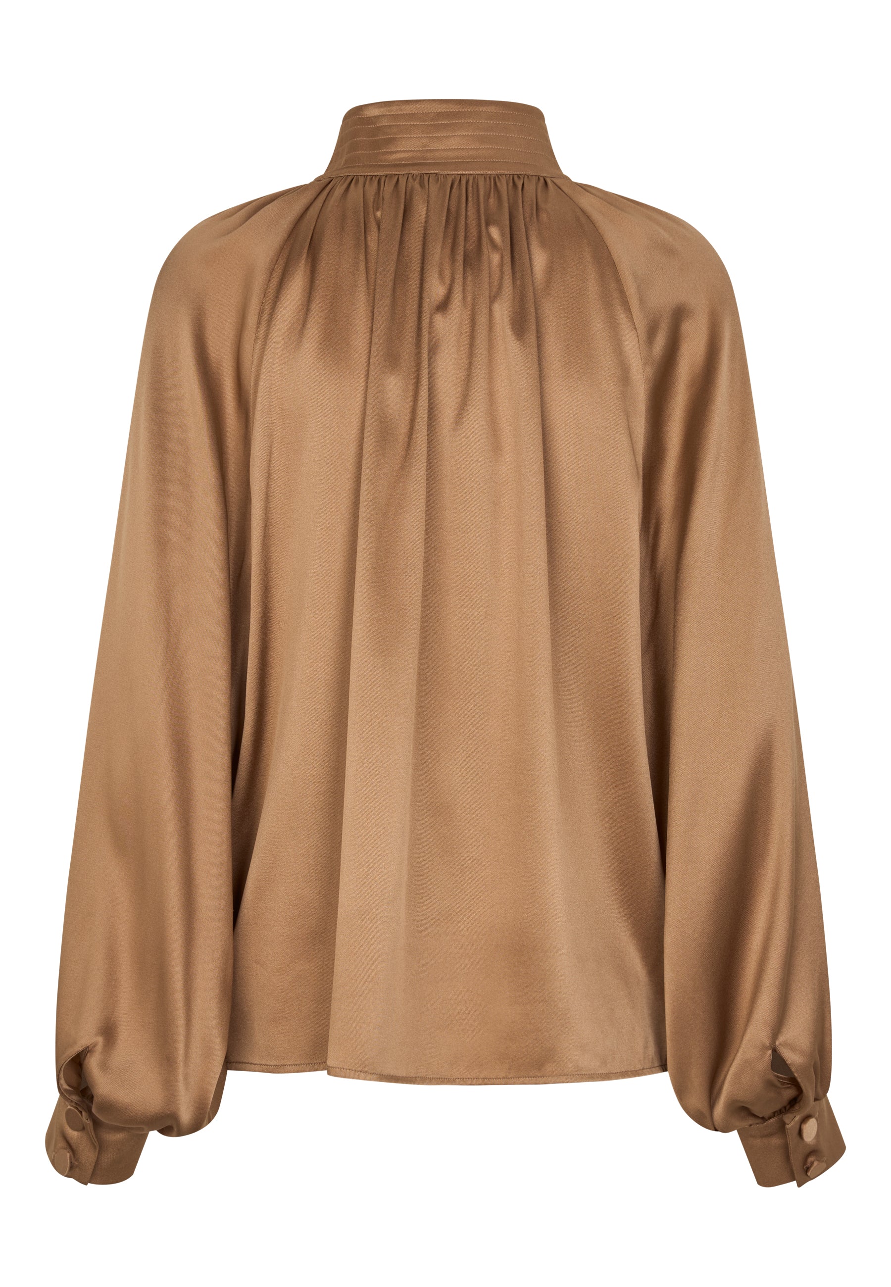 Silke tunika med bred stolpelukning, høj krave og ærme med høj manchet. Tunikaen er i en smuk gylden karamelfarve.