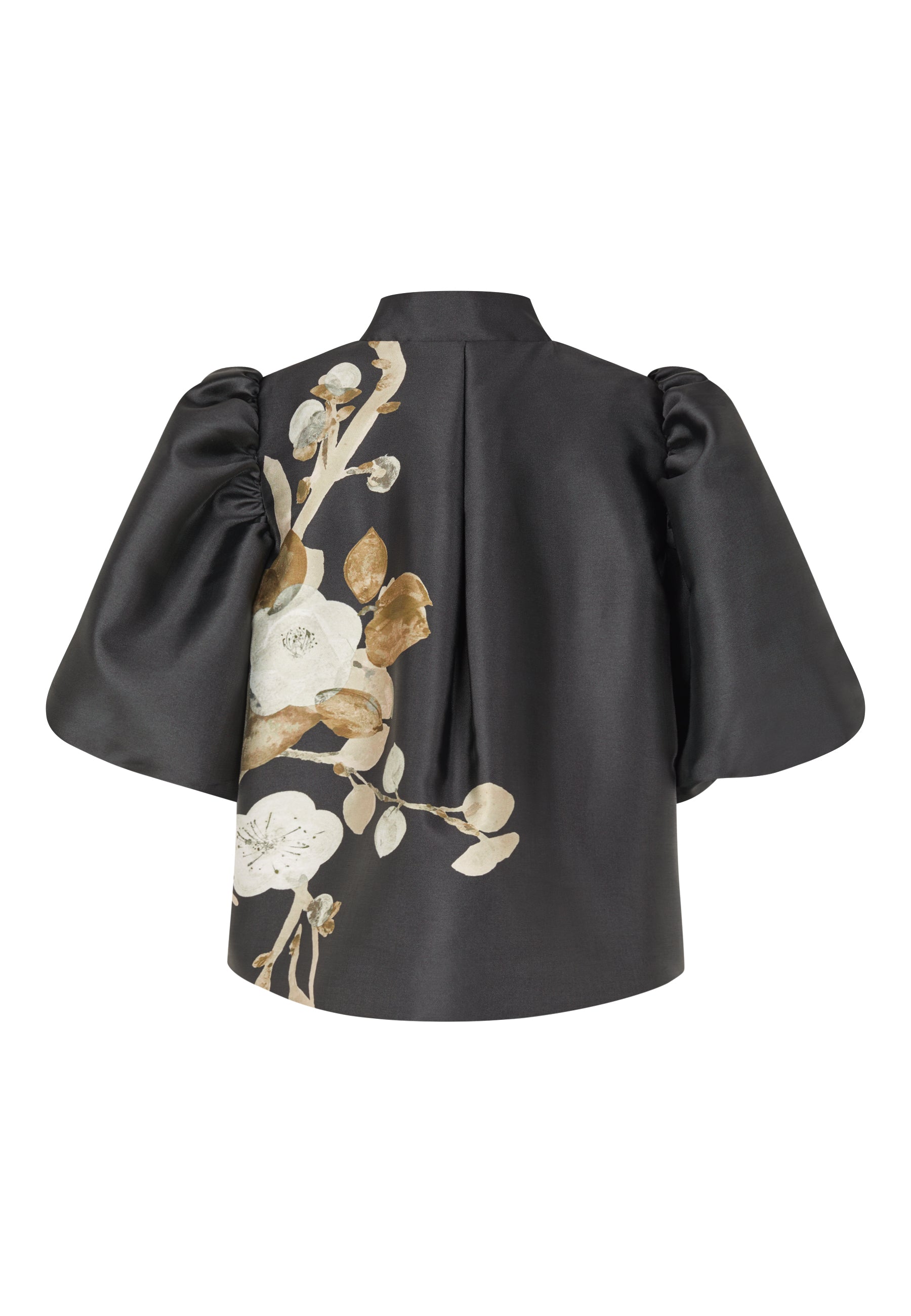 Kort jakke med smukt placement print med volumiøse ærmer, wienerlæg på ryggen, kinakrave, stiklommer fortil og hægtelukning i halsudskæringen. Brug den med nederdelen i samme print, et par flotte bukser med brede ben, jeans eller noget helt andet, med denne skønne jakke er mulighederne mange