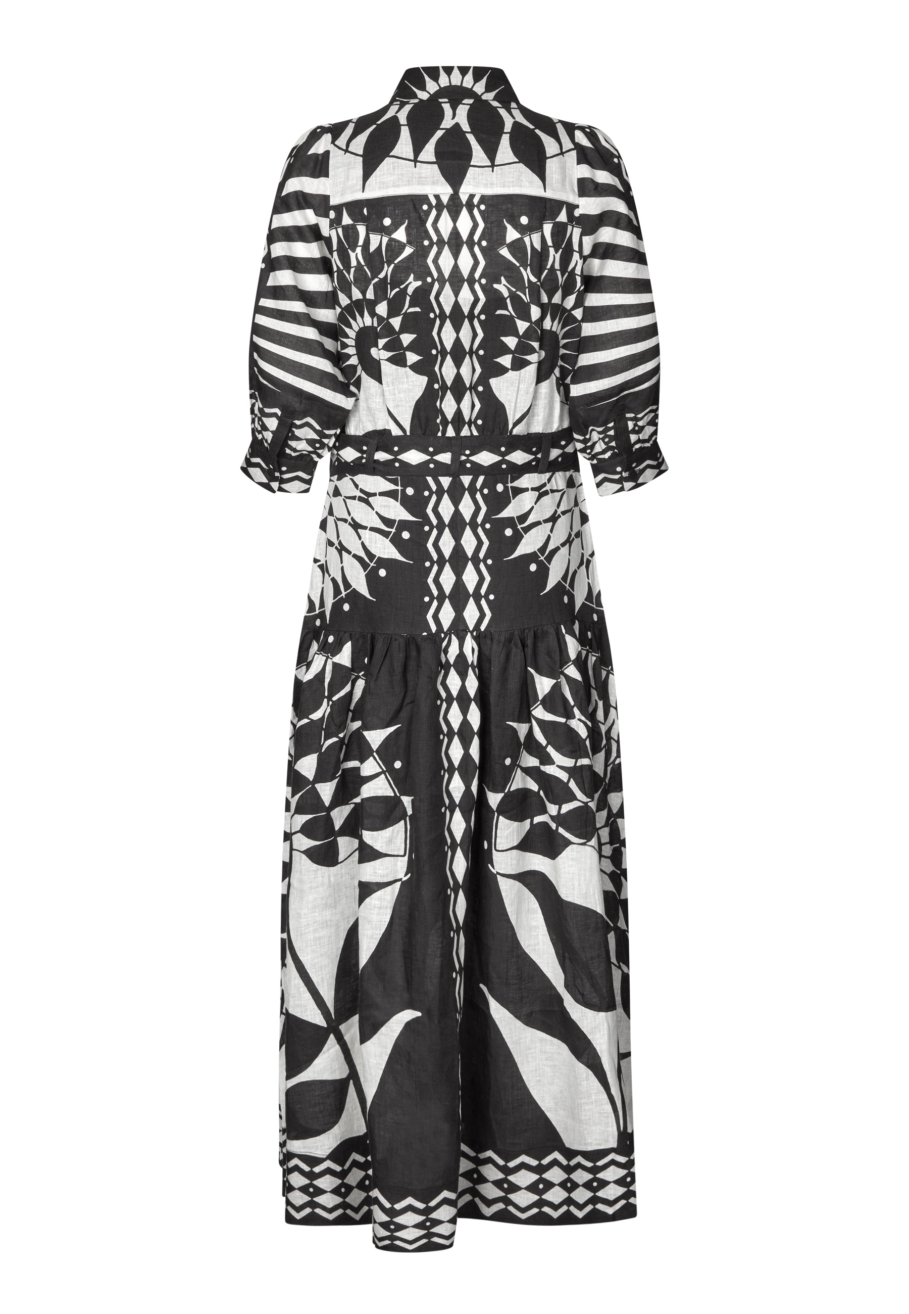 Skøn lang hørkjole i smukt sort hvidt grafisk print. Kjolen har fast taljestykke, klassisk skjortekrave, knappet overdel og 3/4 lange pufærmer med manchet. Til kjolen medfølger en sort underkjole og aftageligt bindebælte.