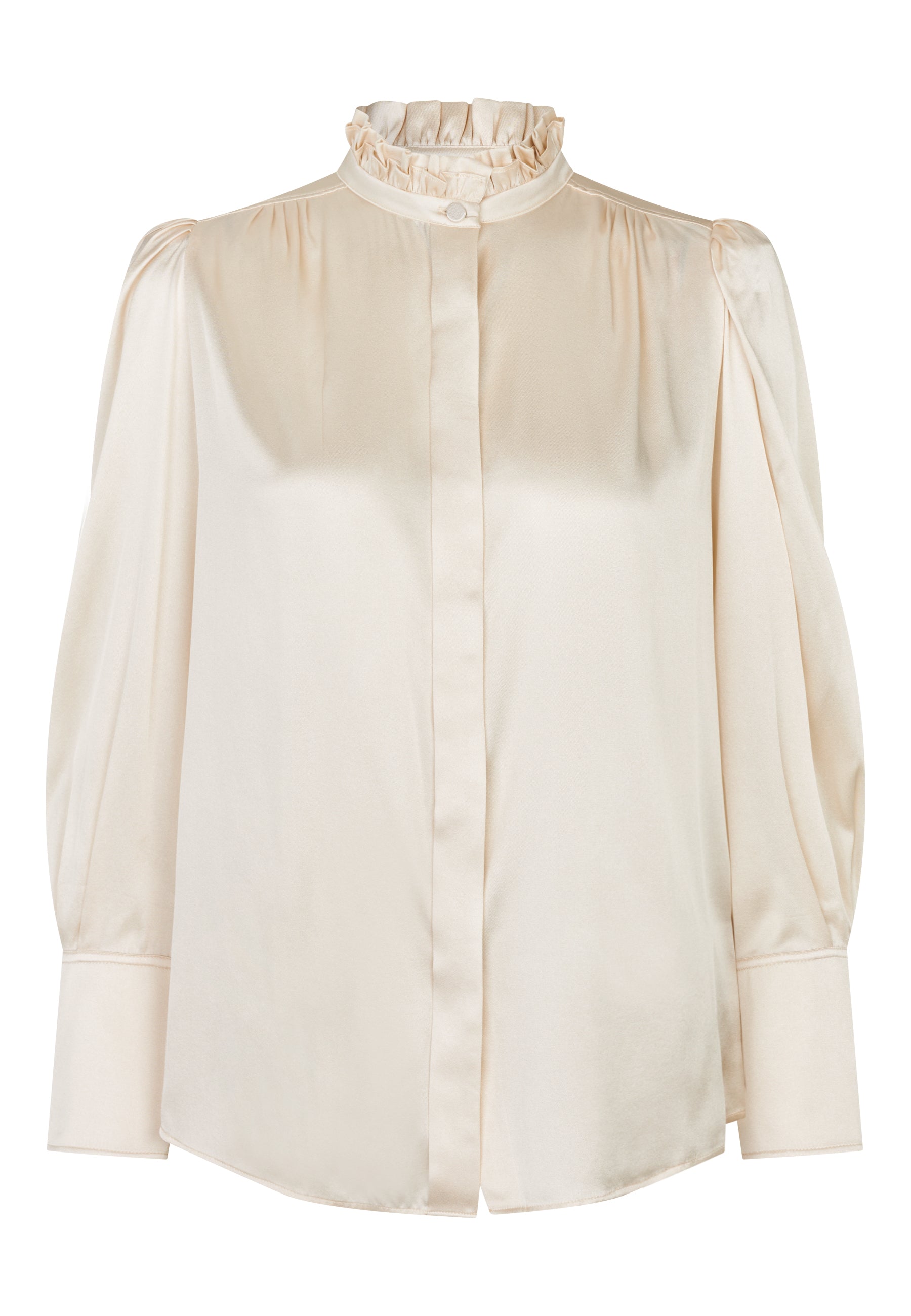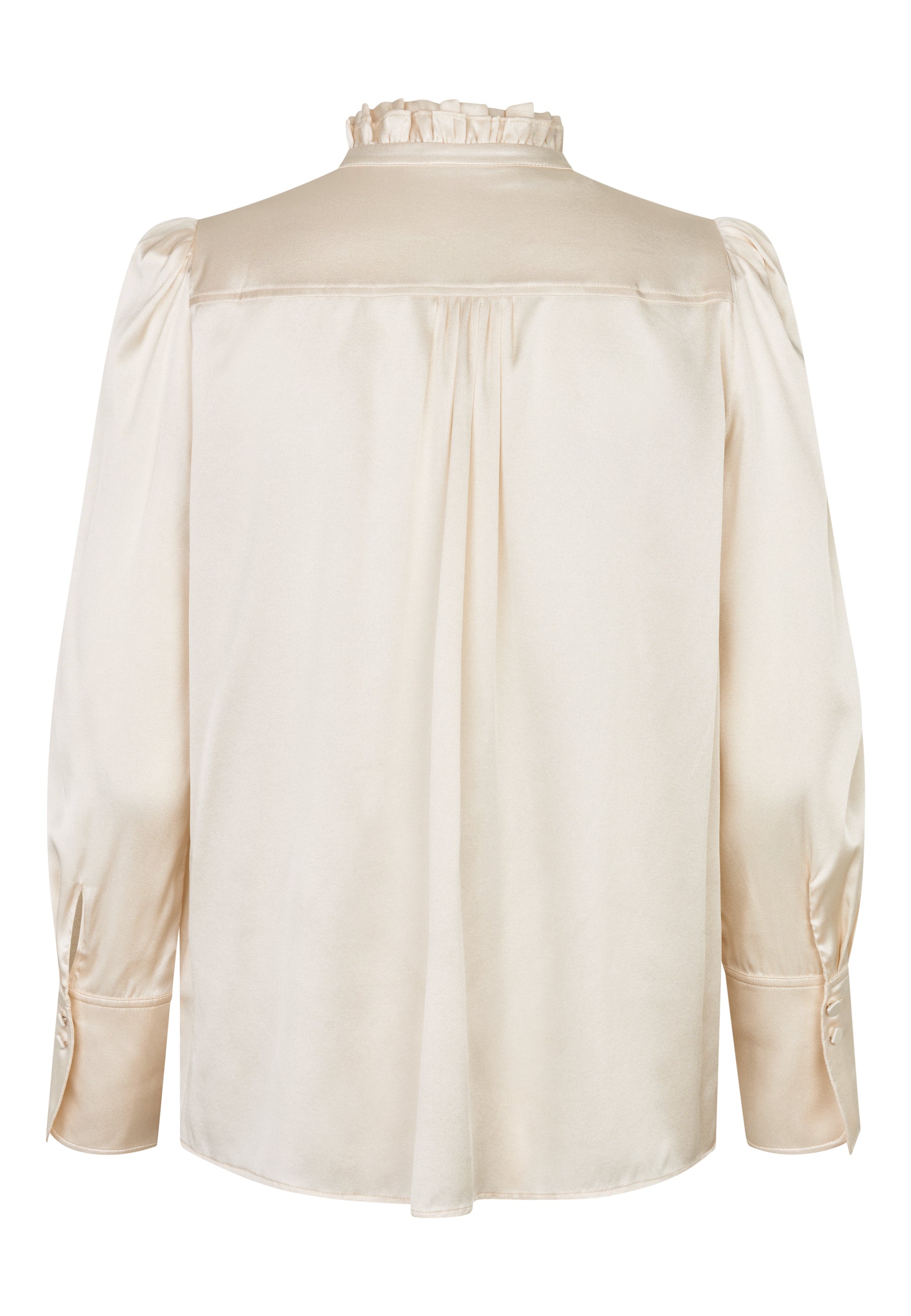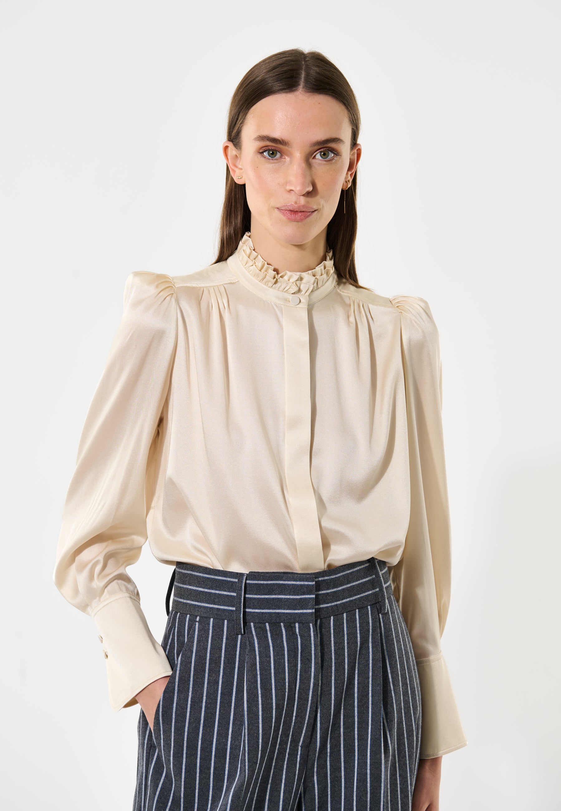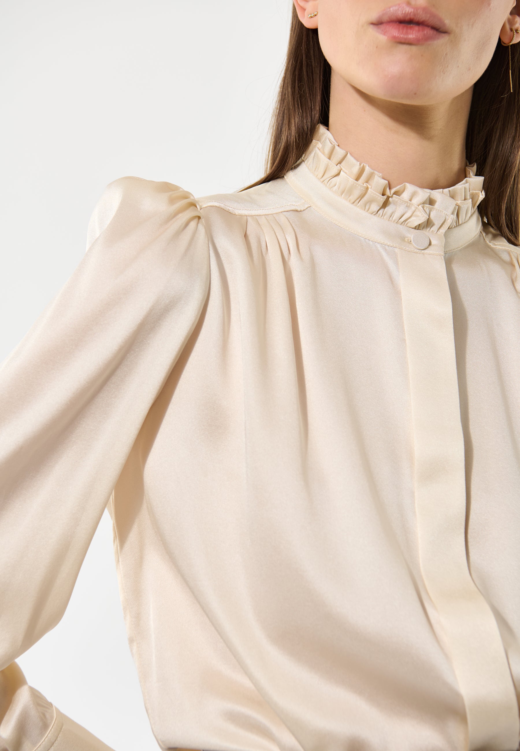 Skøn silkeskjorte i delikat off-white. Skjorten har ærme med puf og bred manchet med buet kant, aftagelige skulderpuder, skjultknaplukning og smal flæse i halsen.
