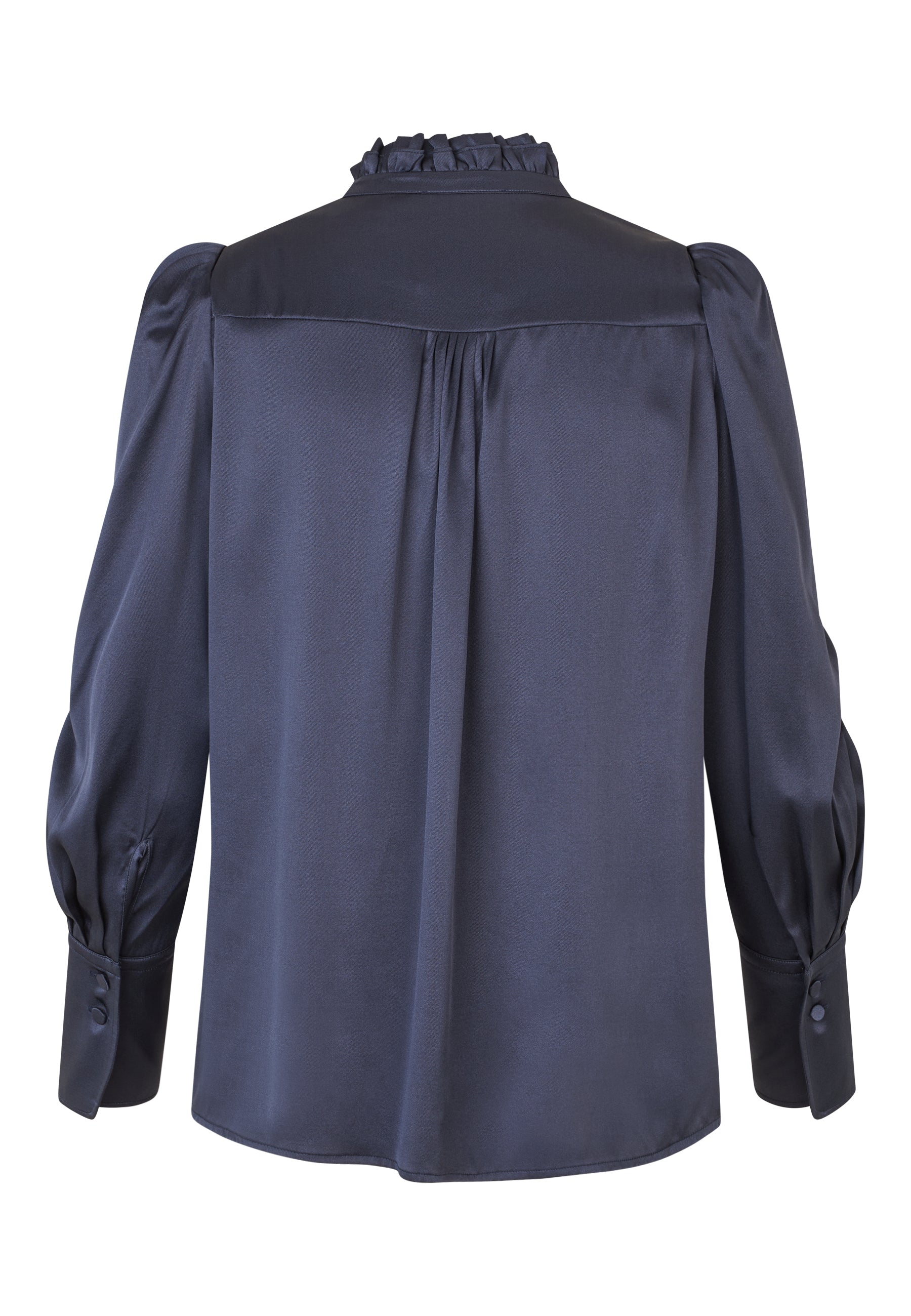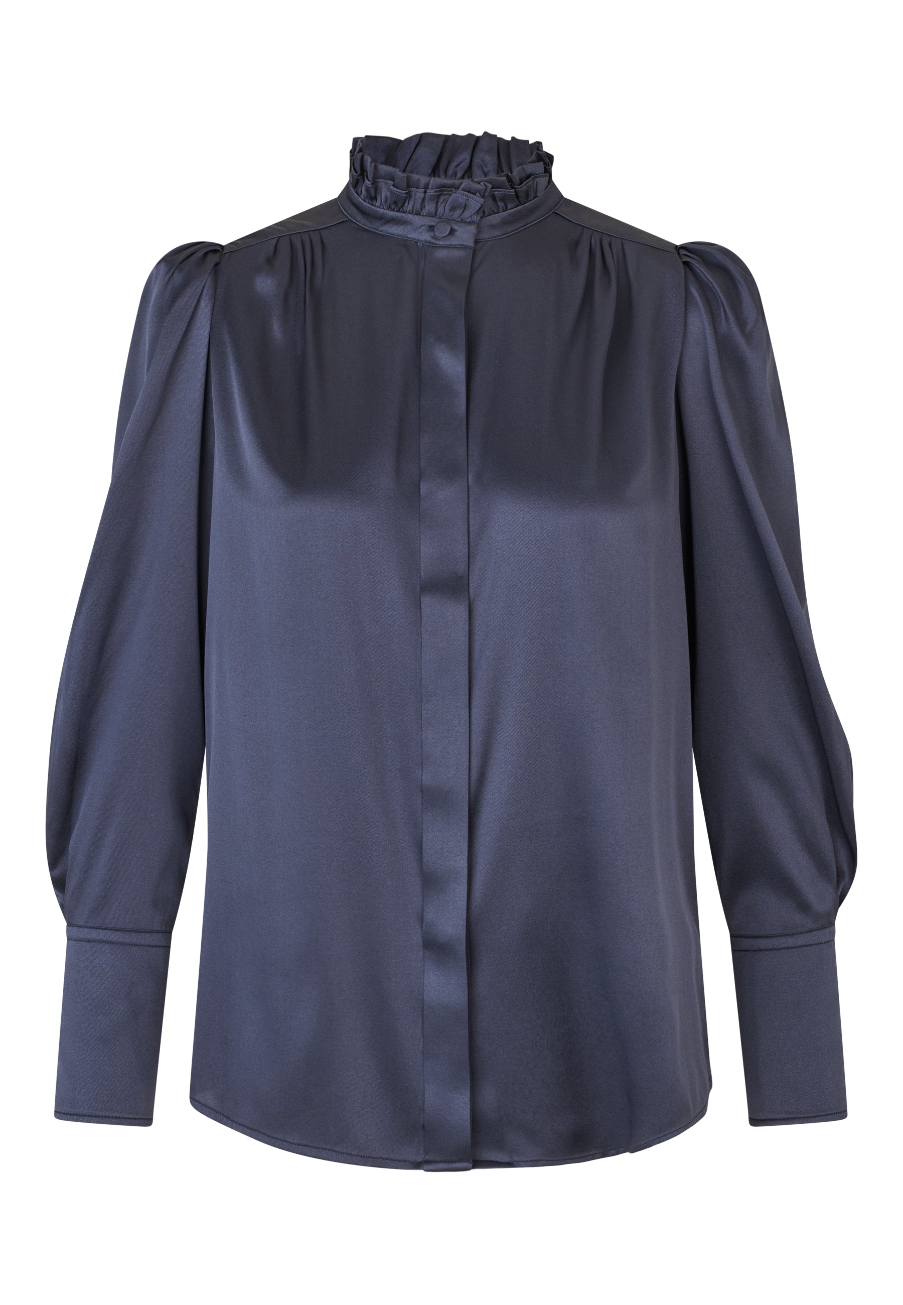 Skøn silkeskjorte i smuk mørkeblå farve. Skjorten har ærme med puf og bred manchet med buet kant, aftagelige skulderpuder, skjultknaplukning og smal flæse i halsen.