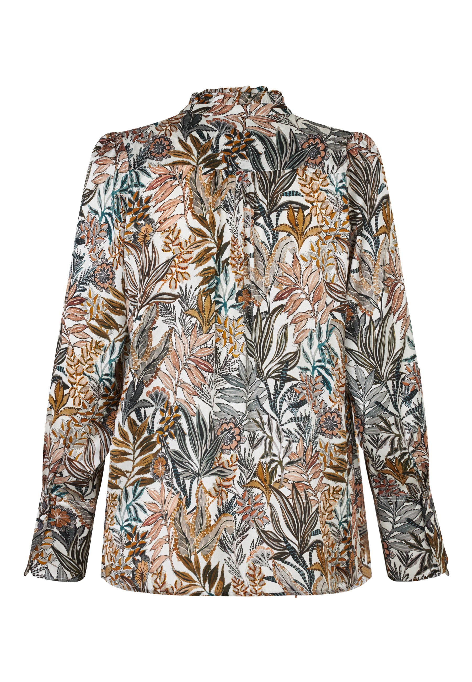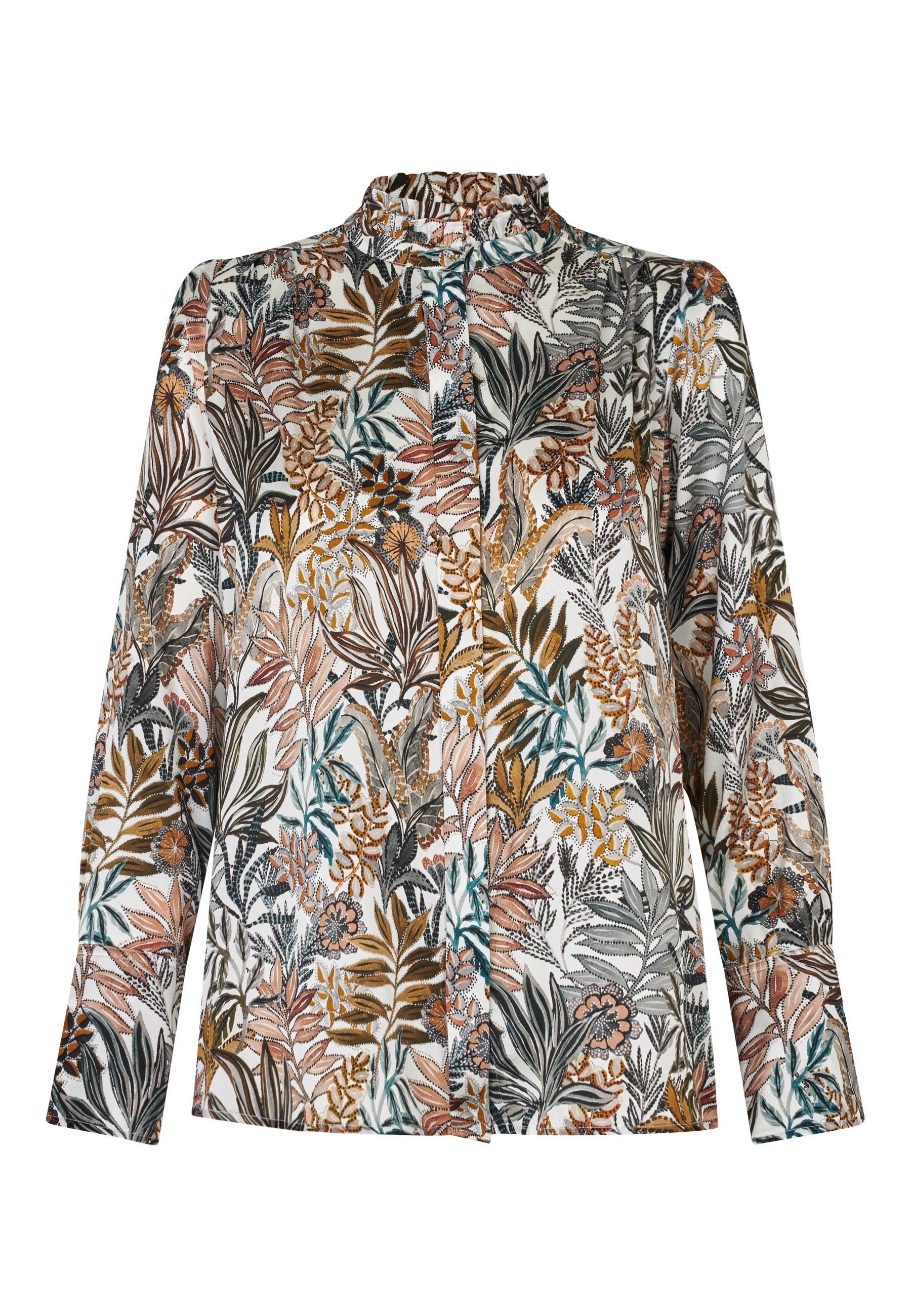 Skøn silkeskjorte i smukt blomsterprint bestående af beige, orange, sort og grønne nuancer. Skjorten har ærme med puf og bred manchet med buet kant, aftagelige skulderpuder, skjultknaplukning og smal flæse i halsen.