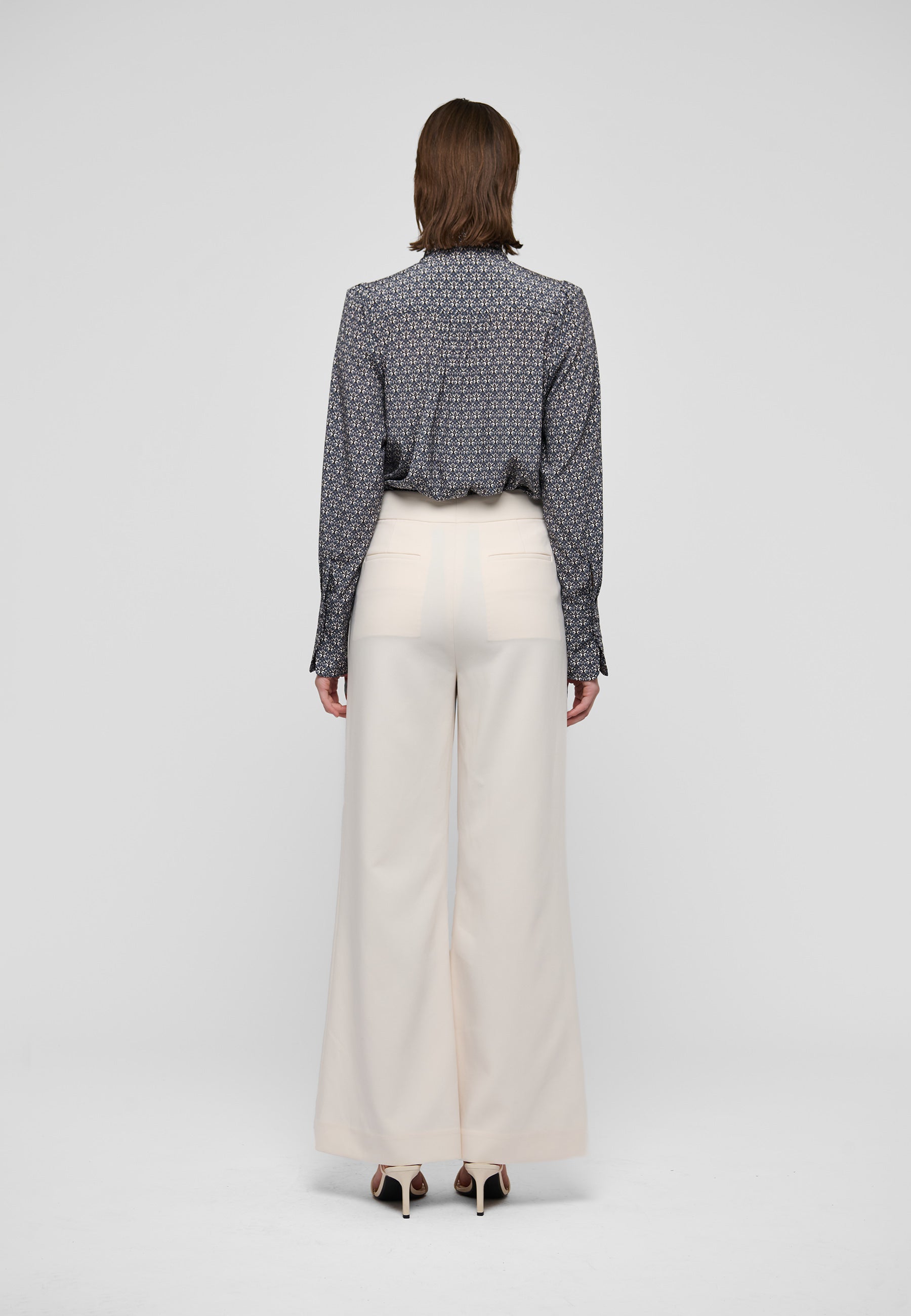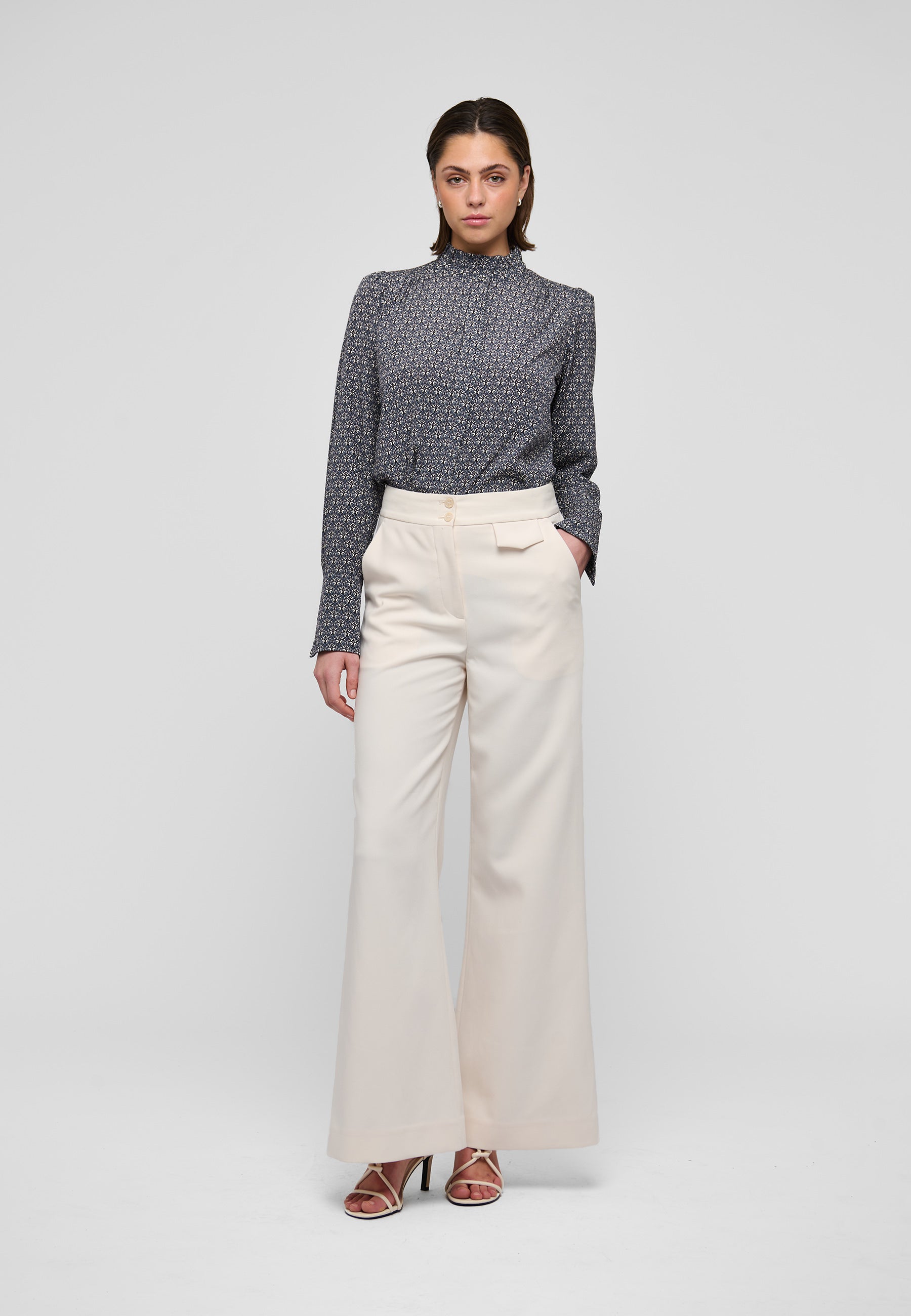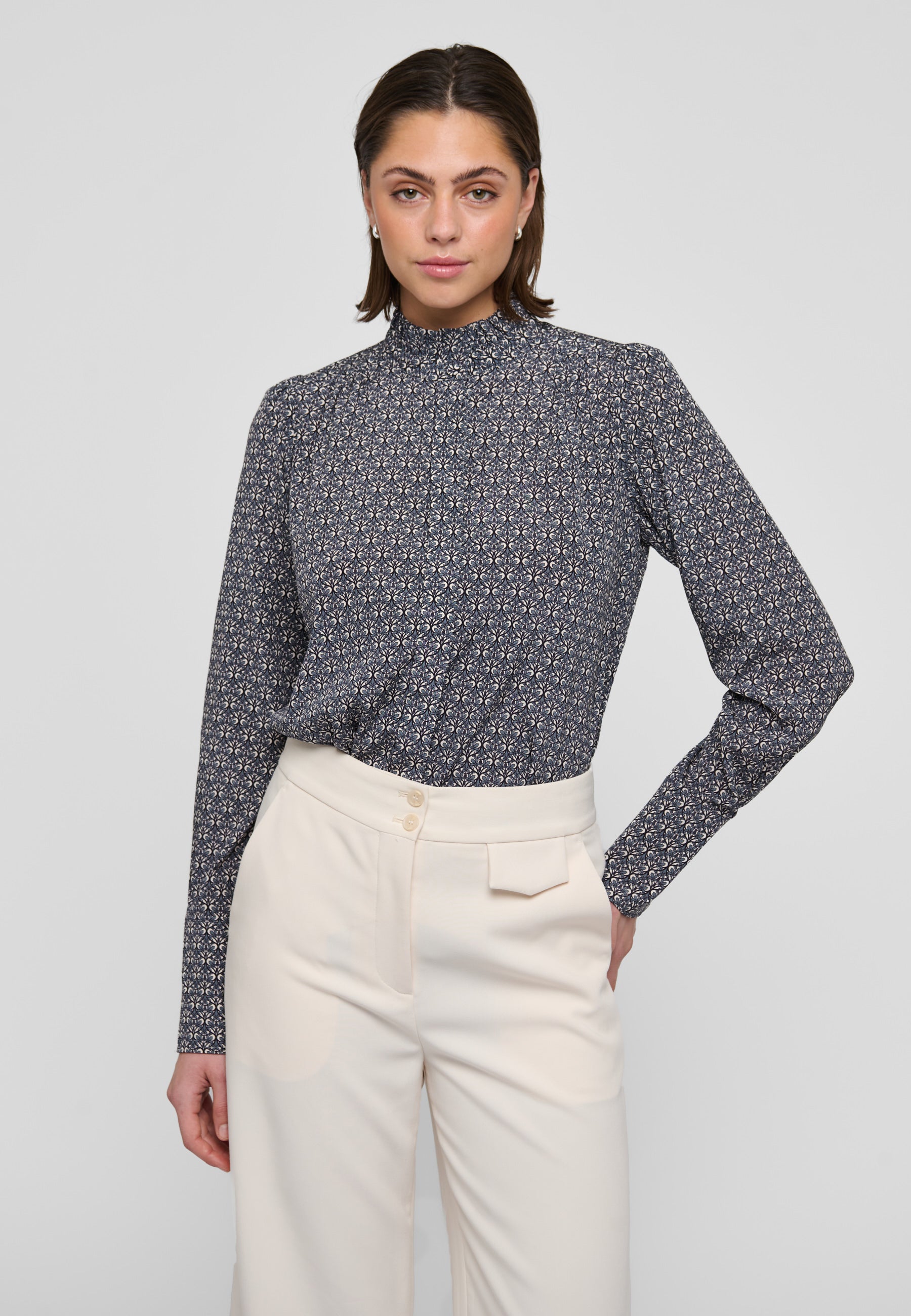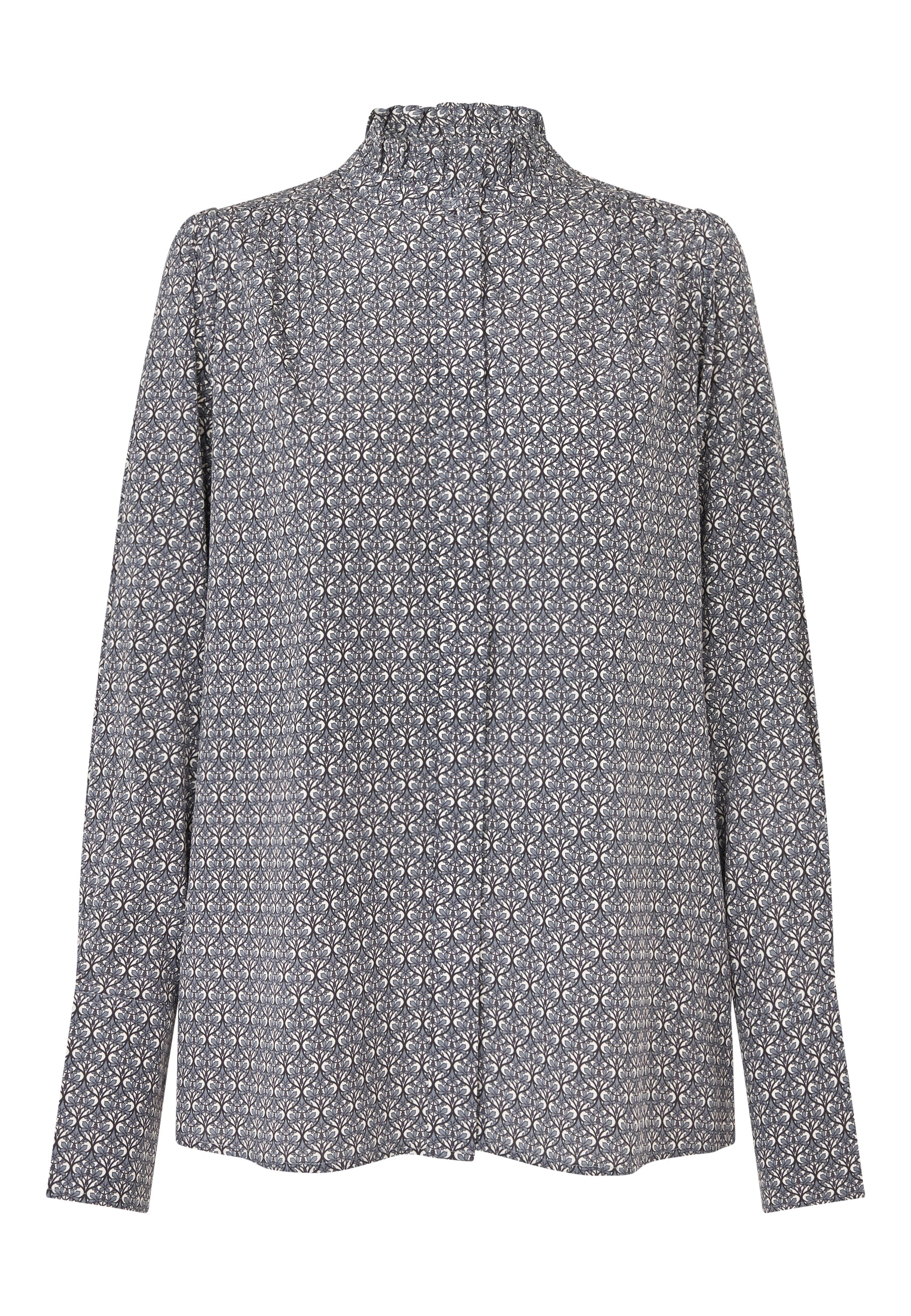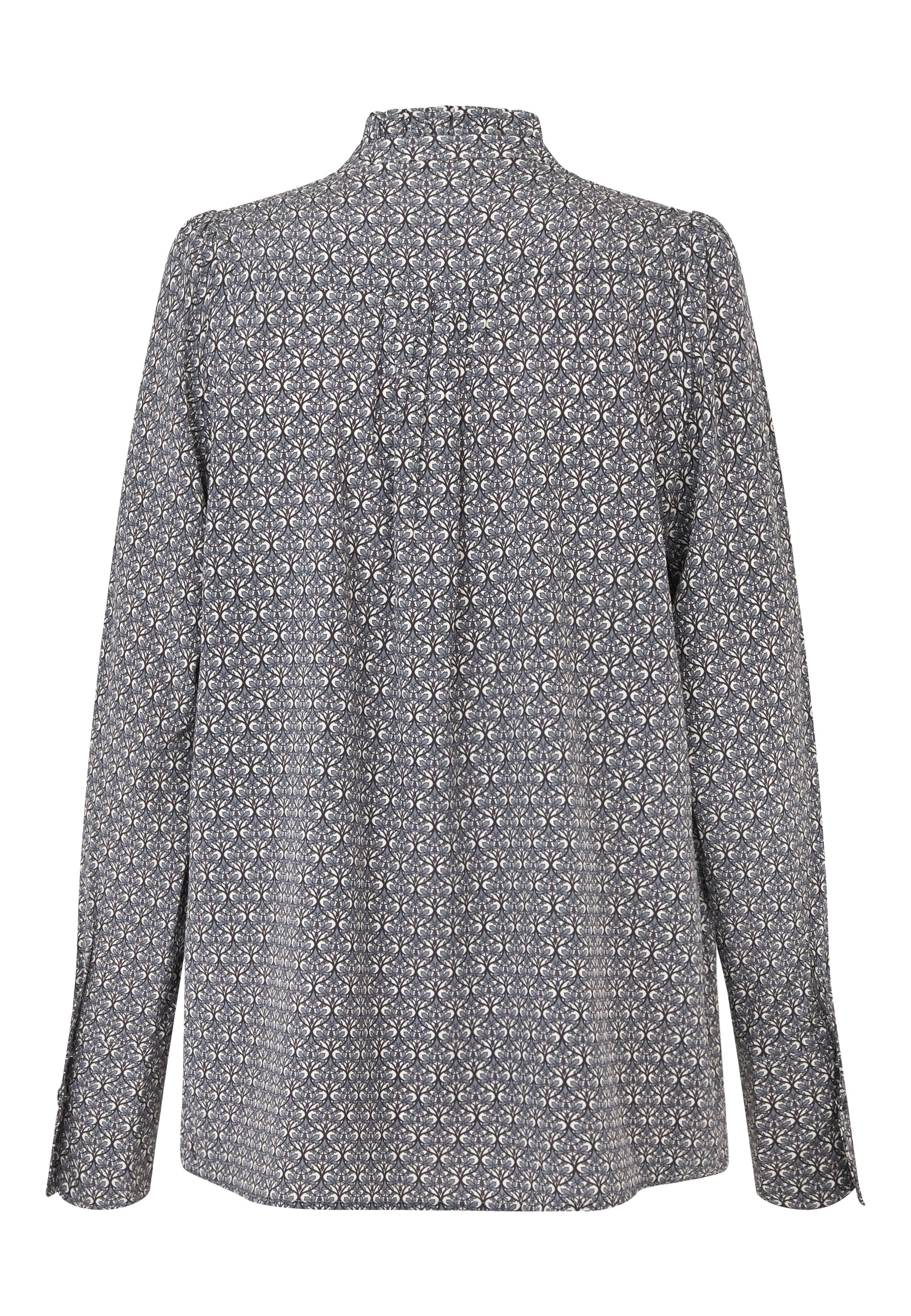 Skøn silkeskjorte i feminint gråt/cremefarvet print. Skjorten har ærme med puf og bred manchet med buet kant, aftagelige skulderpuder, skjultknaplukning og smal flæse i halsen.