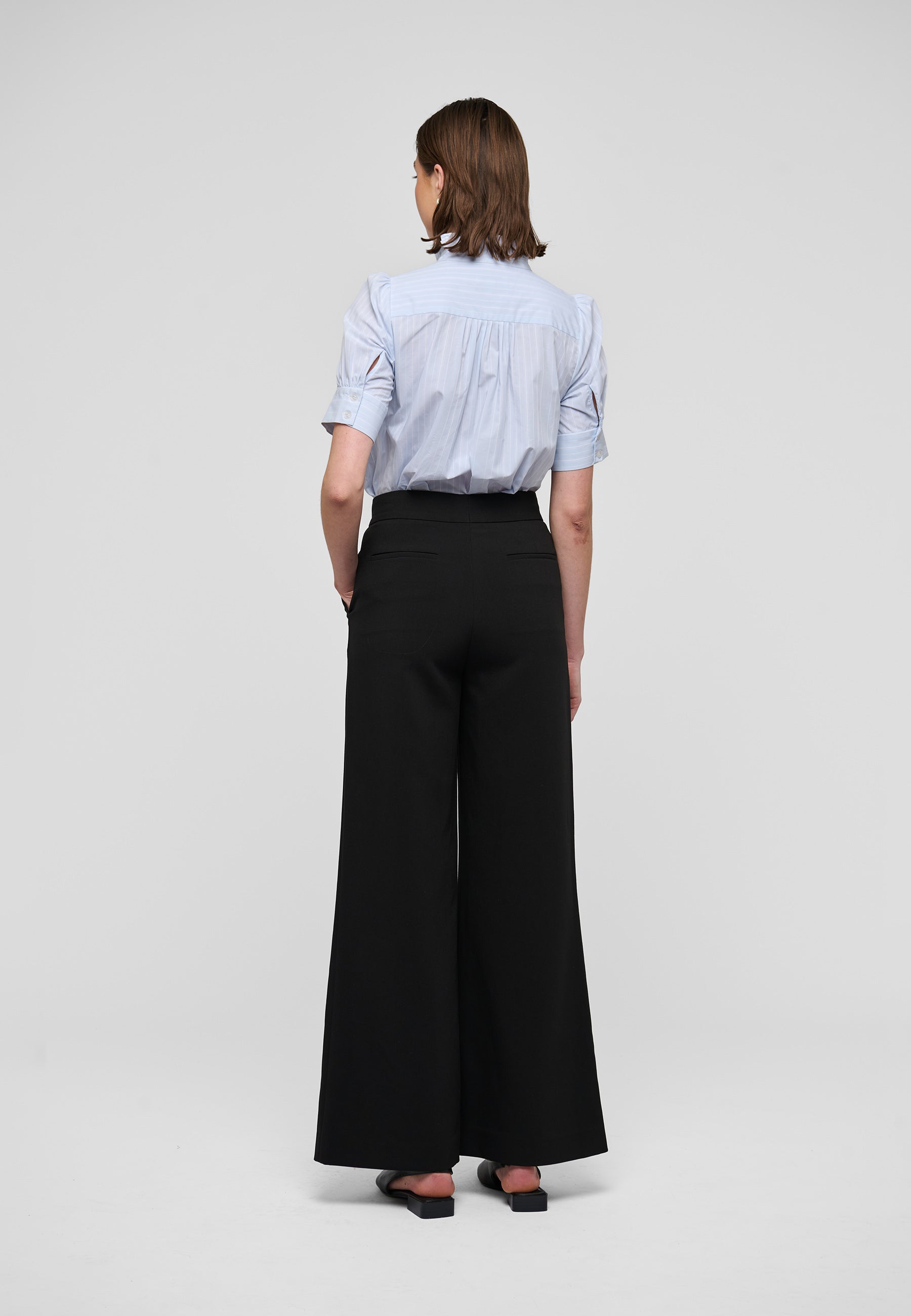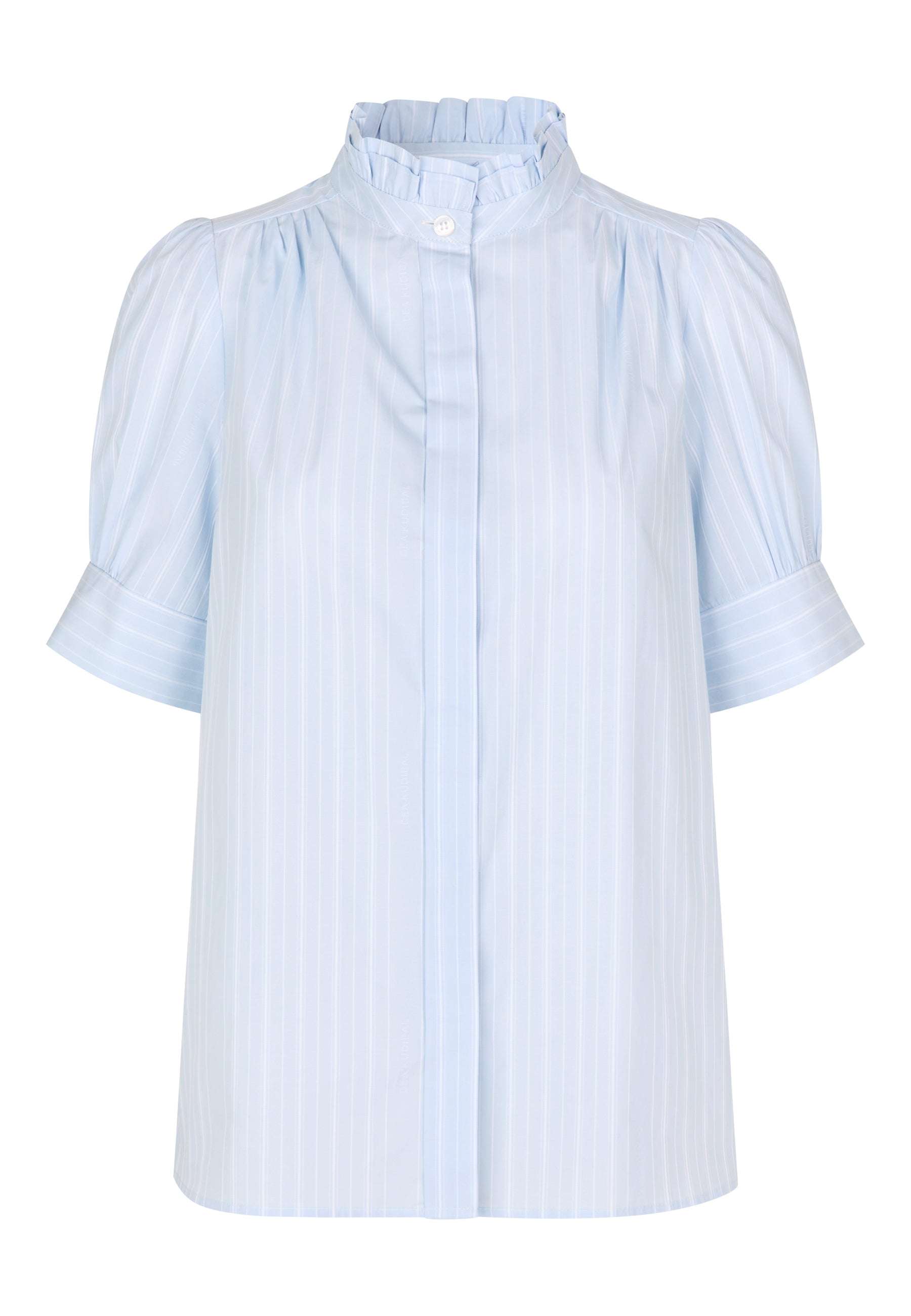 Skøn kortærmet bomuldsskjorte med flæse/kinakrave, har kort ærme med puf og en løs manchet som lukkes med små betrukne knapper. Skjorten er i en klassisk lyseblå farve med broderede hvide striber.