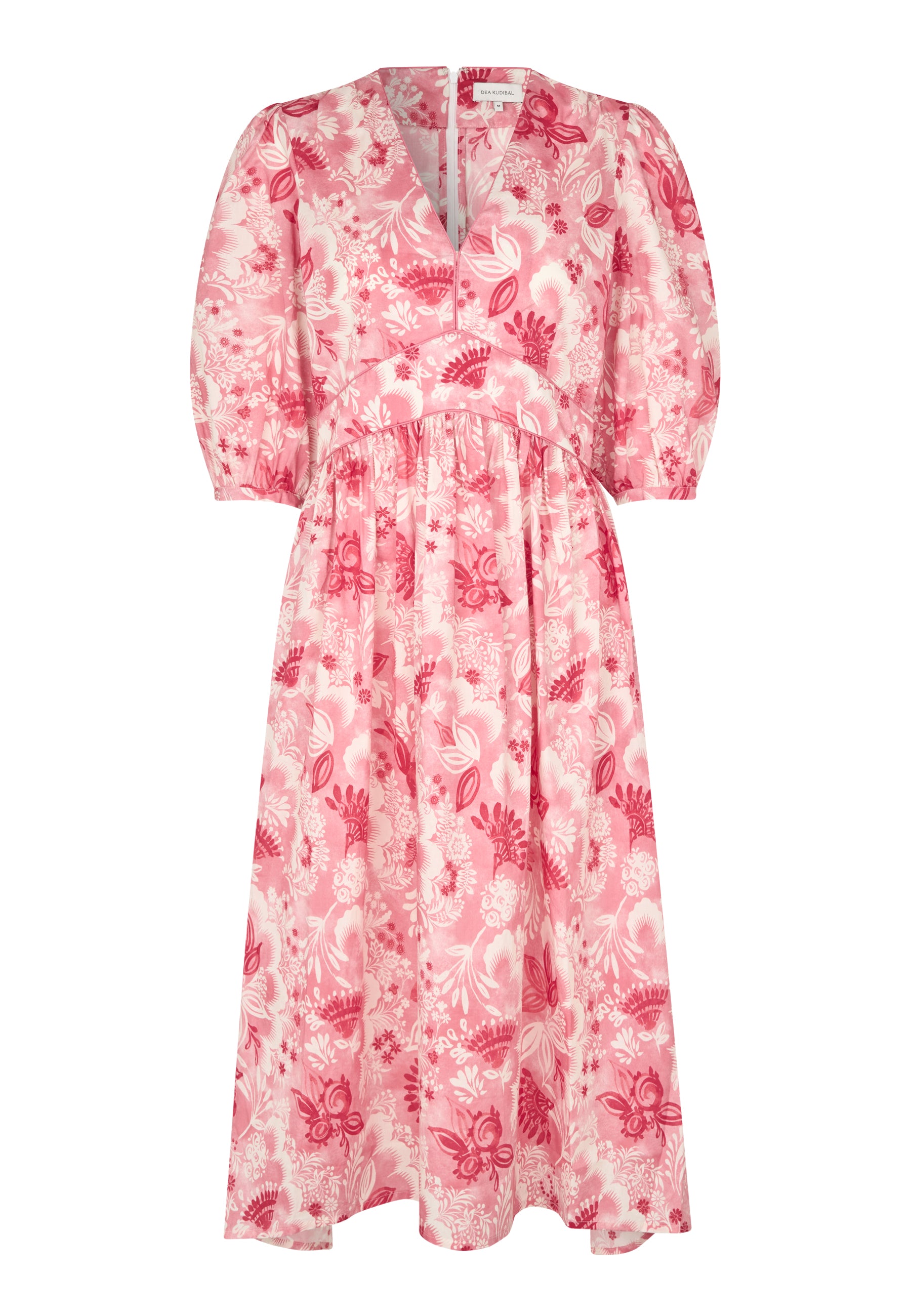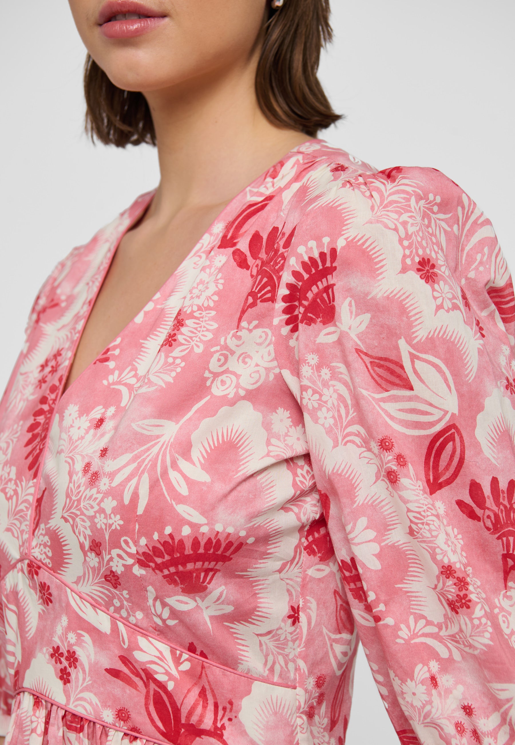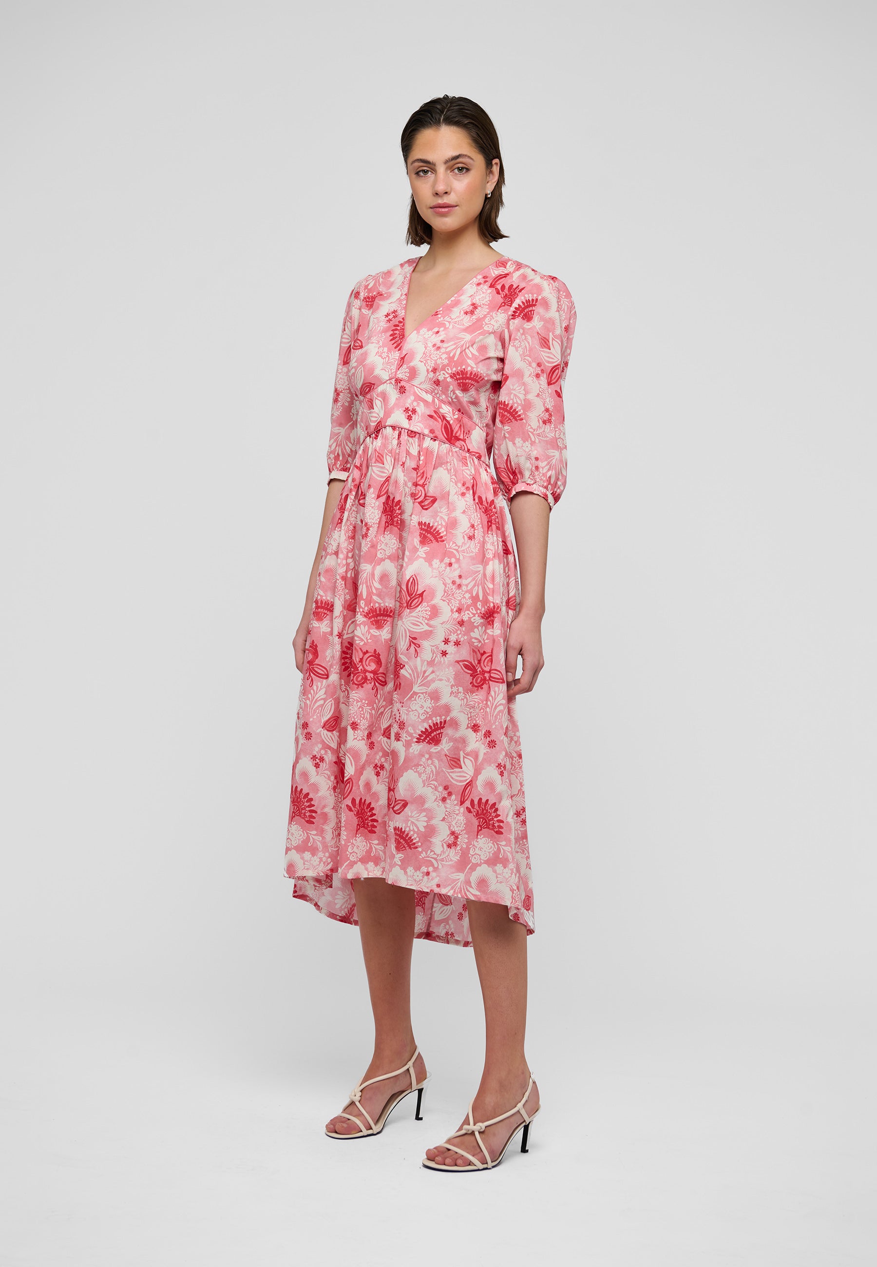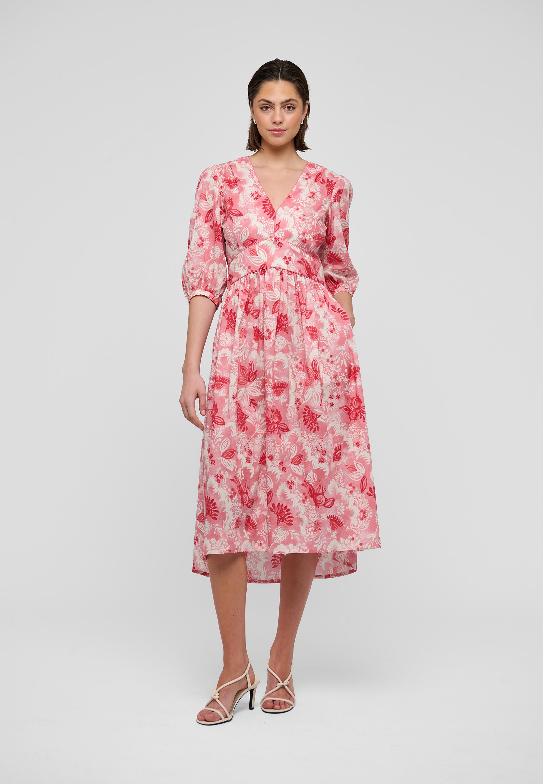Feminin bomuldskjole i et skønt blomsterprint i røde nuancer og cremehvid. Kjolen har empireoverskæring som skråner mod taljen, v-udskæring, med piping detalje, lommer og 3/4 lange pufærmer.