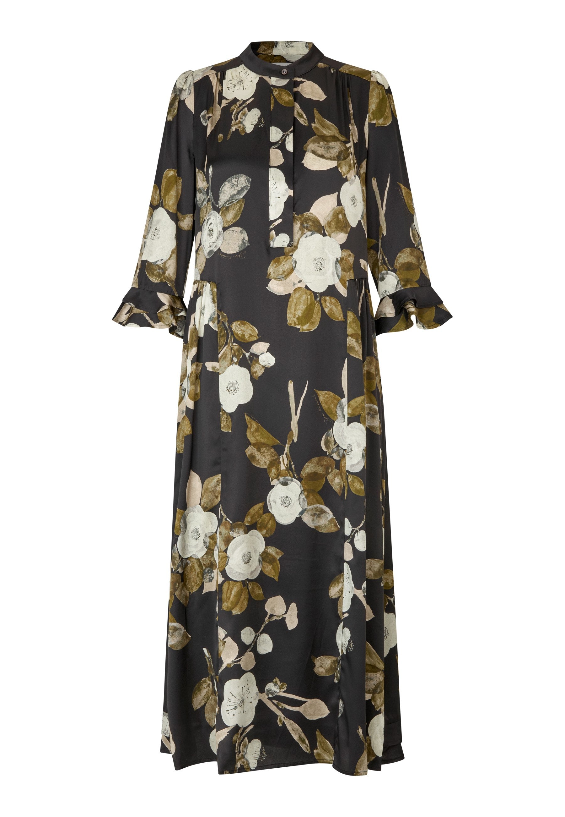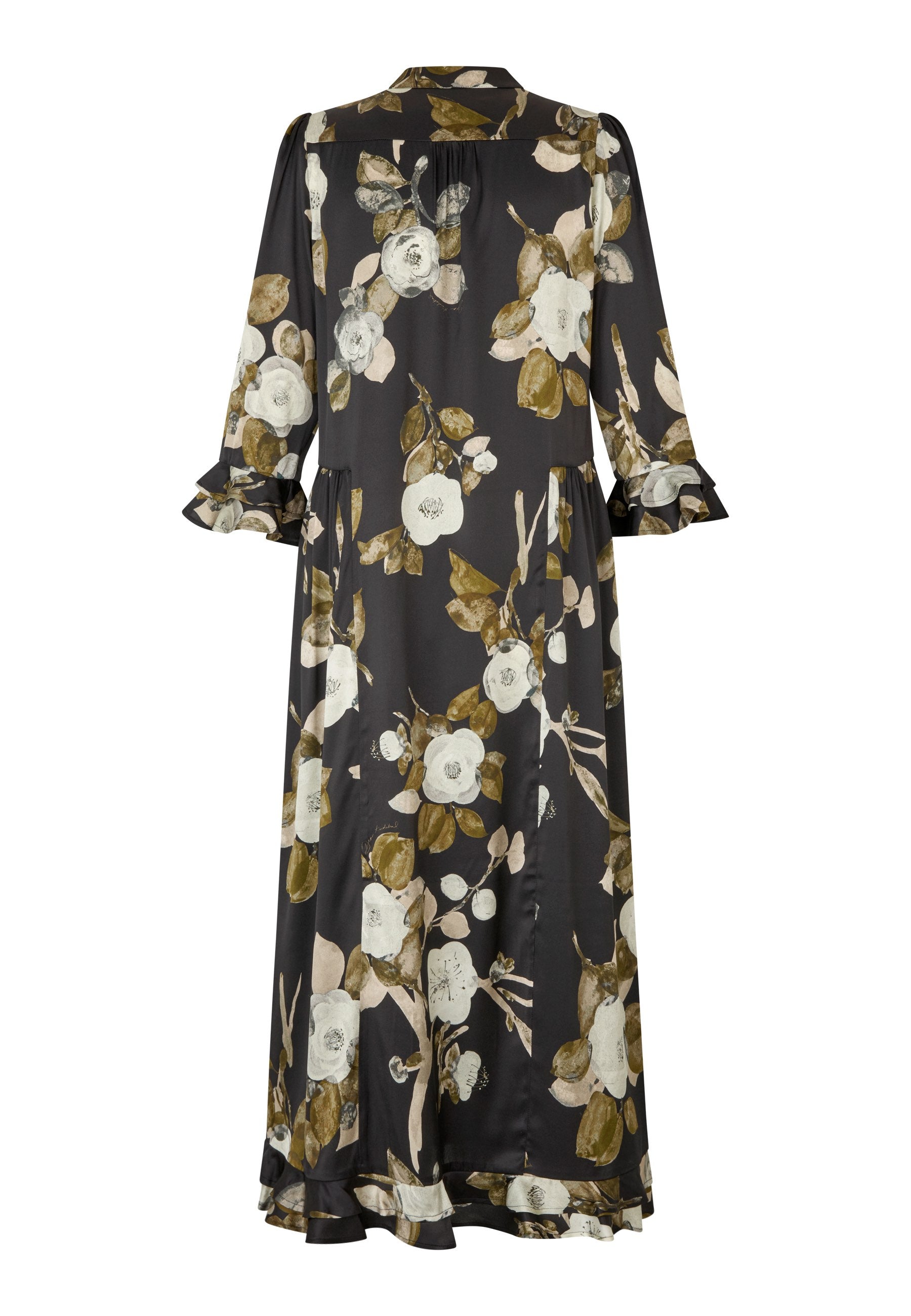 Skøn Lang viscosekjole i et poetisk print bestående af gyldne og cremefarvede blade på sort bund. Kjolen har rund hals med stolpelukning, 3/4 ærmer med dobbelt flæsemanchet, og indsnit på hoften som giver den et smuk facon. Nederste har den en flæsekant på bagstykket.